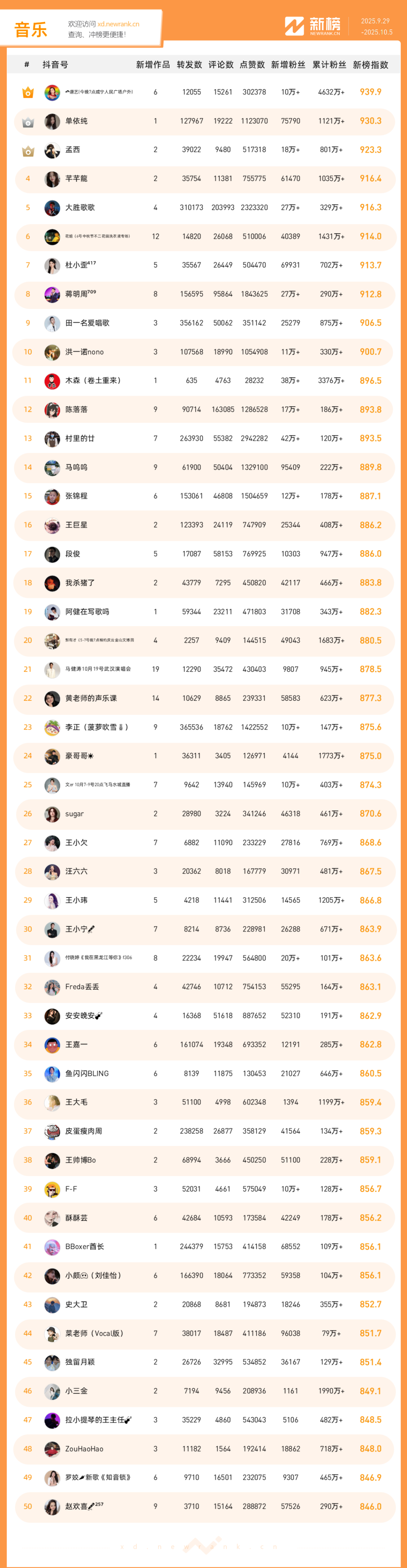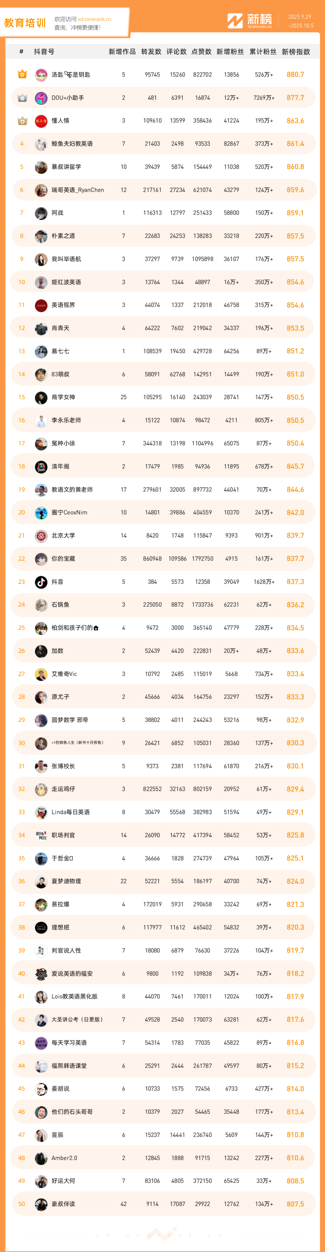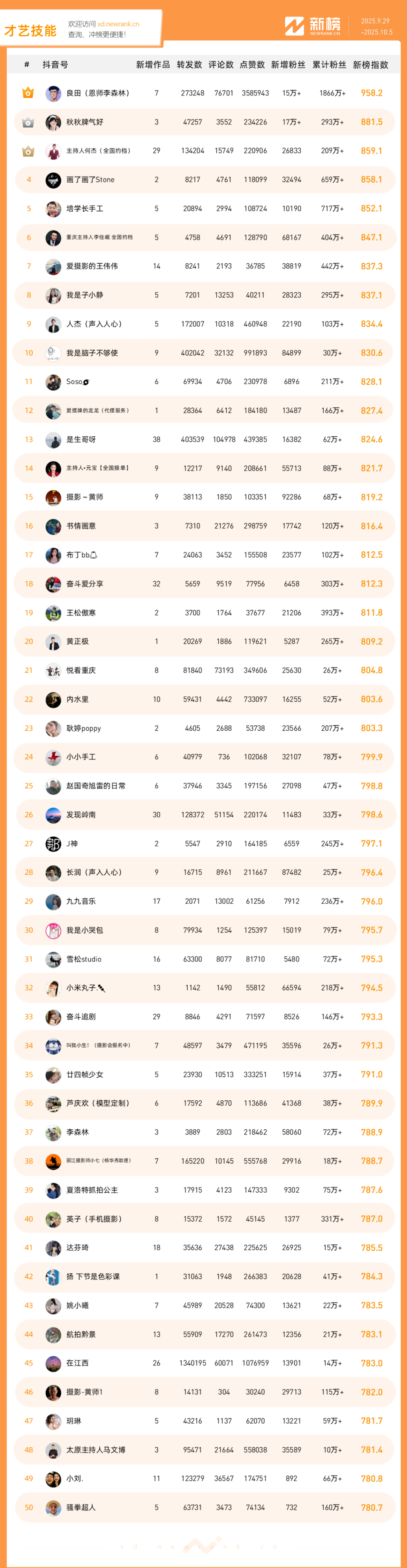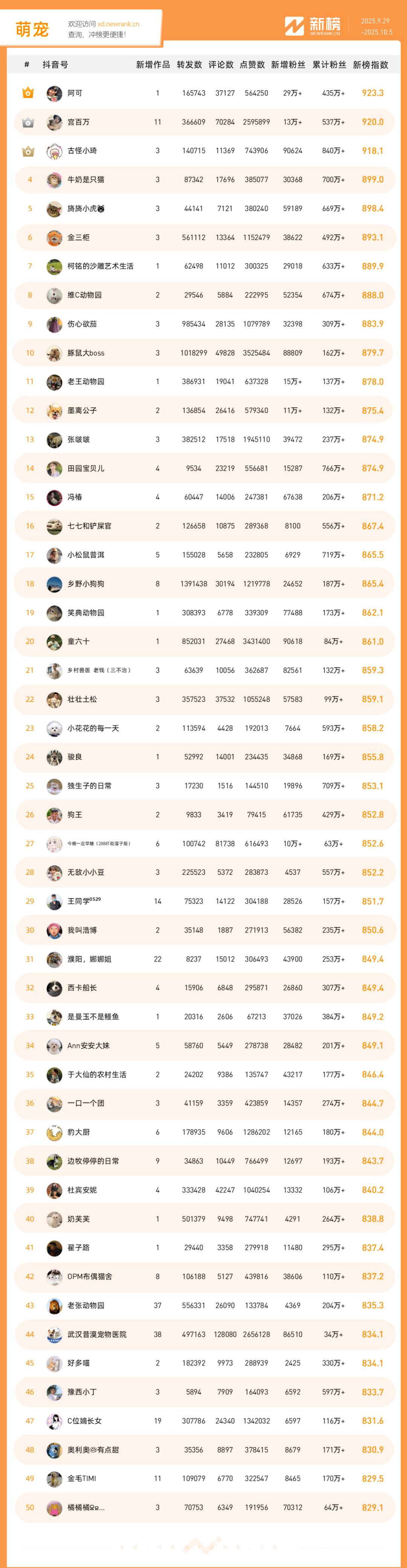 「抖音影响力排行榜」由新榜独家发布,每周一期,本期统计周期为2025年9月29日-2025年10月5日。