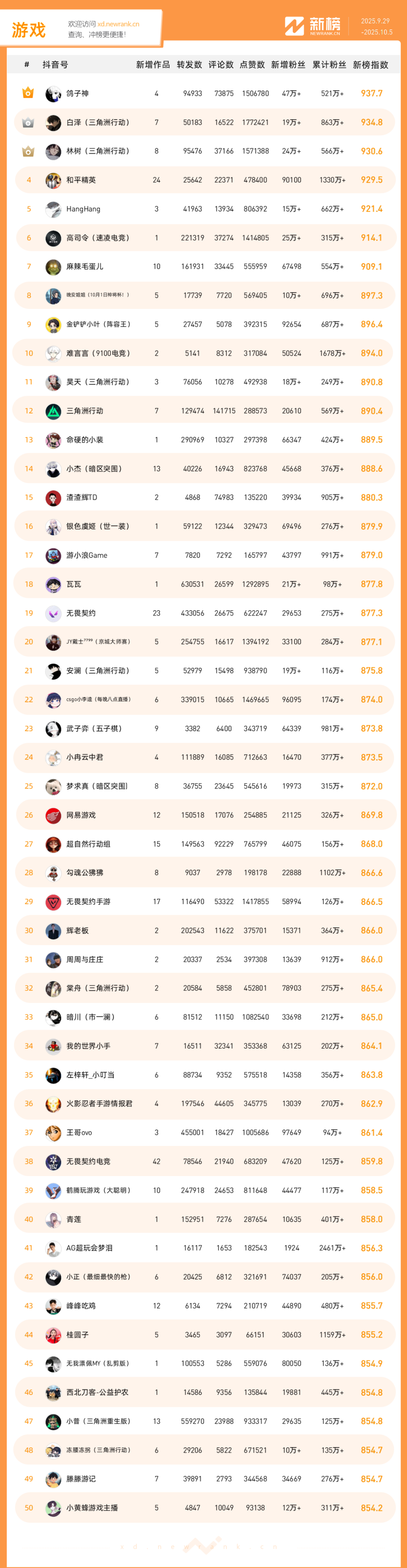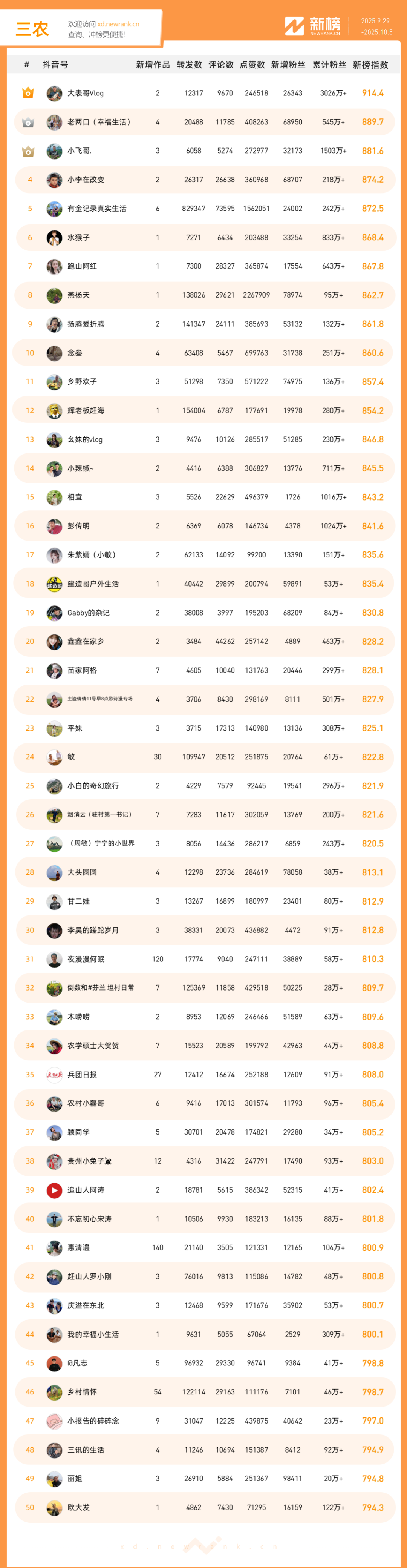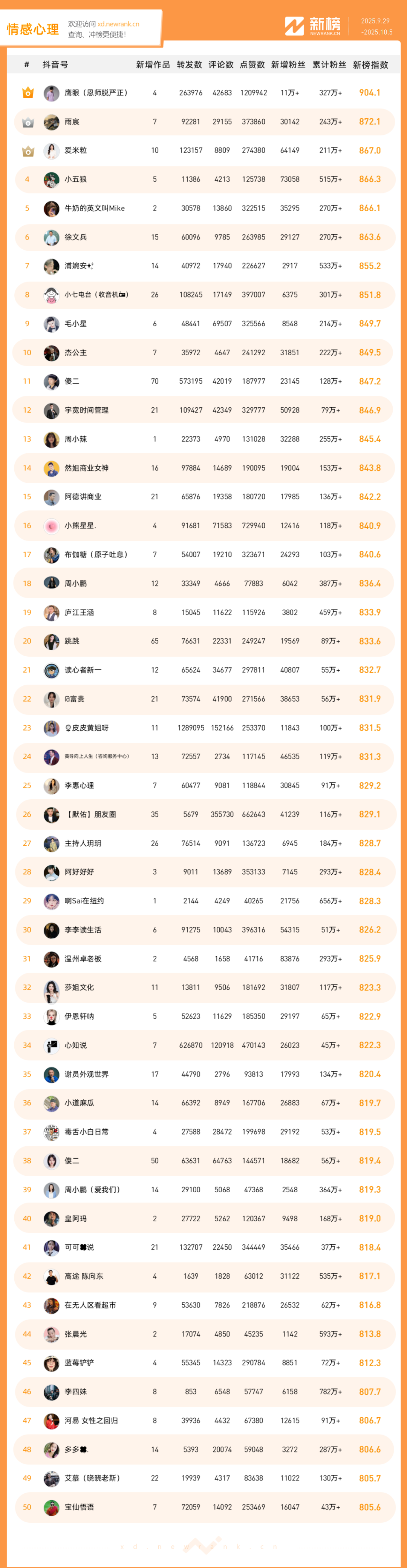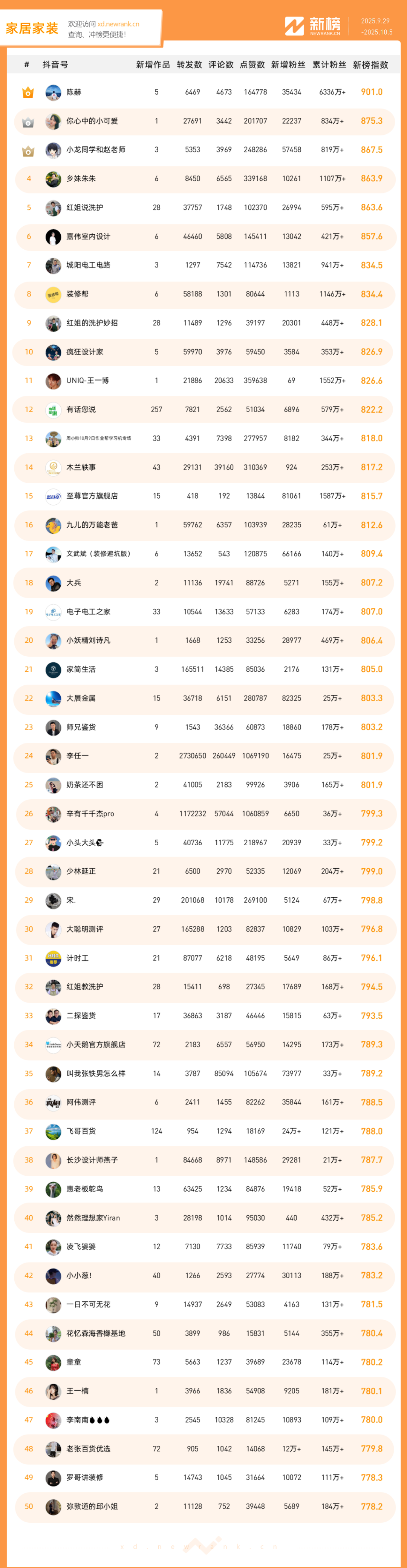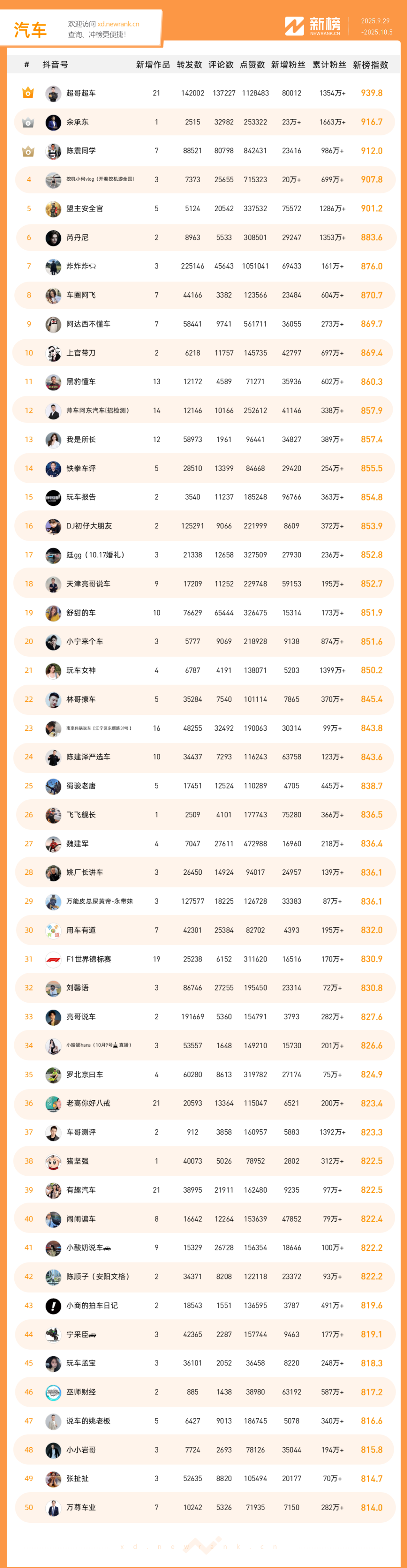 「抖音影响力排行榜」由新榜独家发布,每周一期,本期统计周期为2025年9月29日-2025年10月5日。