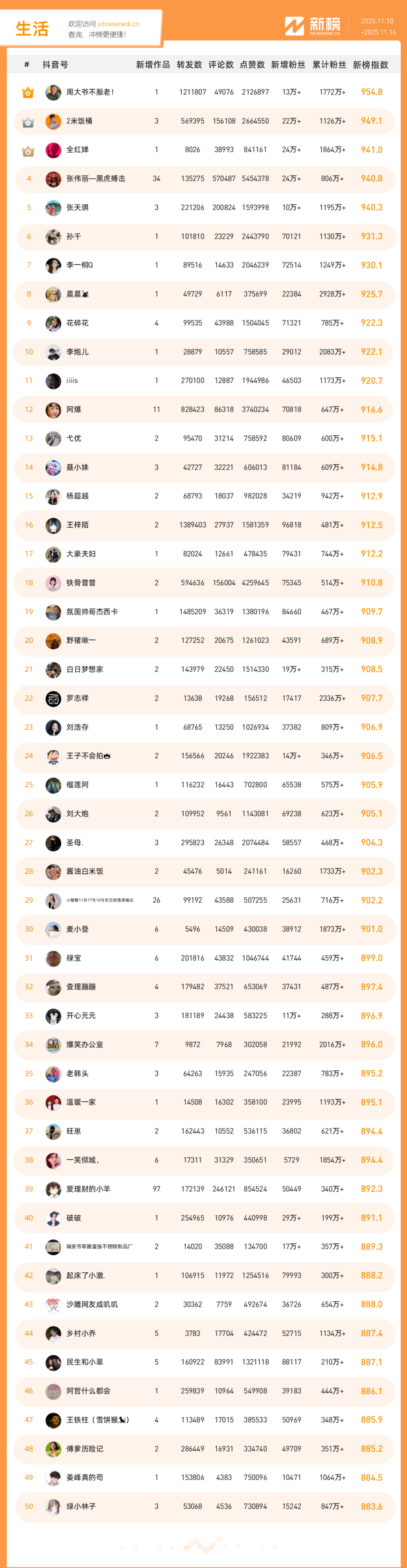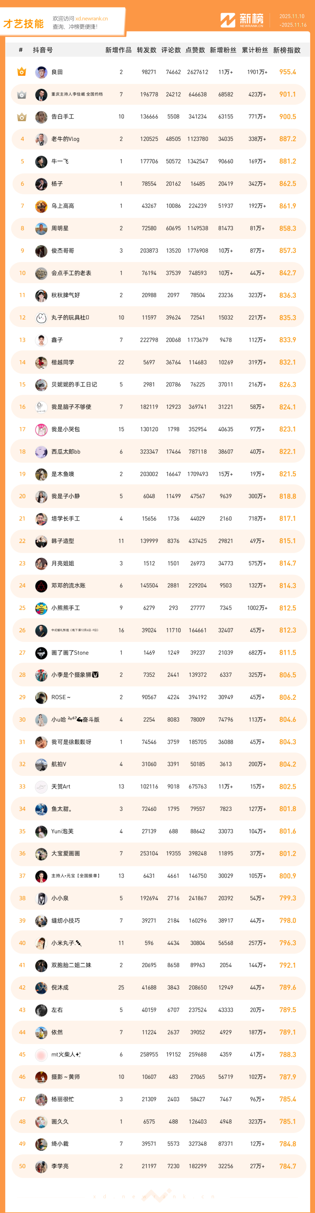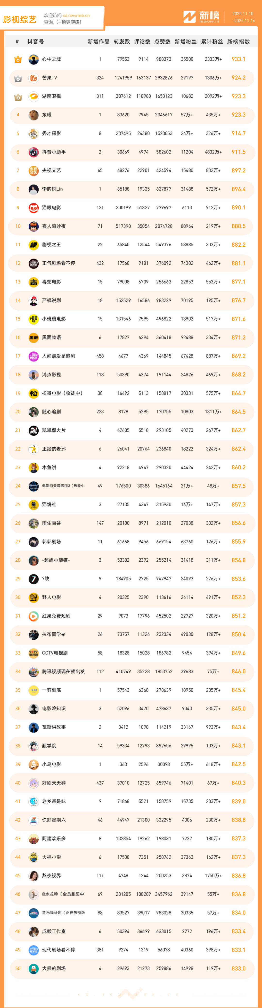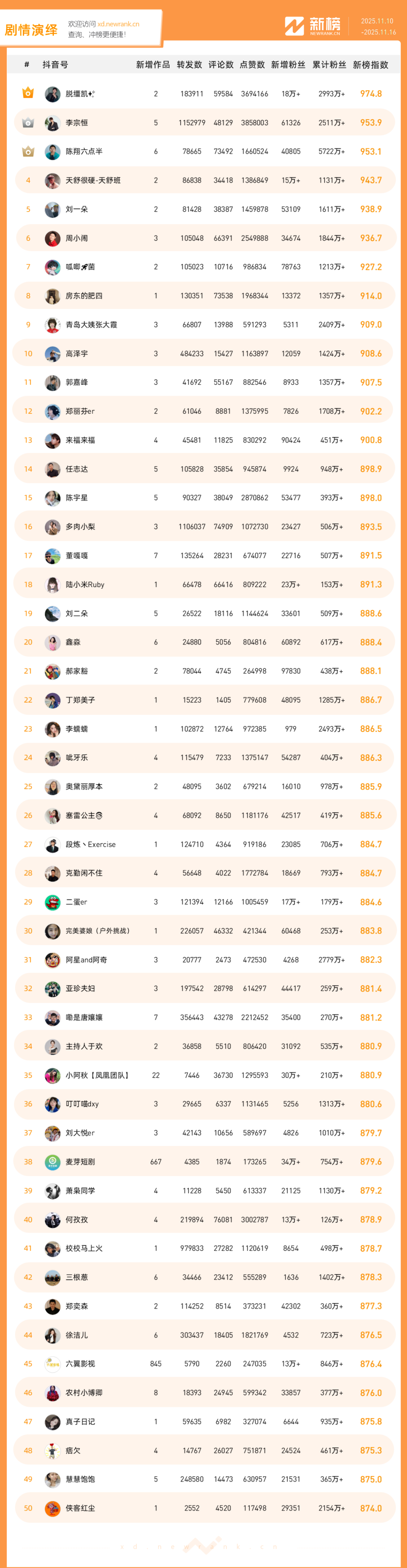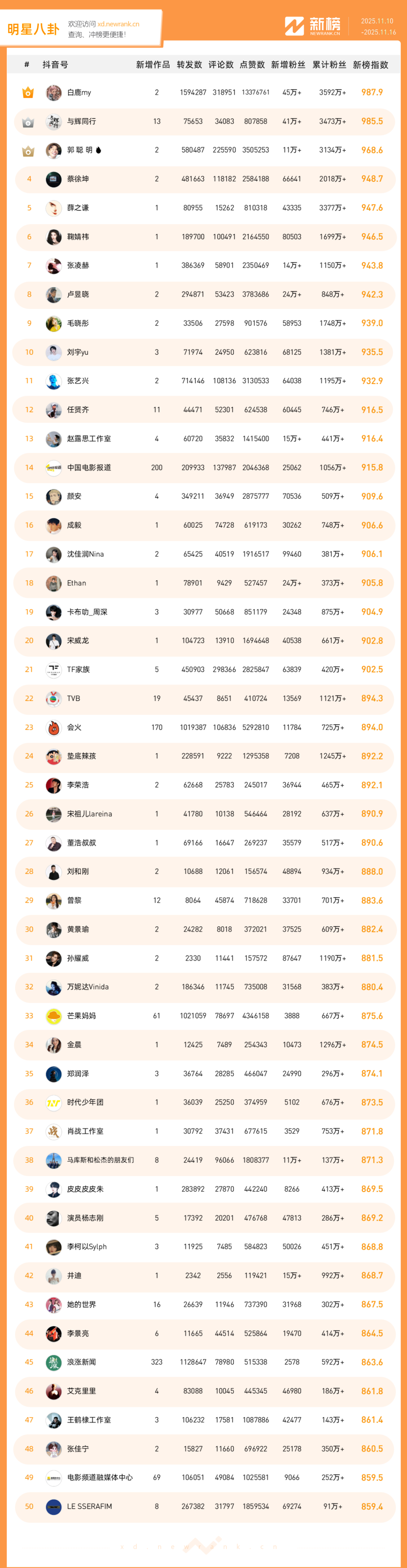 「抖音影响力排行榜」由新榜独家发布,每周一期,本期统计周期为2025年11月10日-2025年11月16日。