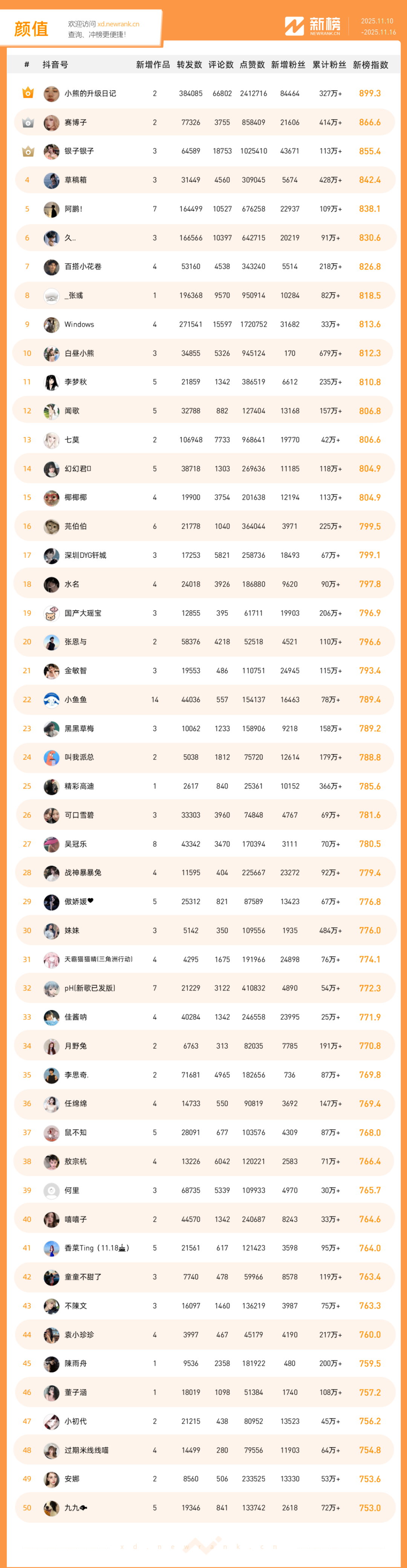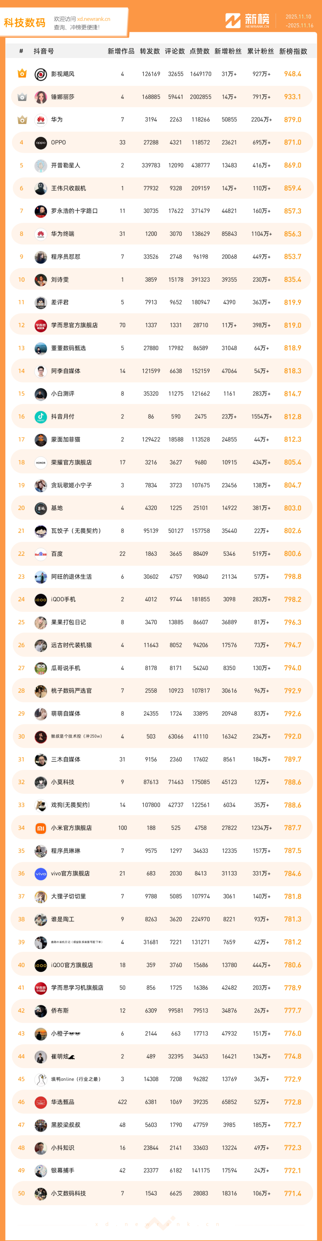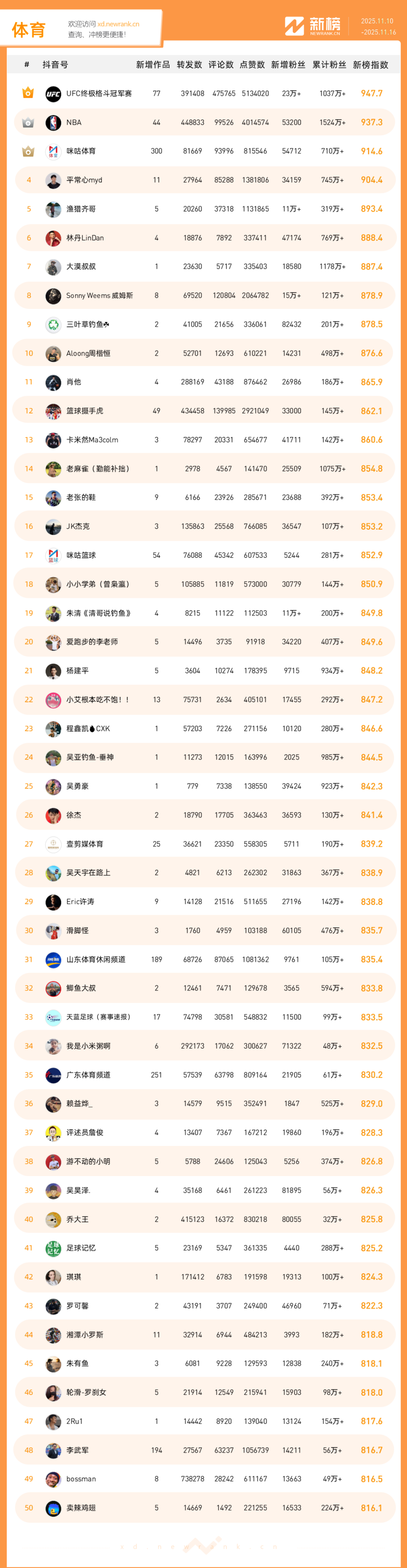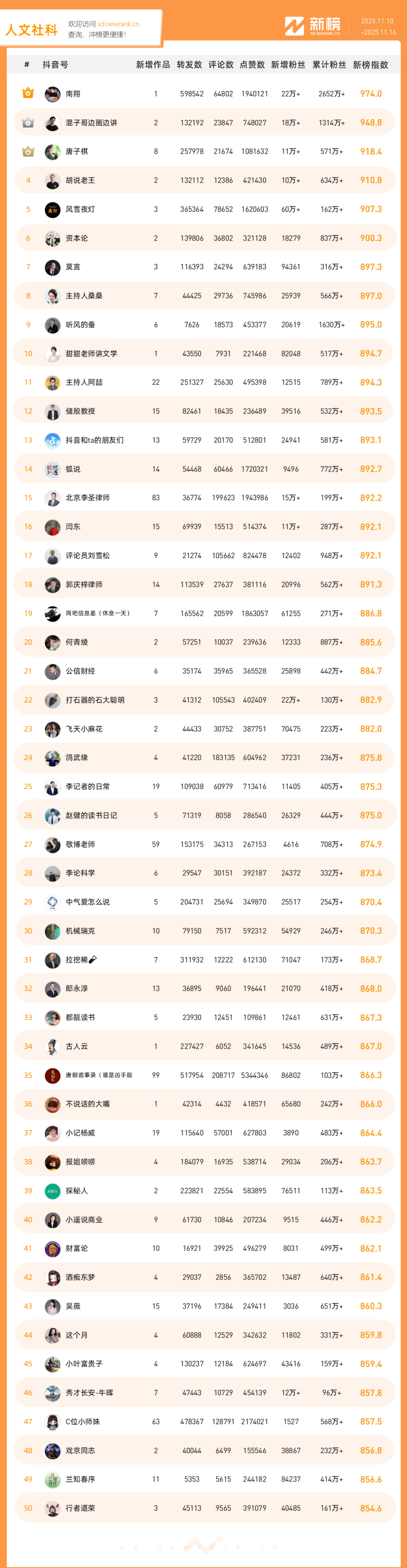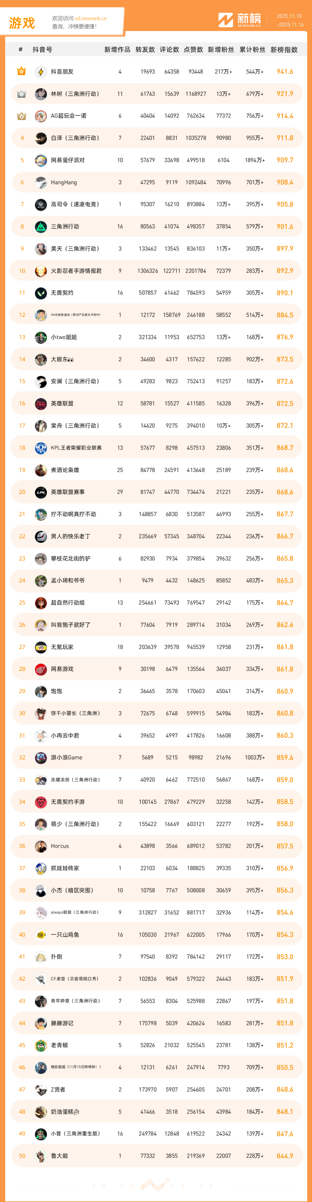 「抖音影响力排行榜」由新榜独家发布,每周一期,本期统计周期为2025年11月10日-2025年11月16日。