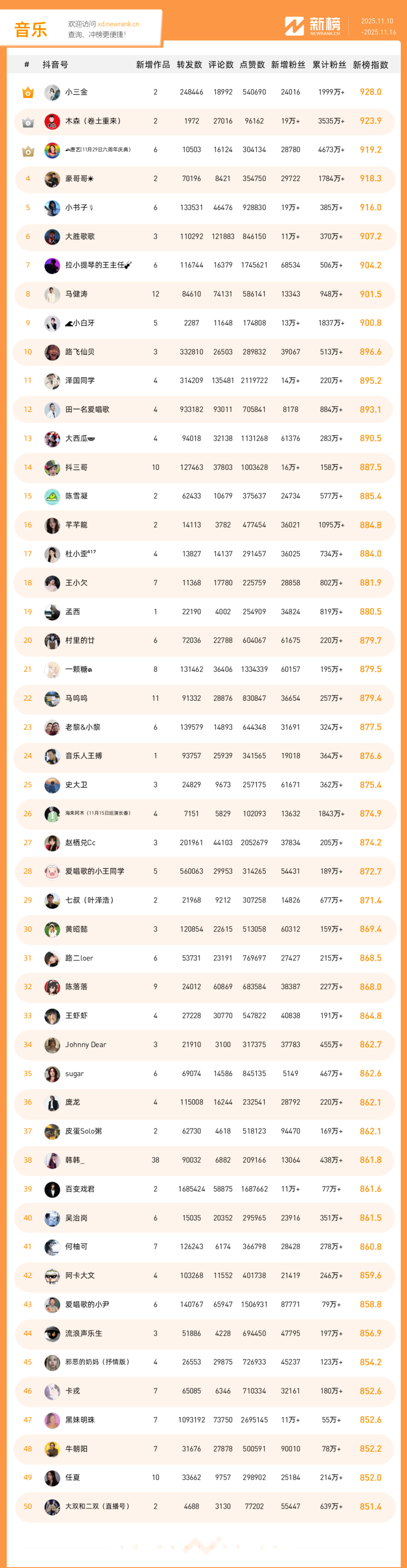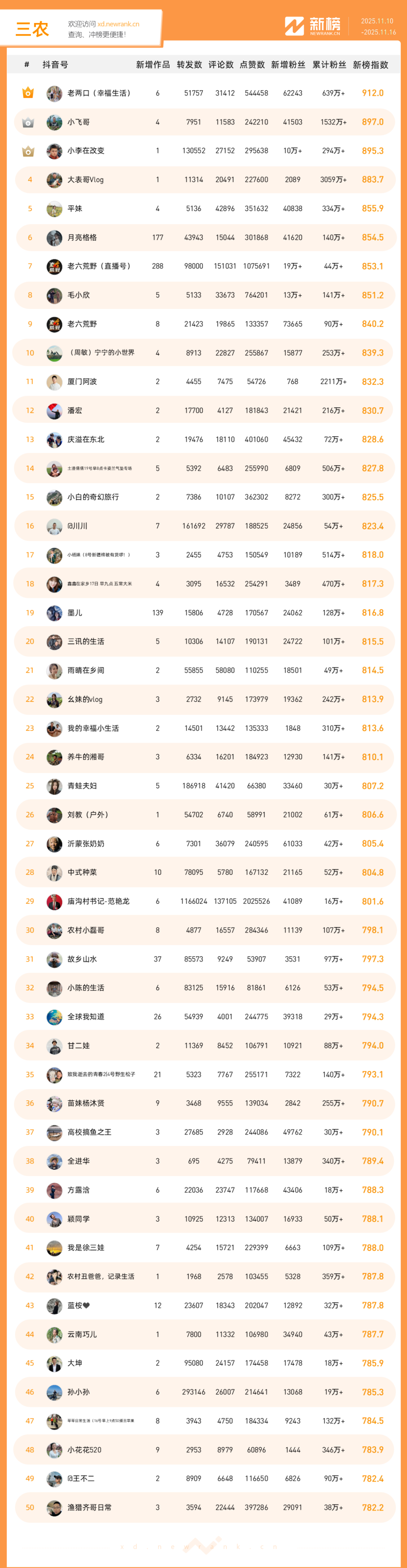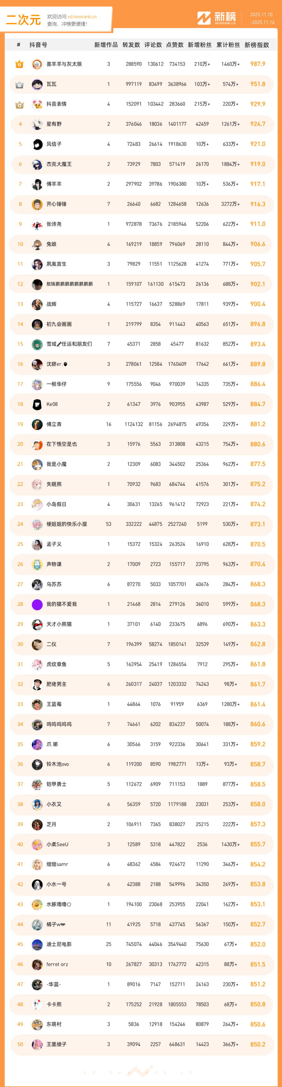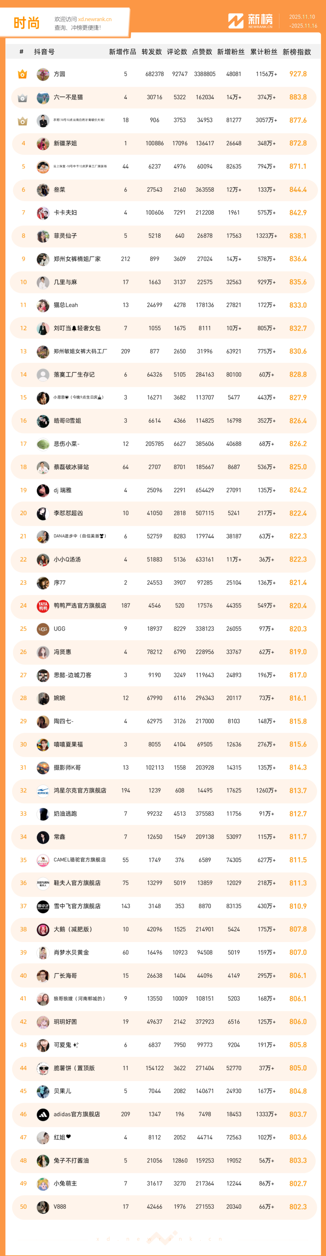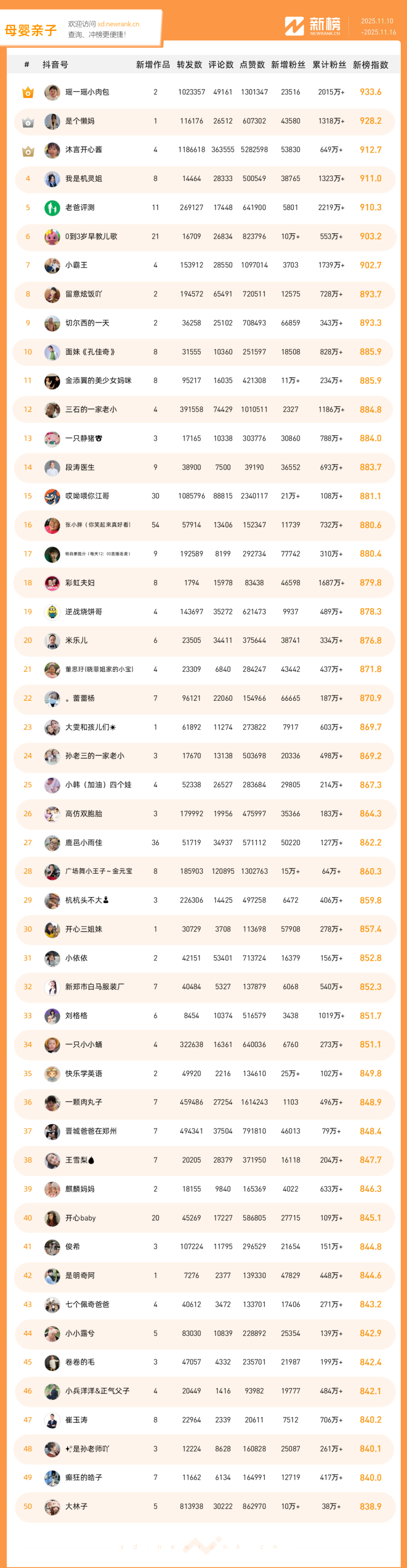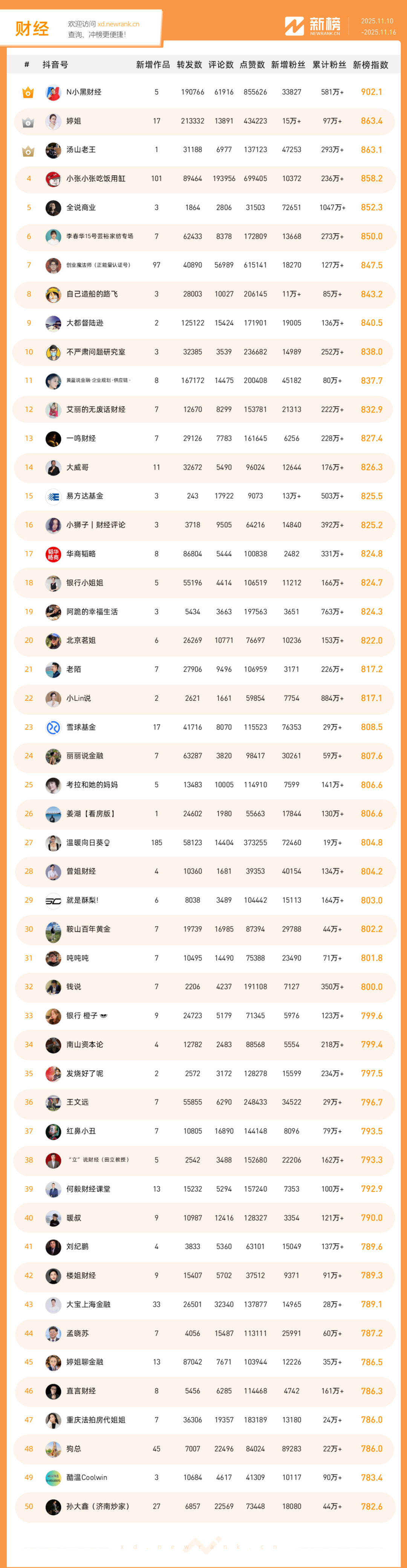 「抖音影响力排行榜」由新榜独家发布,每周一期,本期统计周期为2025年11月10日-2025年11月16日。