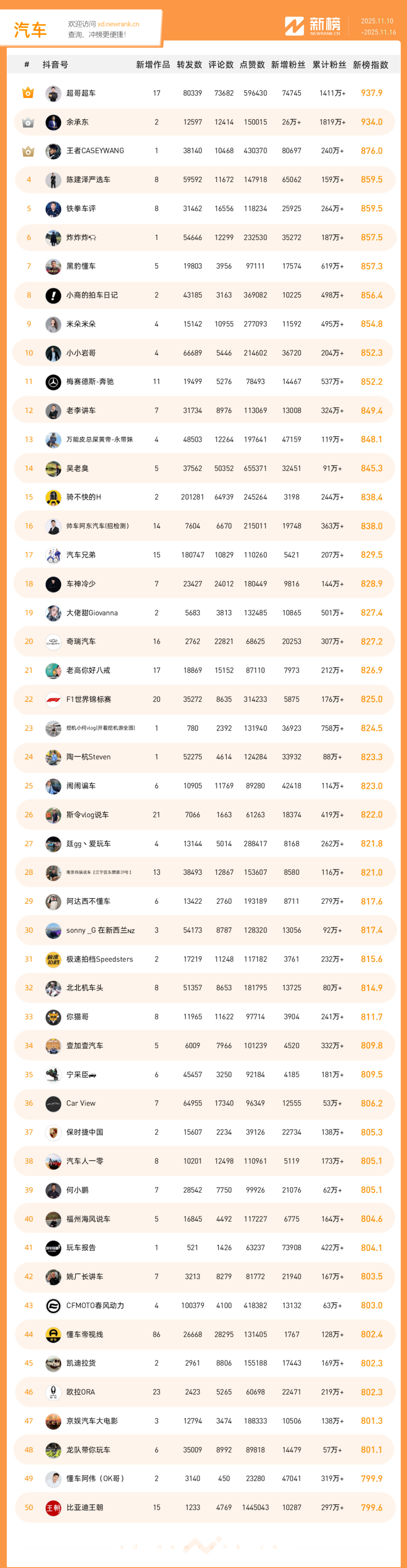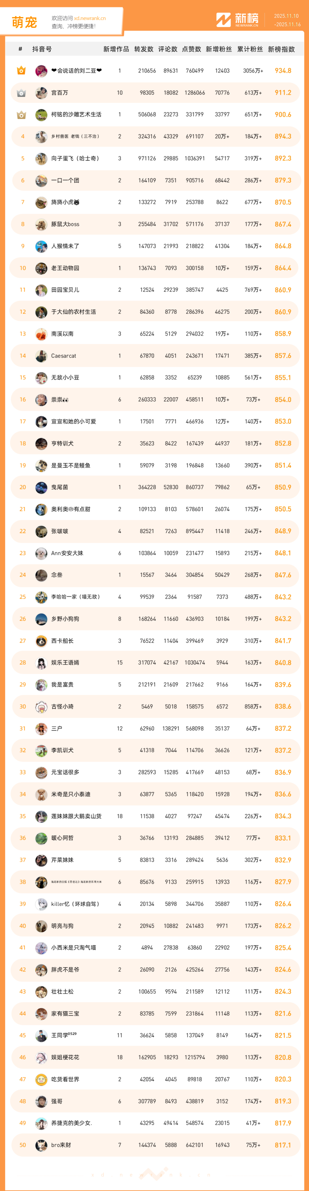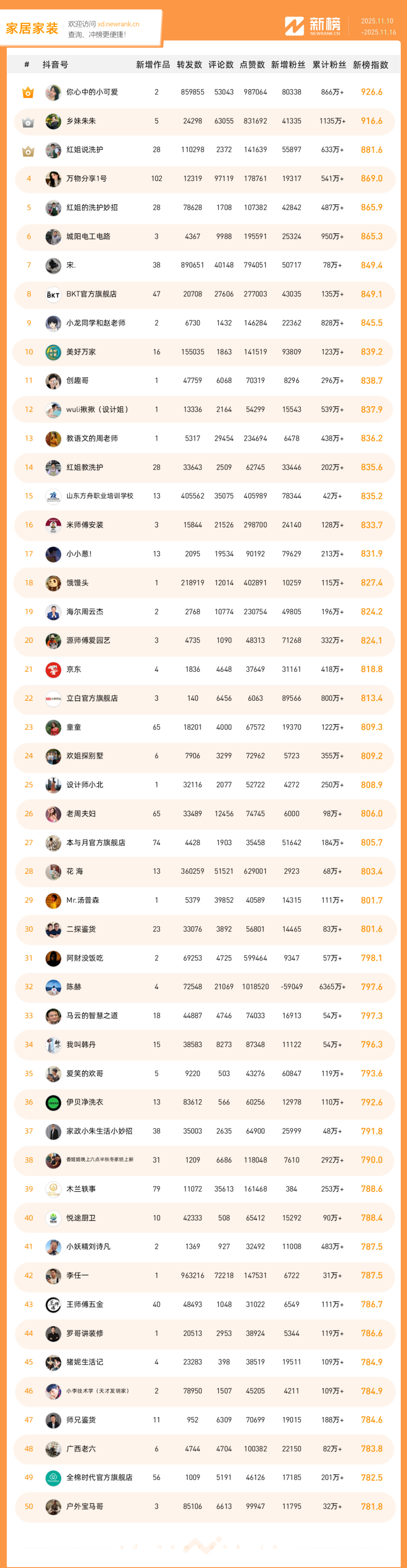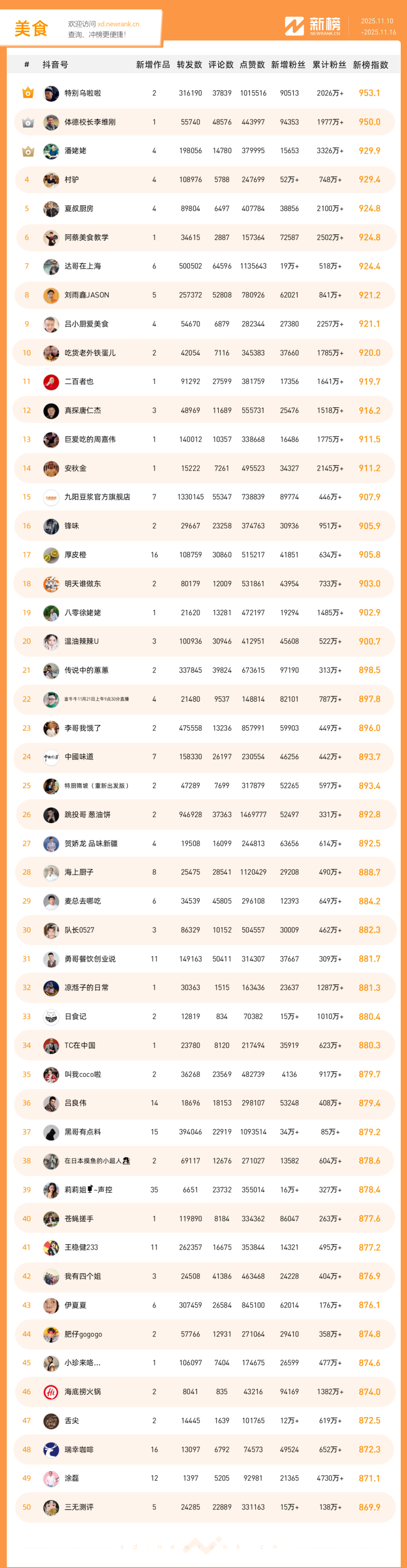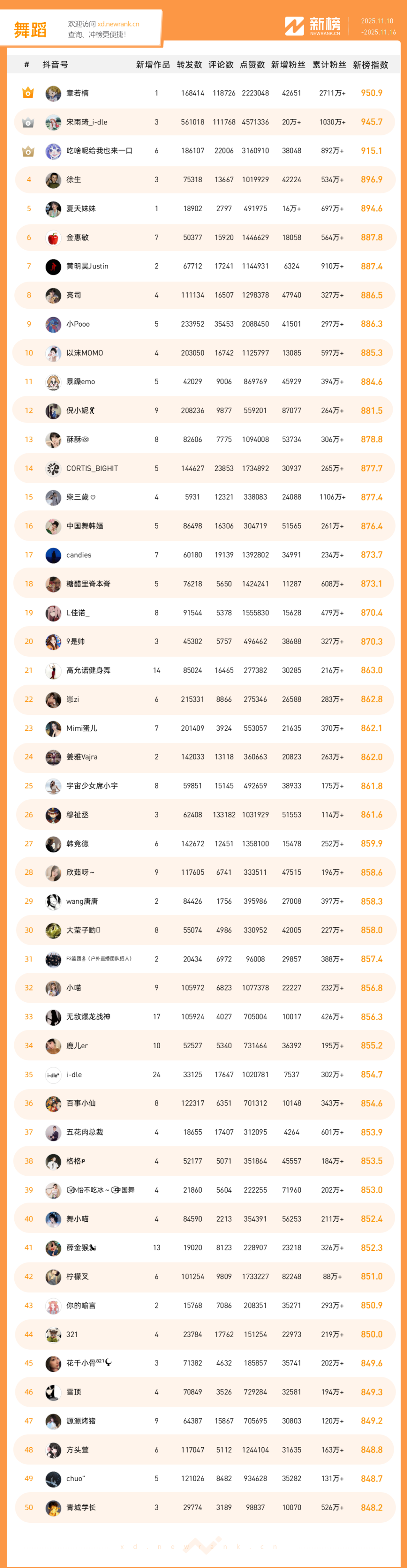「抖音影响力排行榜」由新榜独家发布,每周一期,本期统计周期为2025年11月10日-2025年11月16日。