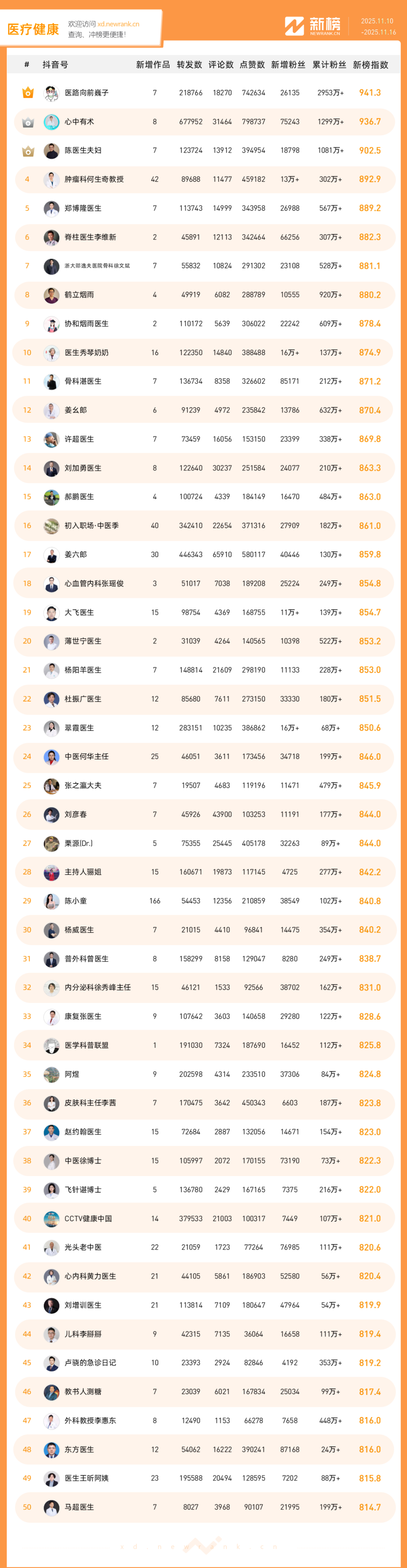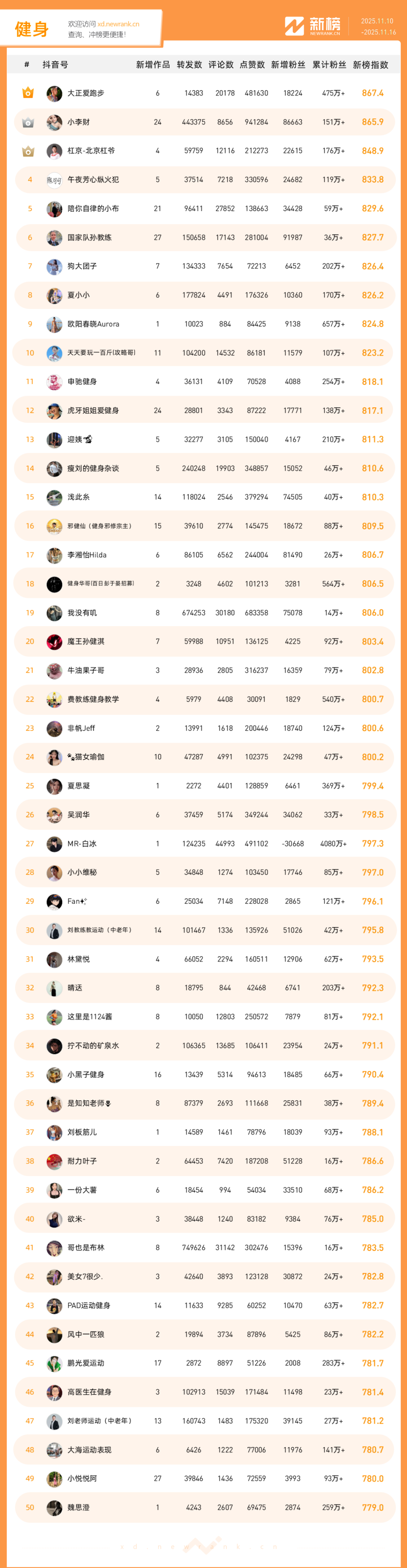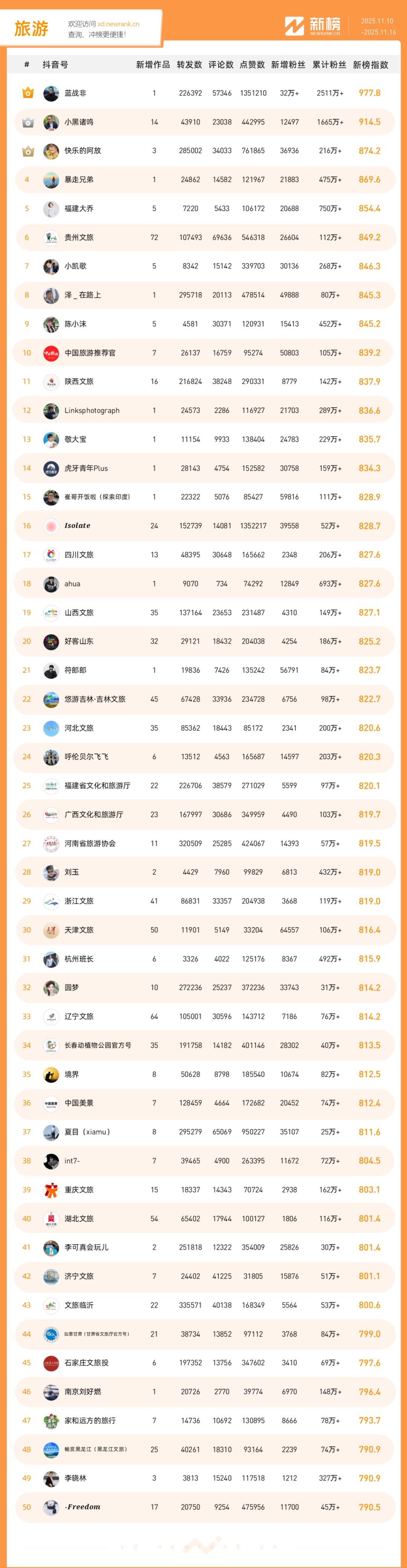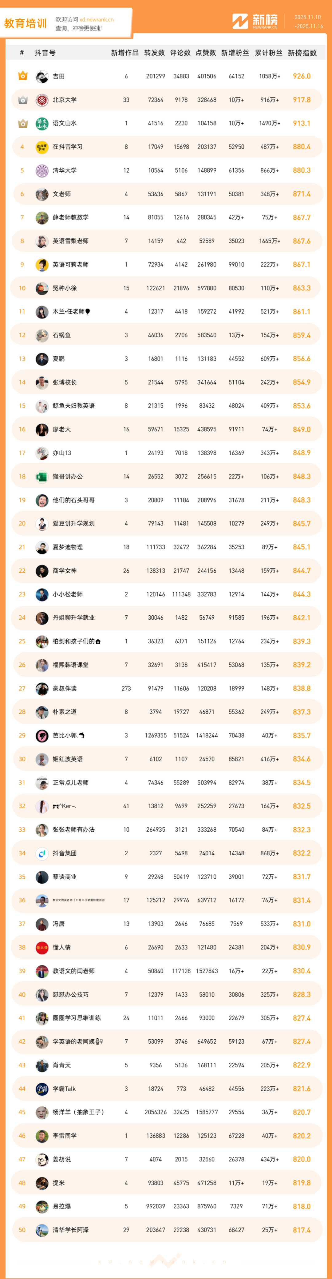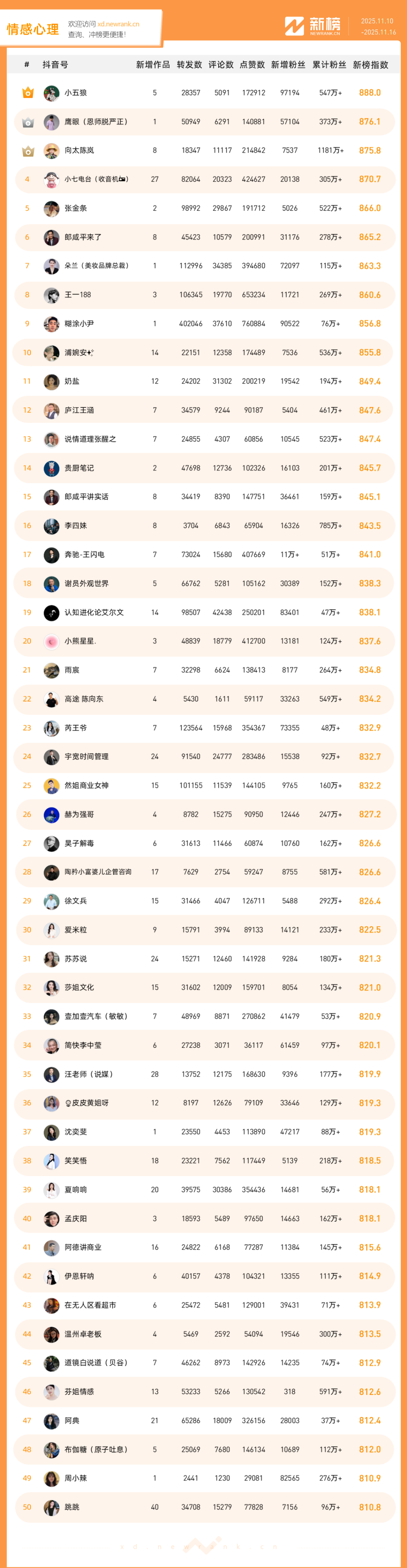 「抖音影响力排行榜」由新榜独家发布,每周一期,本期统计周期为2025年11月10日-2025年11月16日。