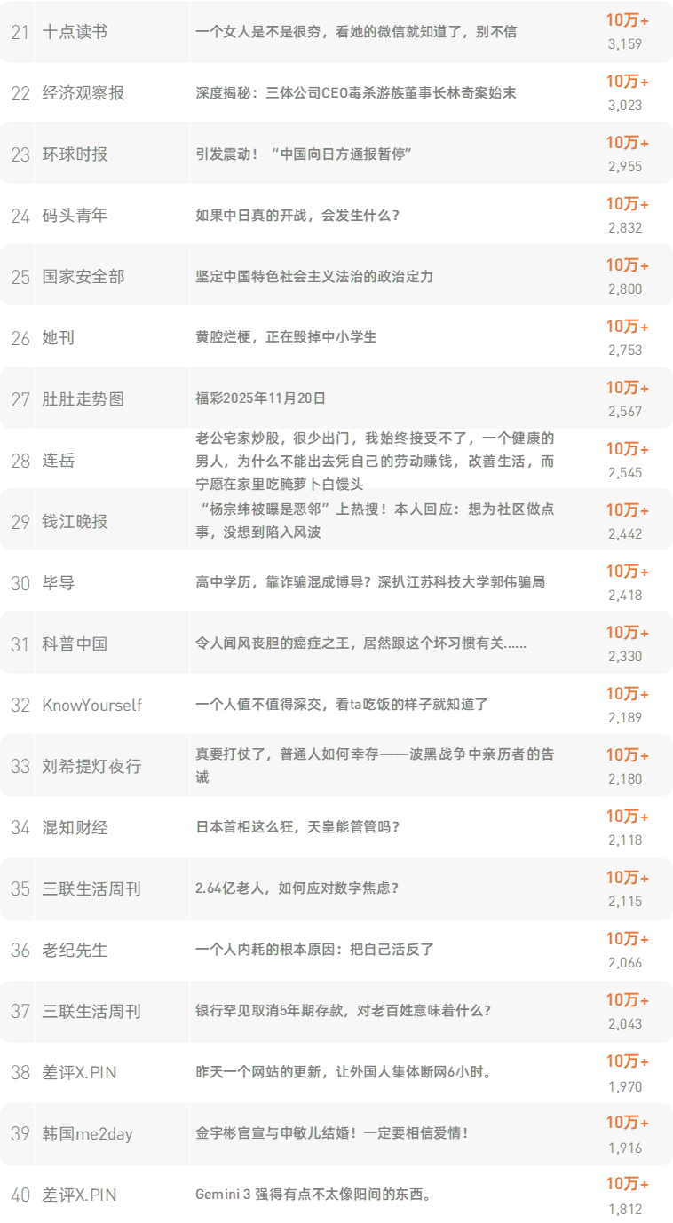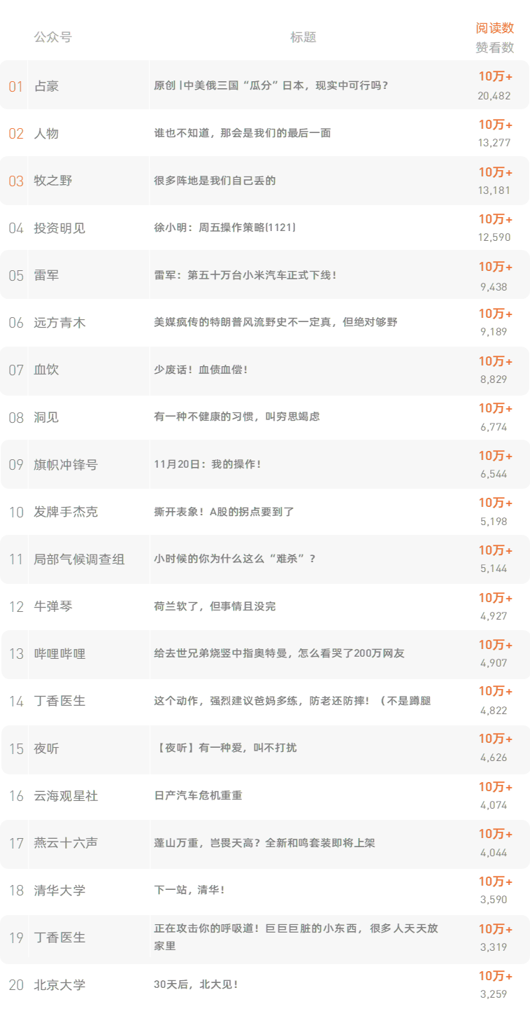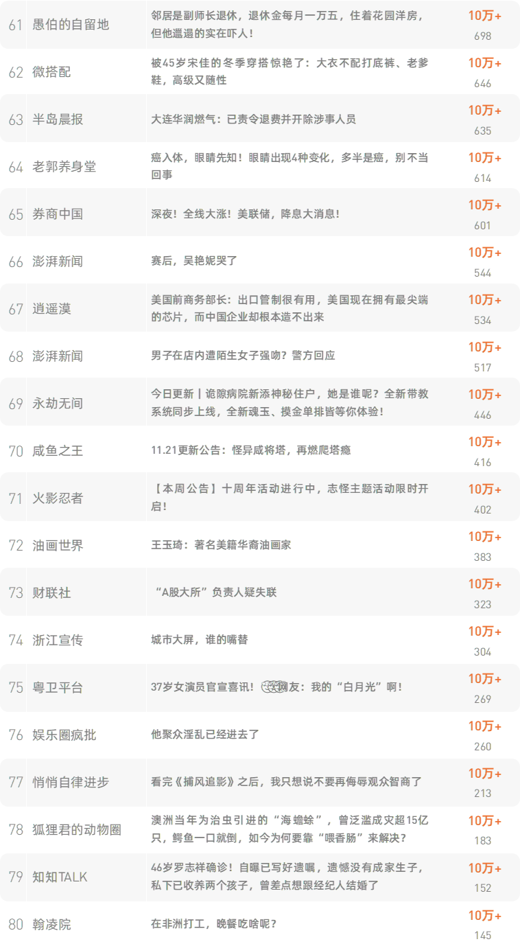 跳转原文请戳:《一个人内耗的根本原因:把自己活反了》 新榜榜单小程序版正式上线,榜单想看就看,更多热门内容也可登录新榜网站www.newrank.cn进行查询,点击「阅读原文」查看新榜指数算法说明。 新榜排行榜 newranklist