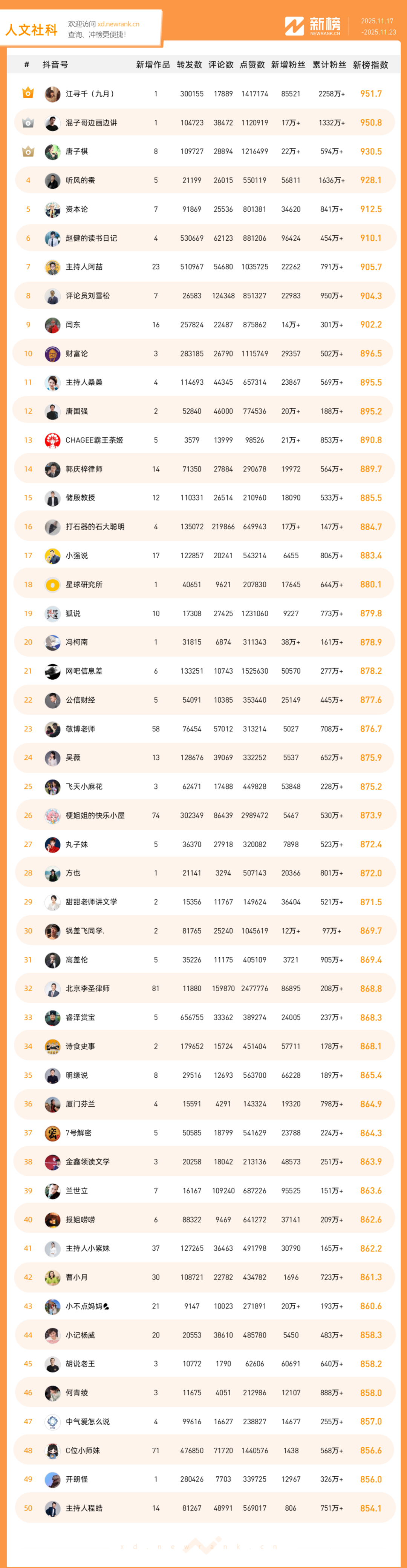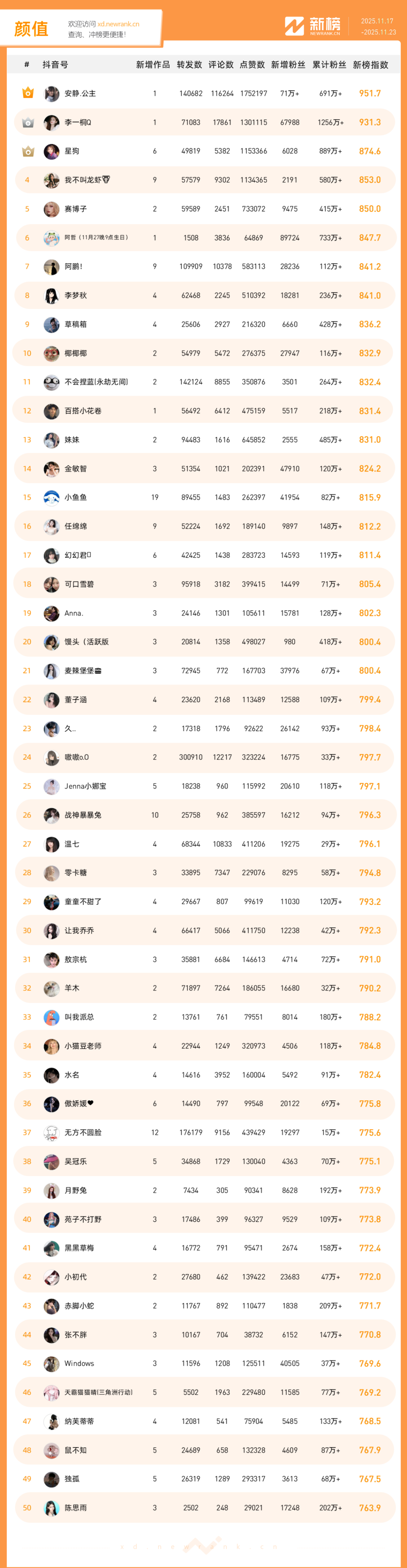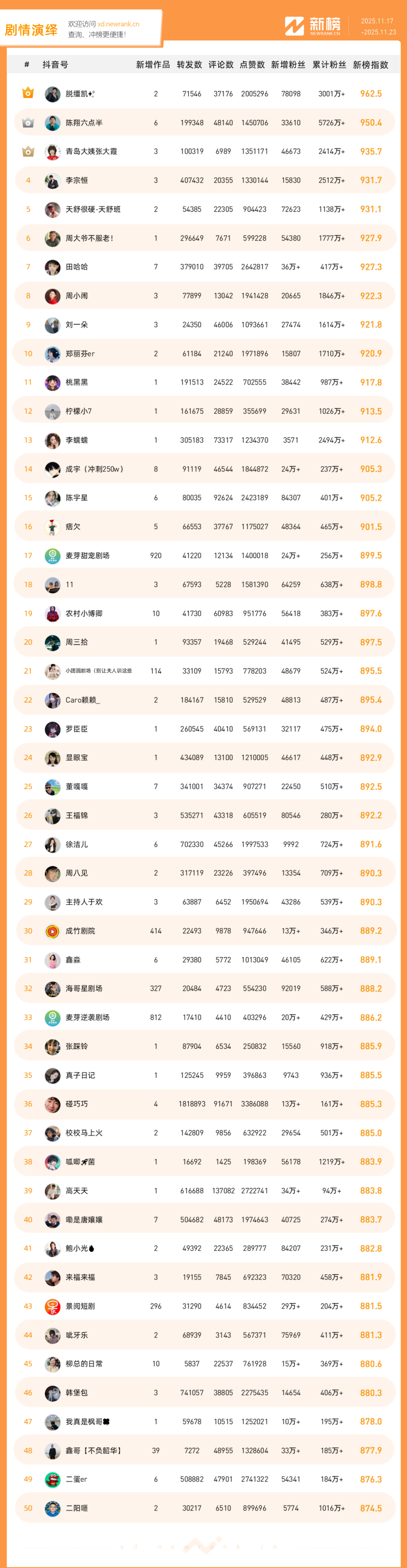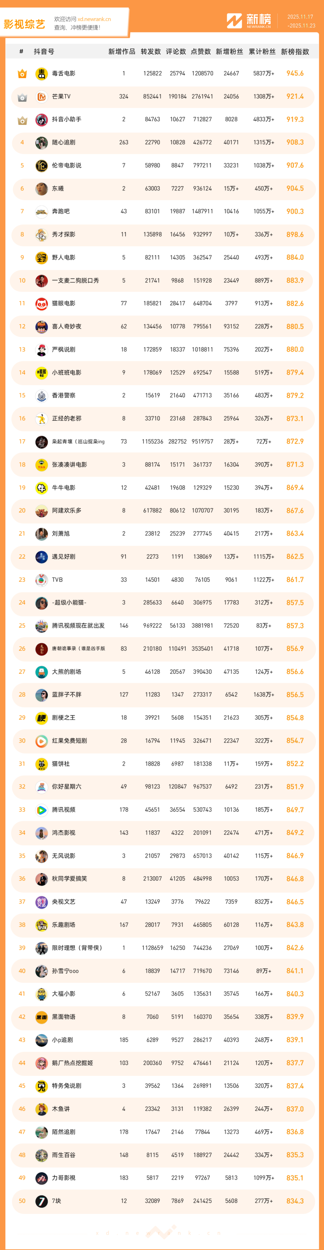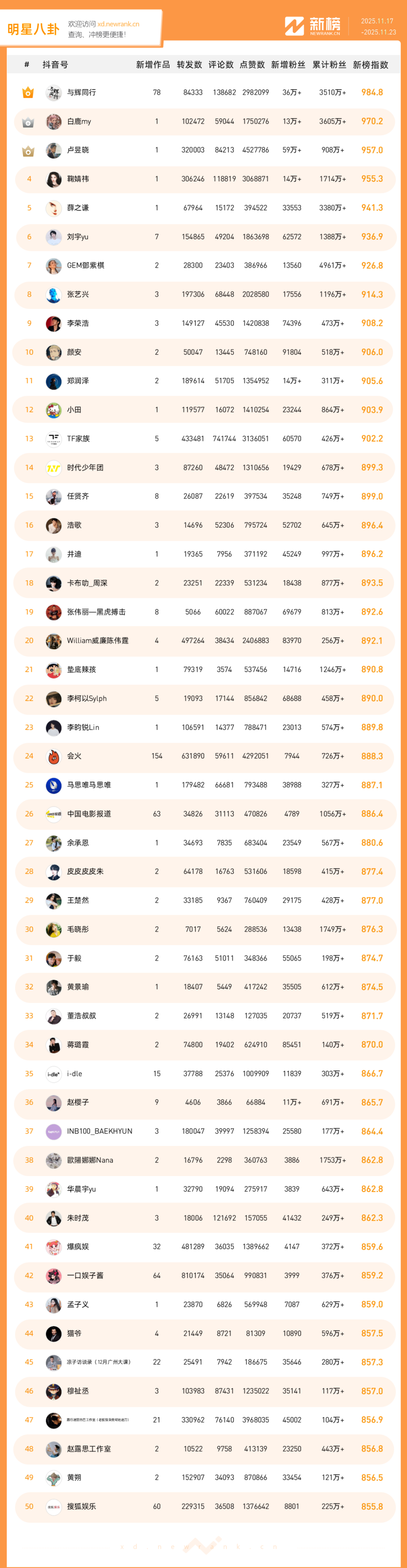 「抖音影响力排行榜」由新榜独家发布,每周一期,本期统计周期为2025年11月17日-2025年11月23日。想了解更多,请移步新抖——新榜全新推出的抖音全场景AI数据工具 xd.newrank.cn。提供实时热门素材、热门商品、带货力分析、抖音号搜索,抖音号排行榜等免费数据服务,后续增值服务持续开放。用以排名的“新榜指数”算法由新榜独立生成,抖音榜单的新榜指数共涉及粉丝数、粉丝增量、分享数、评论数以及点赞数等五项数据指标,其中粉丝数指标衡量人气表现,其余4项指标衡量作品表现。具体算法说明请参考“算法描述”。