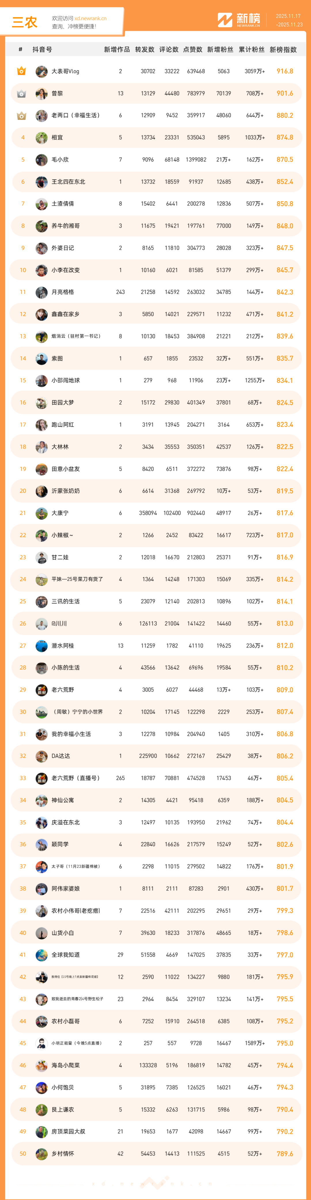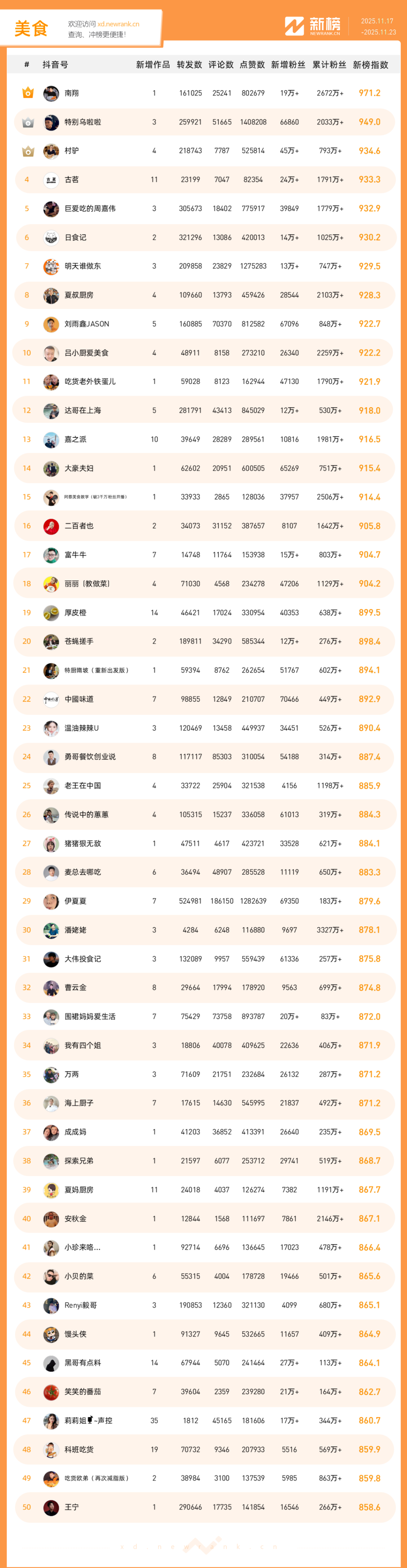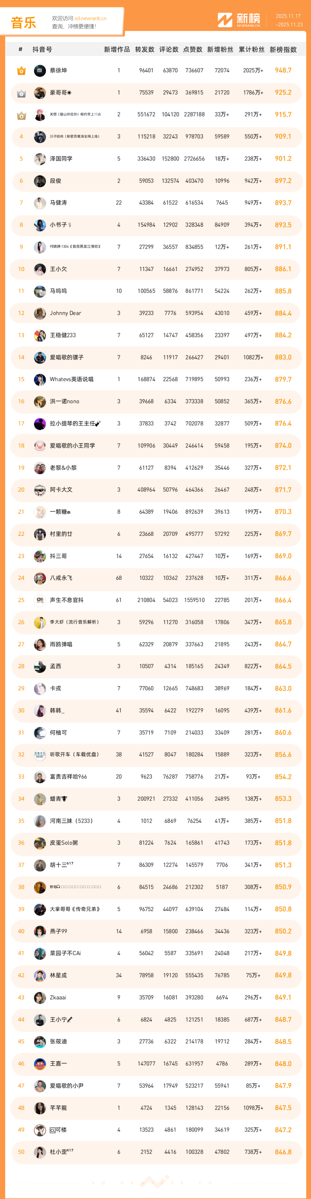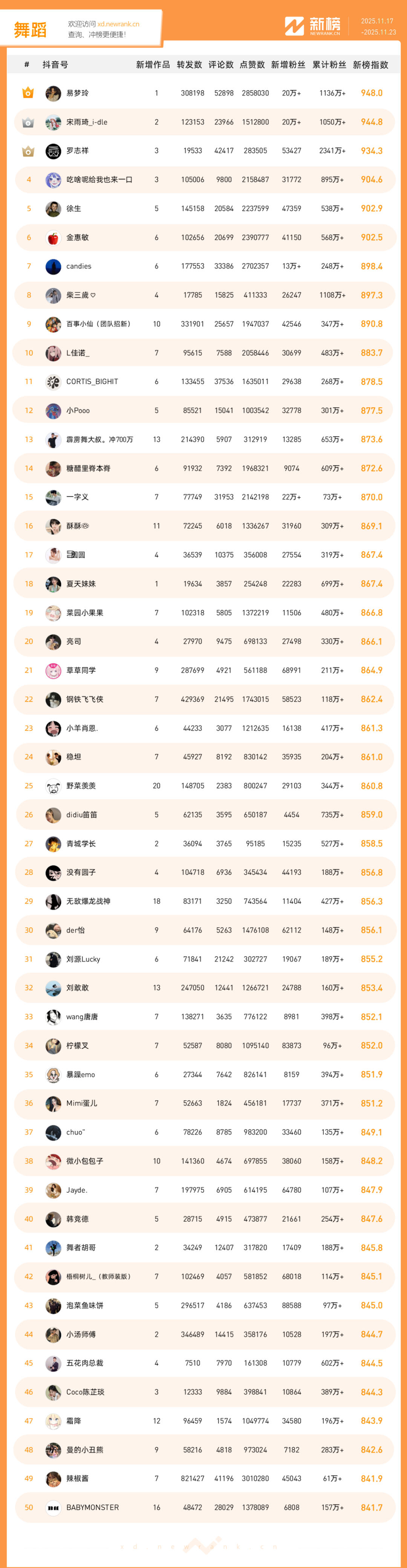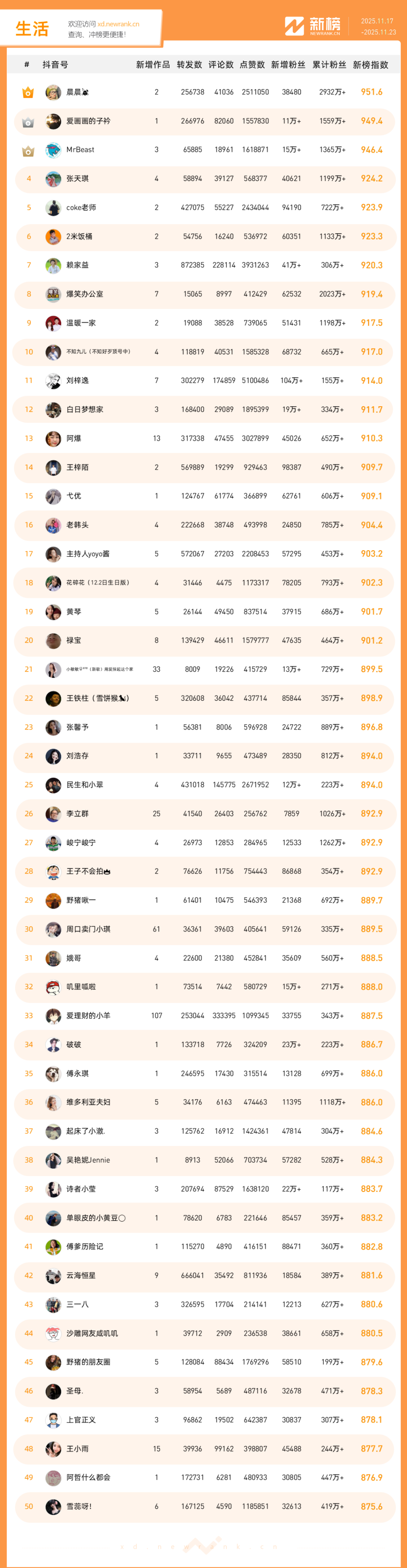 「抖音影响力排行榜」由新榜独家发布,每周一期,本期统计周期为2025年11月17日-2025年11月23日。想了解更多,请移步新抖——新榜全新推出的抖音全场景AI数据工具 xd.newrank.cn。提供实时热门素材、热门商品、带货力分析、抖音号搜索,抖音号排行榜等免费数据服务,后续增值服务持续开放。用以排名的“新榜指数”算法由新榜独立生成,抖音榜单的新榜指数共涉及粉丝数、粉丝增量、分享数、评论数以及点赞数等五项数据指标,其中粉丝数指标衡量人气表现,其余4项指标衡量作品表现。具体算法说明请参考“算法描述”。