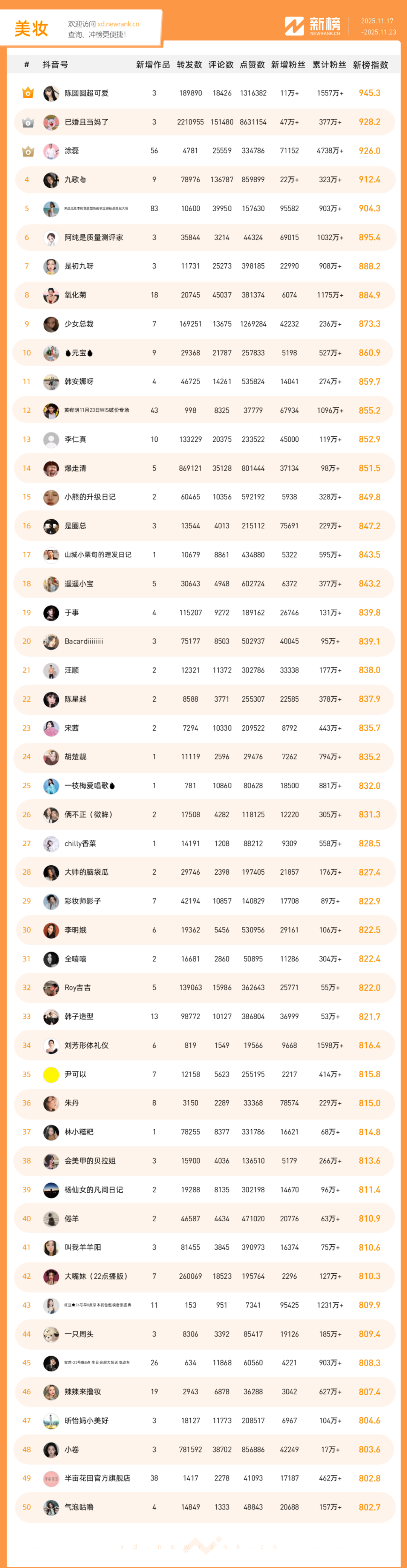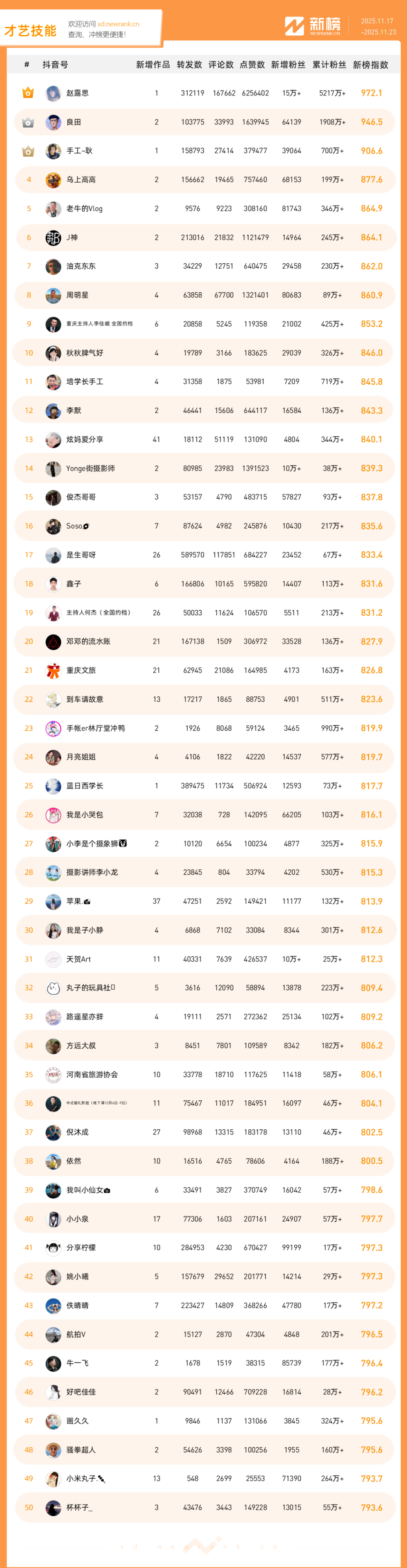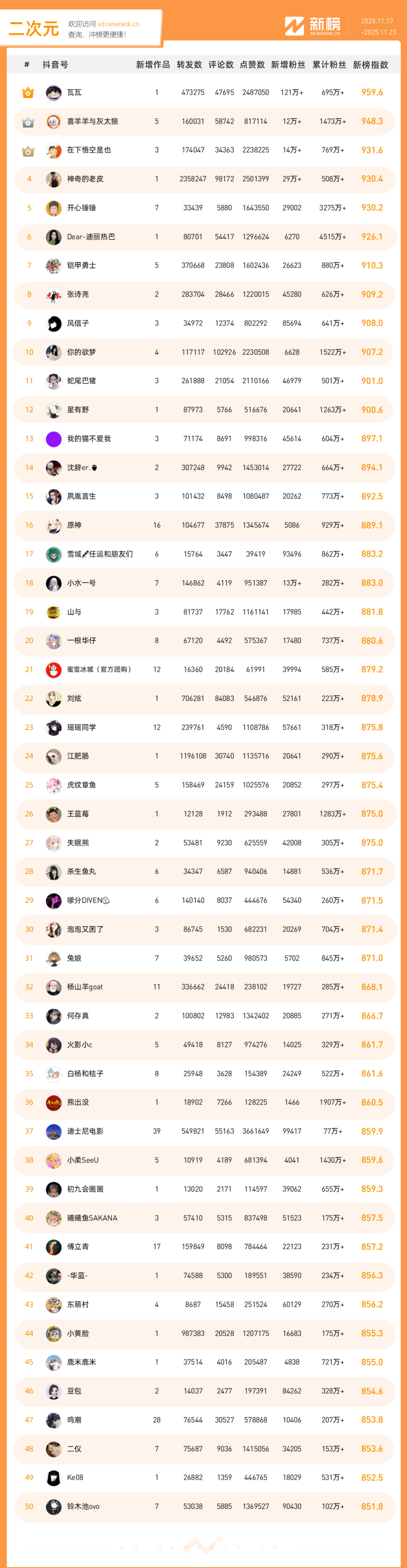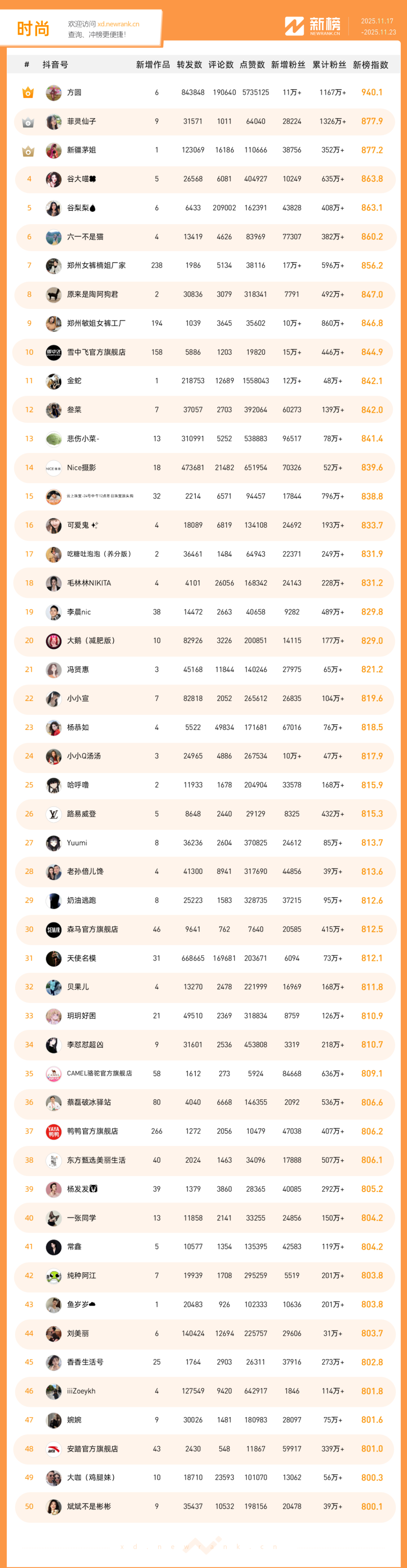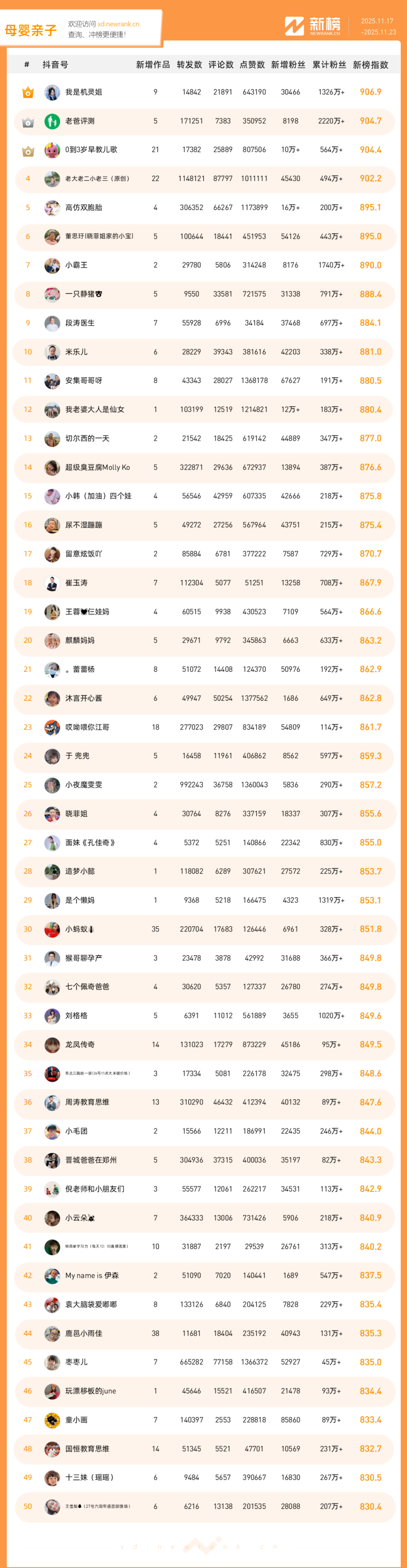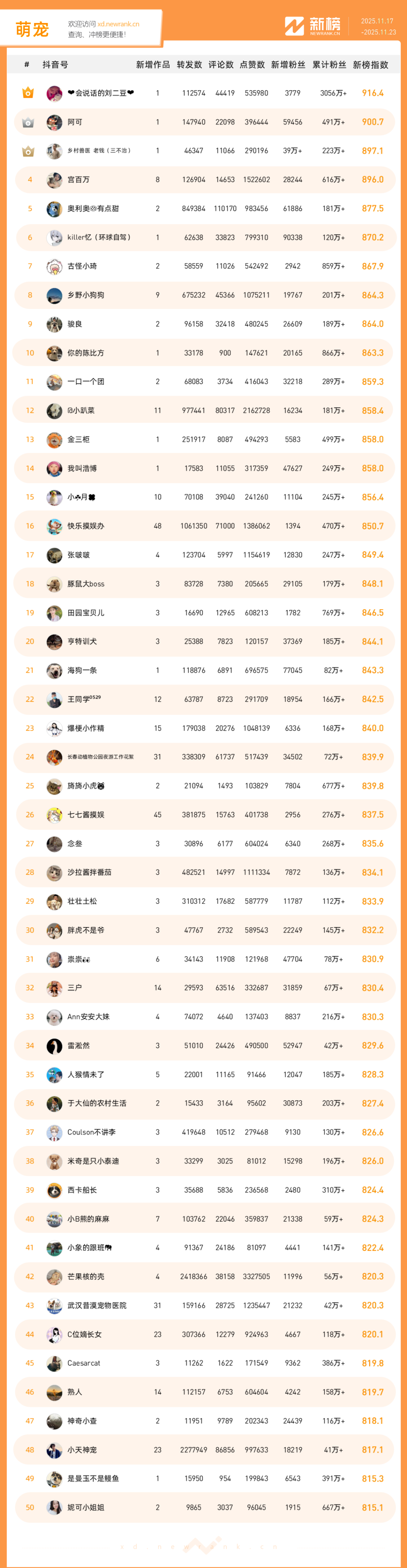 「抖音影响力排行榜」由新榜独家发布,每周一期,本期统计周期为2025年11月17日-2025年11月23日。想了解更多,请移步新抖——新榜全新推出的抖音全场景AI数据工具 xd.newrank.cn。提供实时热门素材、热门商品、带货力分析、抖音号搜索,抖音号排行榜等免费数据服务,后续增值服务持续开放。用以排名的“新榜指数”算法由新榜独立生成,抖音榜单的新榜指数共涉及粉丝数、粉丝增量、分享数、评论数以及点赞数等五项数据指标,其中粉丝数指标衡量人气表现,其余4项指标衡量作品表现。具体算法说明请参考“算法描述”。