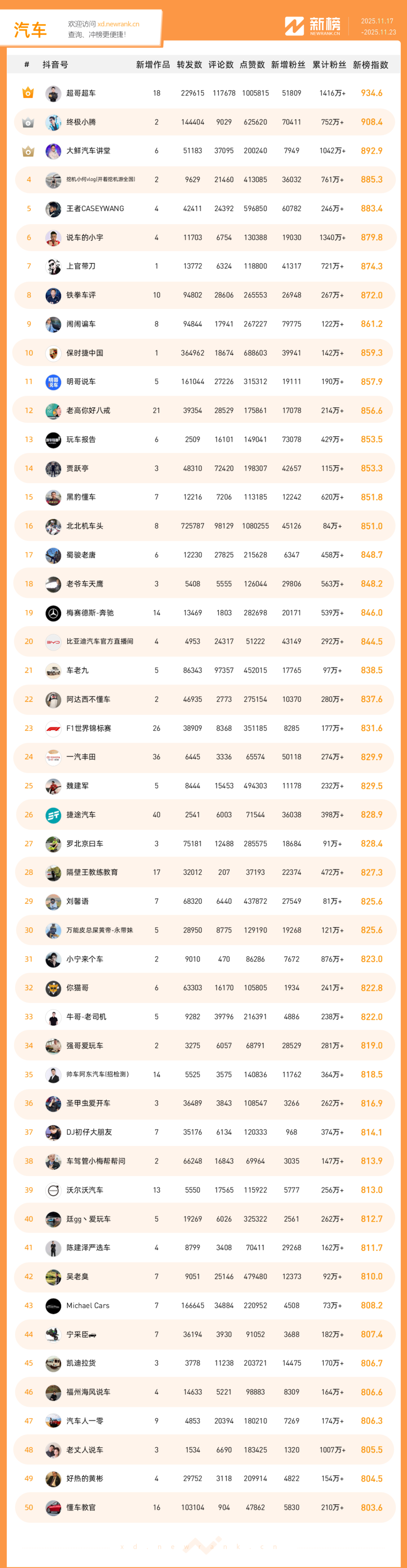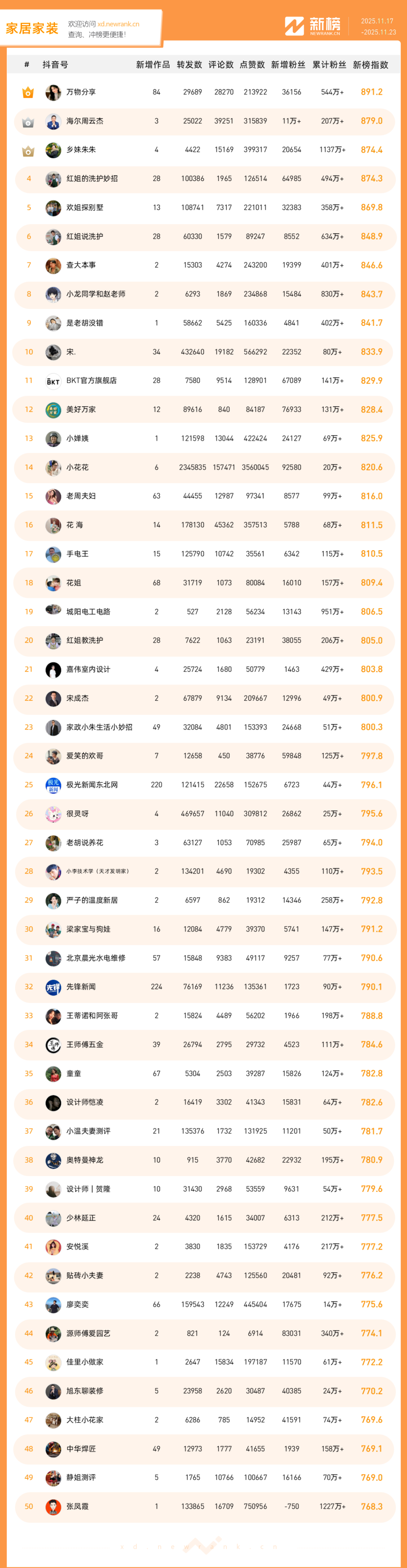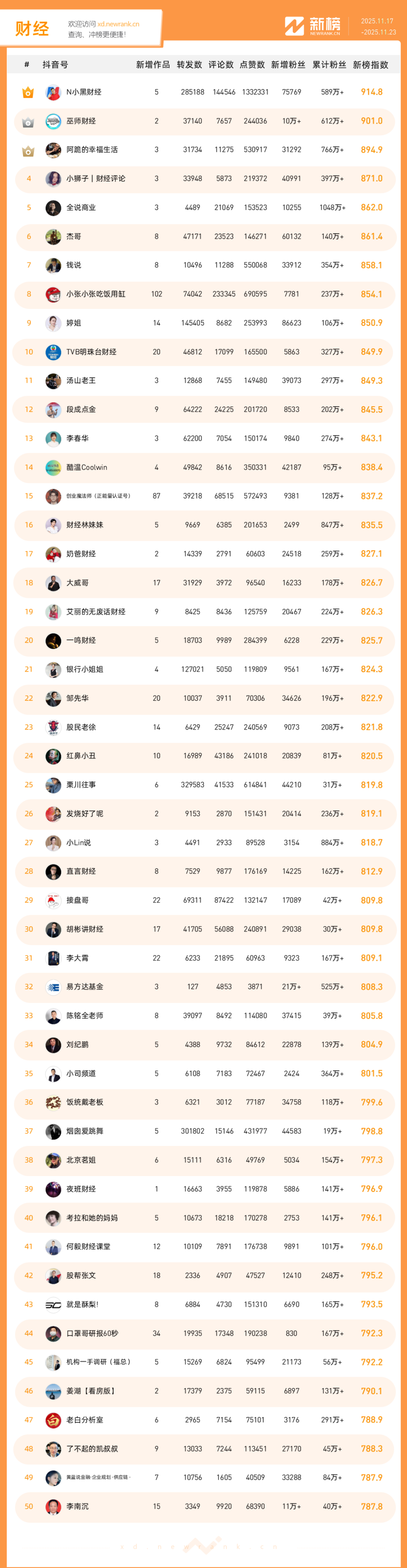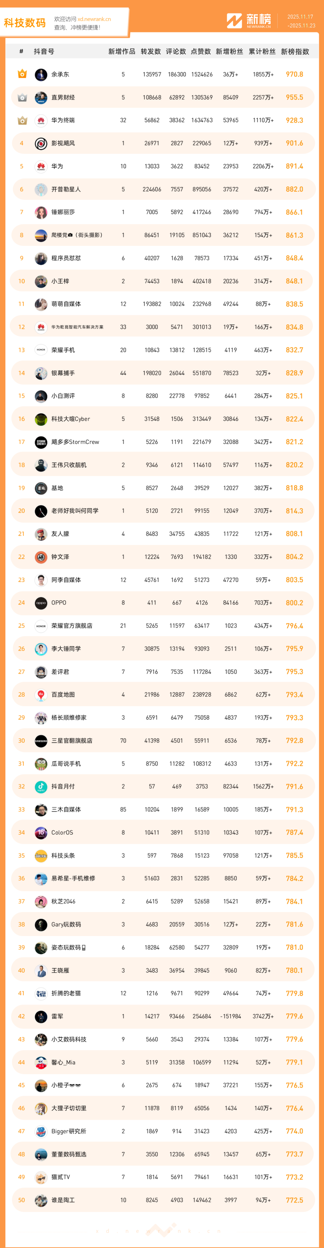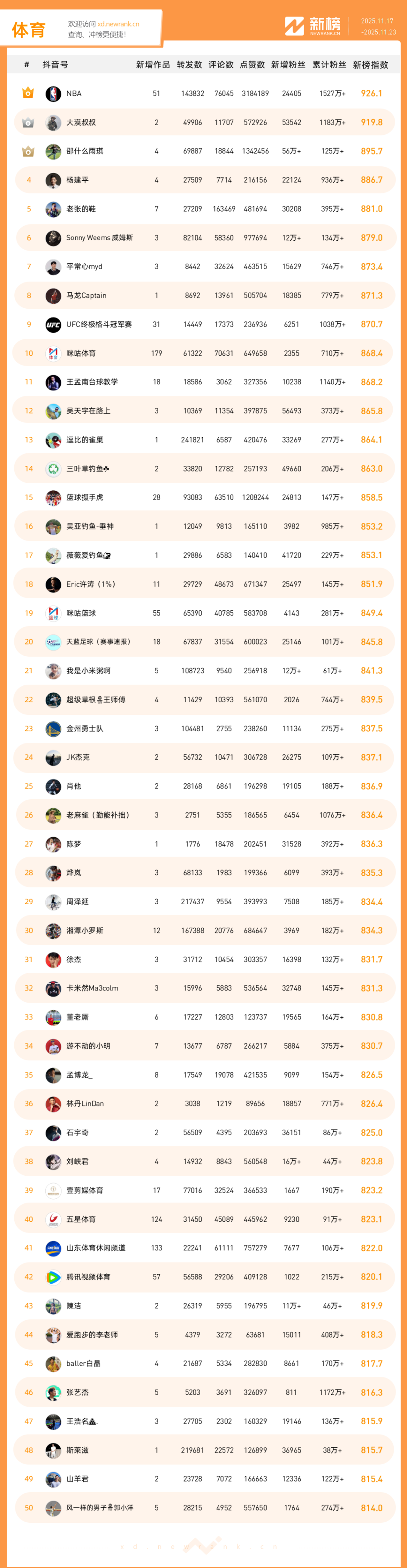 「抖音影响力排行榜」由新榜独家发布,每周一期,本期统计周期为2025年11月17日-2025年11月23日。想了解更多,请移步新抖——新榜全新推出的抖音全场景AI数据工具 xd.newrank.cn。提供实时热门素材、热门商品、带货力分析、抖音号搜索,抖音号排行榜等免费数据服务,后续增值服务持续开放。用以排名的“新榜指数”算法由新榜独立生成,抖音榜单的新榜指数共涉及粉丝数、粉丝增量、分享数、评论数以及点赞数等五项数据指标,其中粉丝数指标衡量人气表现,其余4项指标衡量作品表现。具体算法说明请参考“算法描述”。
