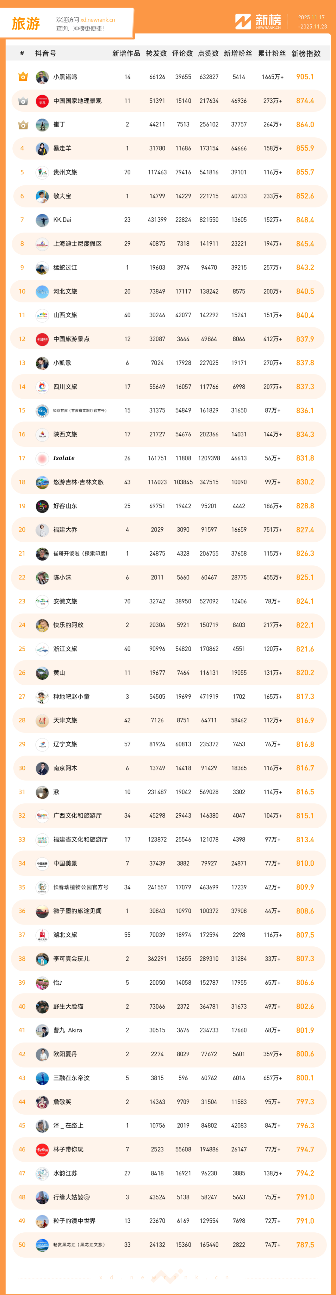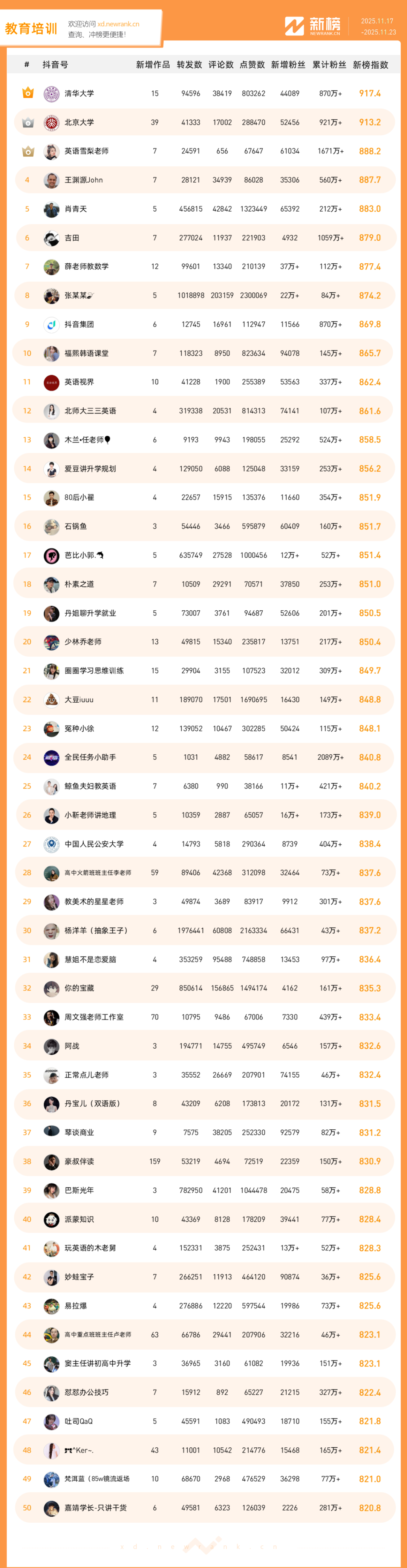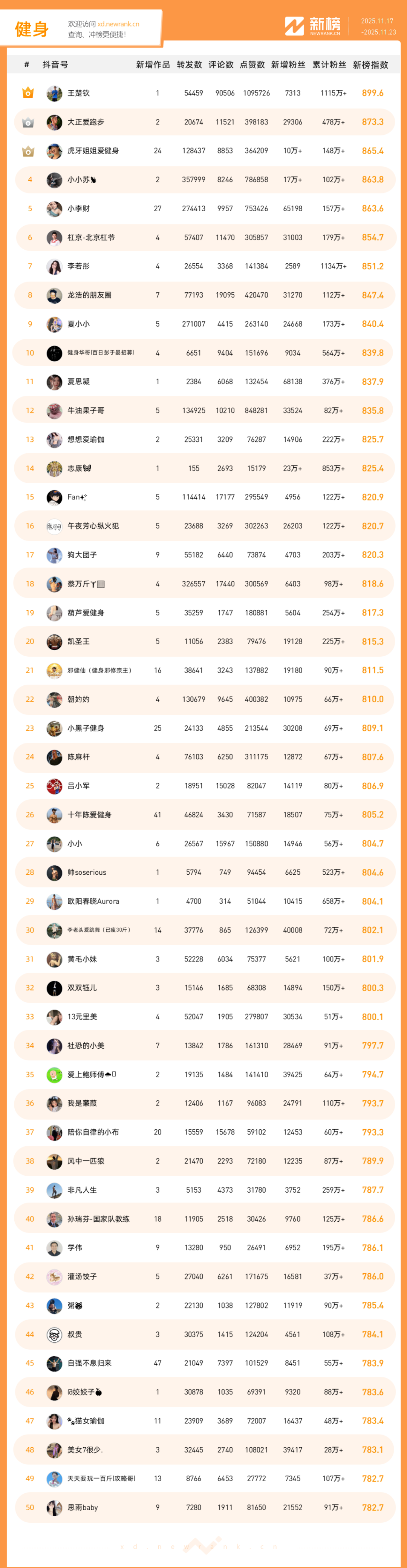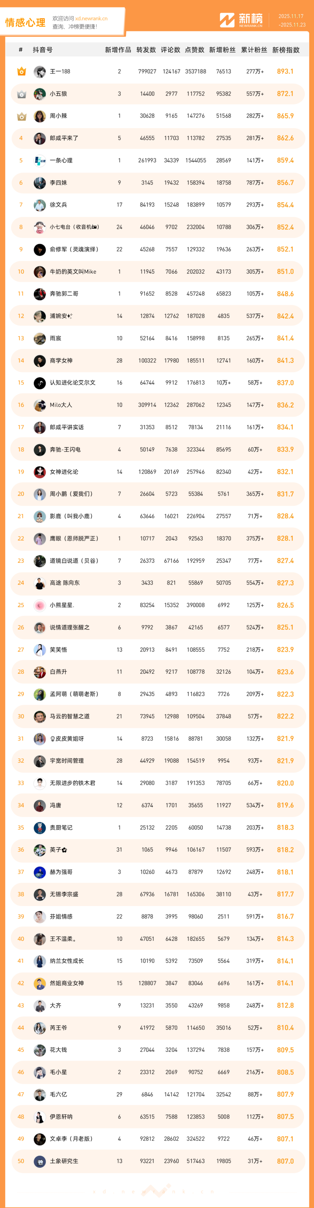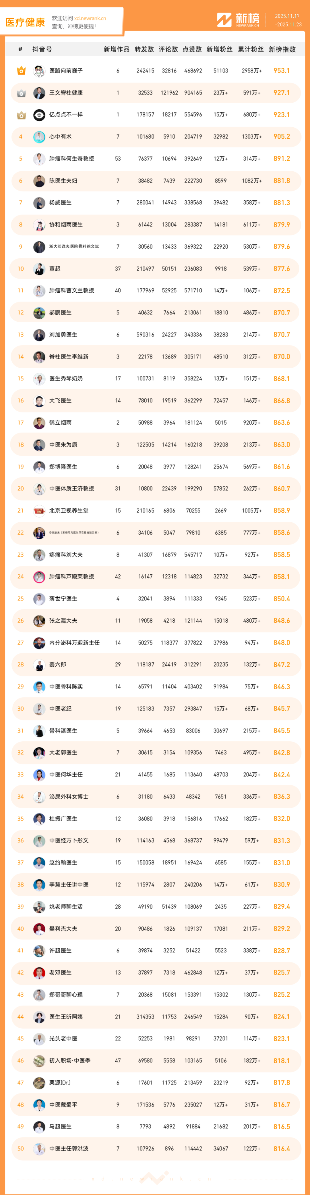 「抖音影响力排行榜」由新榜独家发布,每周一期,本期统计周期为2025年11月17日-2025年11月23日。想了解更多,请移步新抖——新榜全新推出的抖音全场景AI数据工具 xd.newrank.cn。提供实时热门素材、热门商品、带货力分析、抖音号搜索,抖音号排行榜等免费数据服务,后续增值服务持续开放。用以排名的“新榜指数”算法由新榜独立生成,抖音榜单的新榜指数共涉及粉丝数、粉丝增量、分享数、评论数以及点赞数等五项数据指标,其中粉丝数指标衡量人气表现,其余4项指标衡量作品表现。具体算法说明请参考“算法描述”。