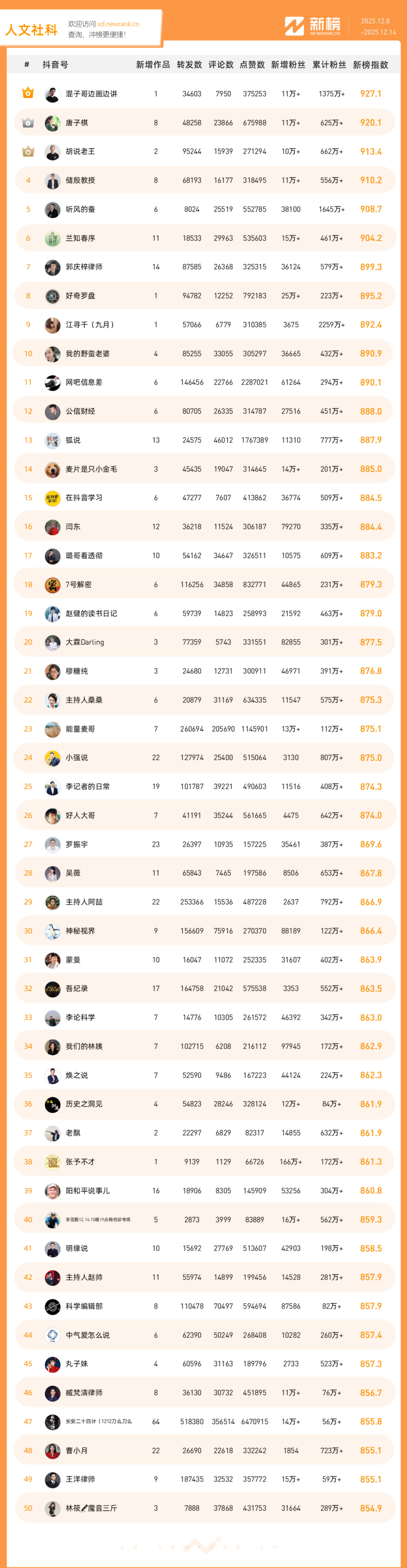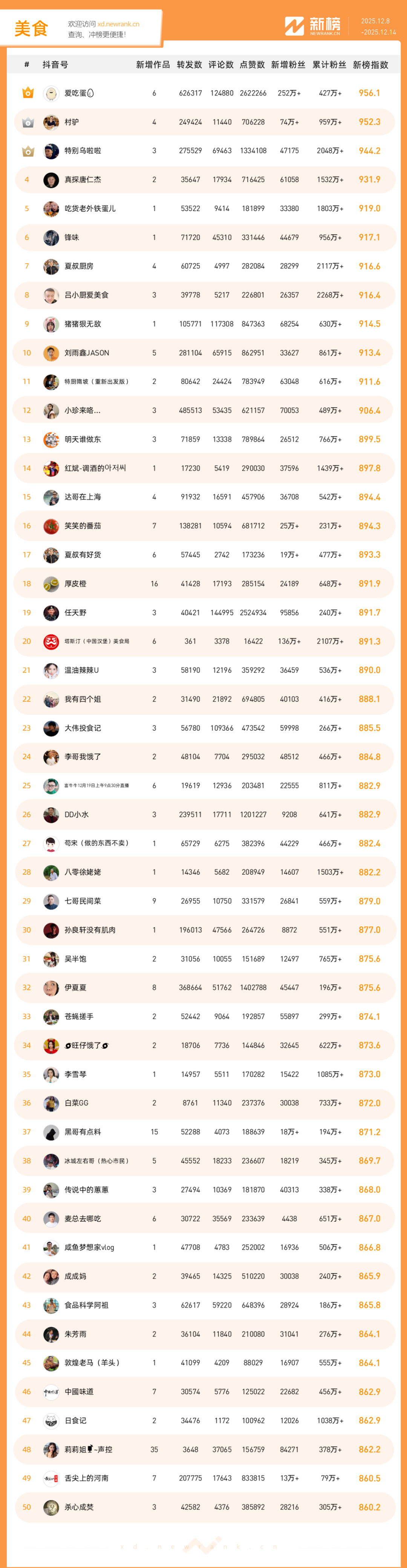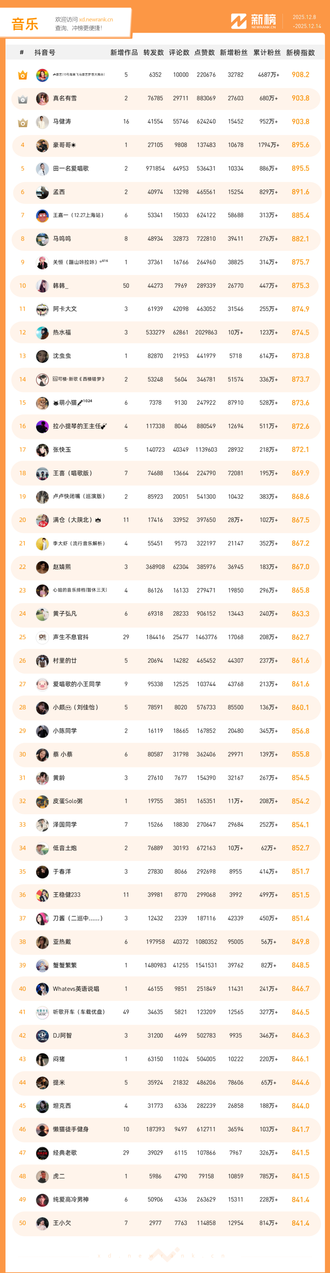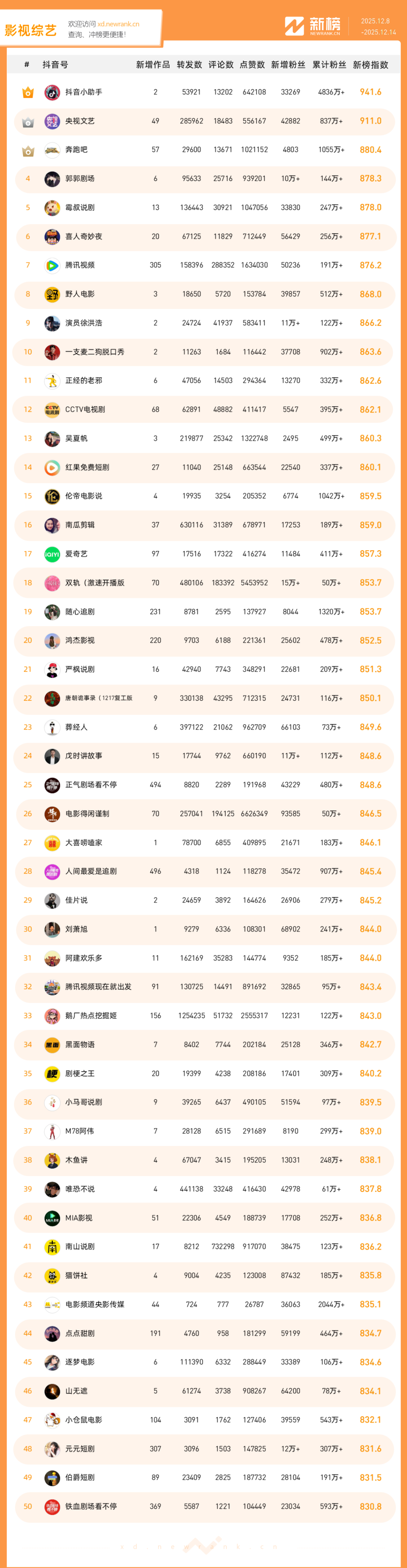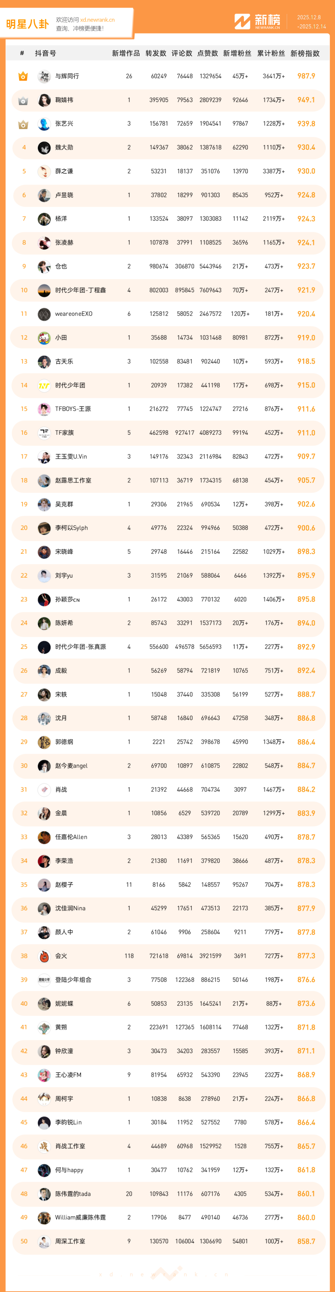 「抖音影响力排行榜」由新榜独家发布,每周一期,本期统计周期为2025年12月8日-2025年12月14日。想了解更多,请移步新抖——新榜全新推出的抖音全场景AI数据工具 xd.newrank.cn。提供实时热门素材、热门商品、带货力分析、抖音号搜索,抖音号排行榜等免费数据服务,后续增值服务持续开放。用以排名的“新榜指数”算法由新榜独立生成,抖音榜单的新榜指数共涉及粉丝数、粉丝增量、分享数、评论数以及点赞数等五项数据指标,其中粉丝数指标衡量人气表现,其余4项指标衡量作品表现。具体算法说明请参考“算法描述”。
