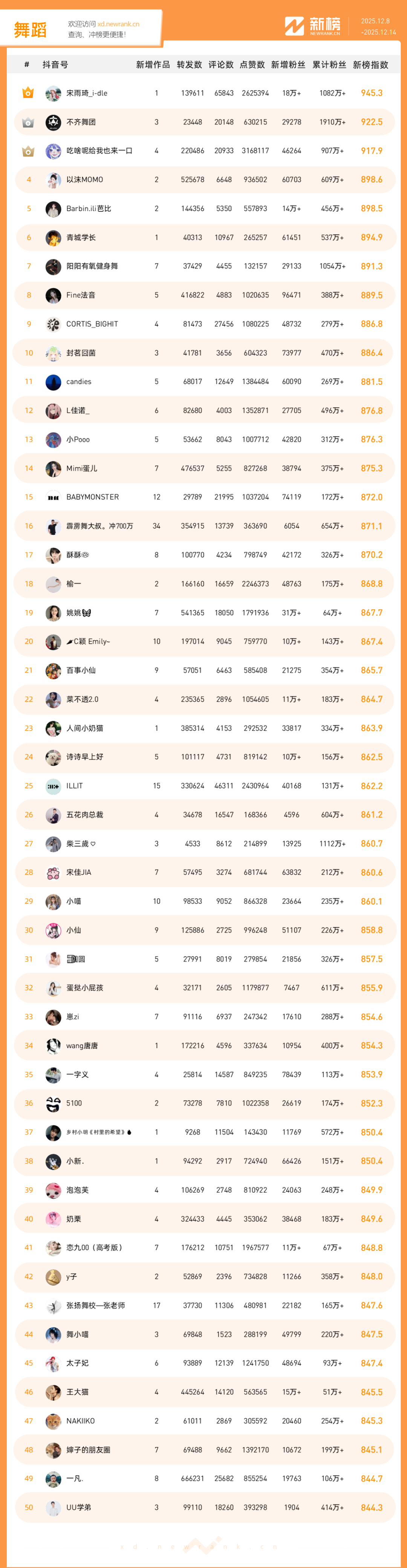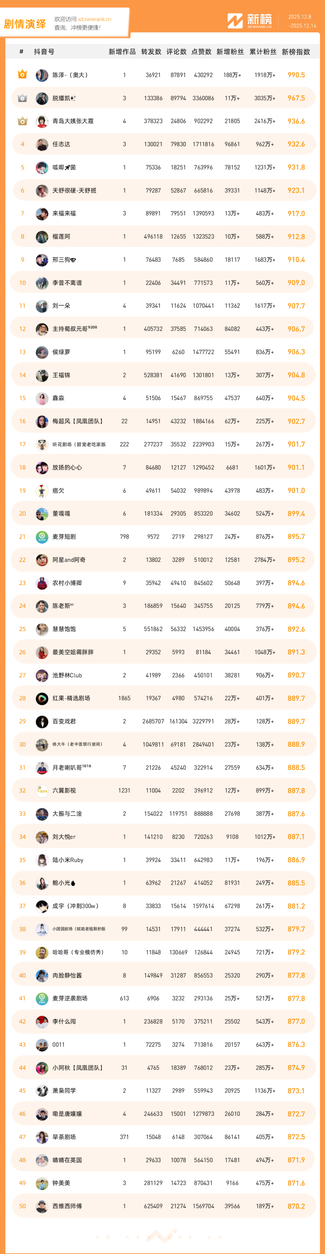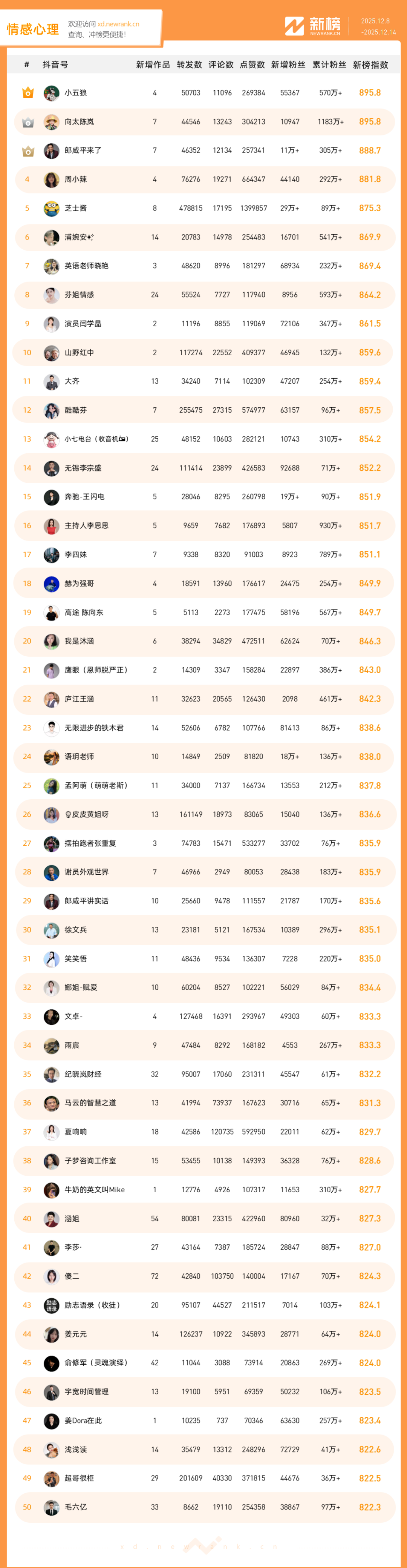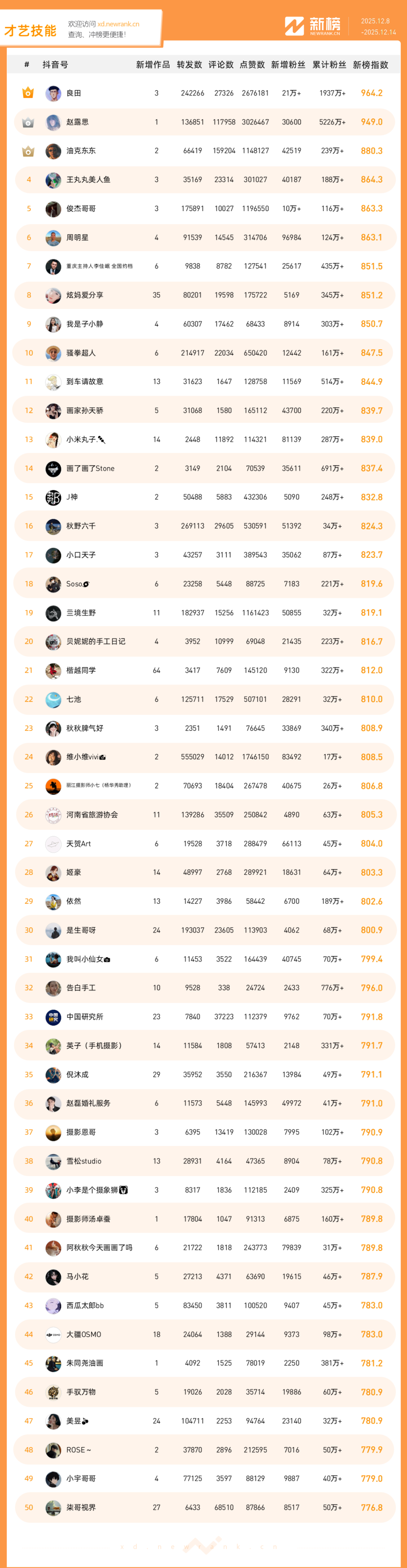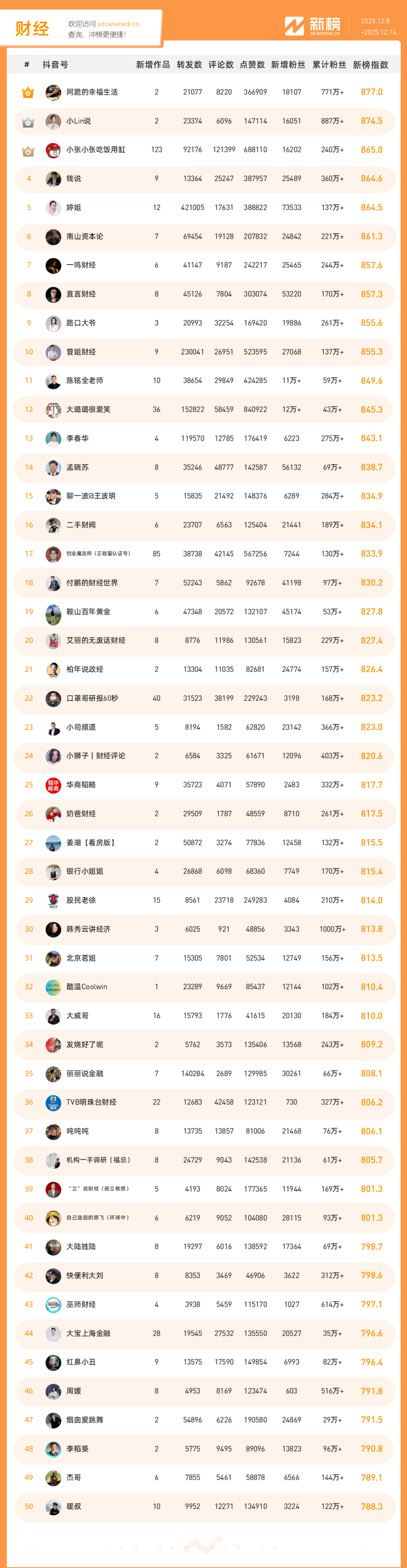 「抖音影响力排行榜」由新榜独家发布,每周一期,本期统计周期为2025年12月8日-2025年12月14日。想了解更多,请移步新抖——新榜全新推出的抖音全场景AI数据工具 xd.newrank.cn。提供实时热门素材、热门商品、带货力分析、抖音号搜索,抖音号排行榜等免费数据服务,后续增值服务持续开放。用以排名的“新榜指数”算法由新榜独立生成,抖音榜单的新榜指数共涉及粉丝数、粉丝增量、分享数、评论数以及点赞数等五项数据指标,其中粉丝数指标衡量人气表现,其余4项指标衡量作品表现。具体算法说明请参考“算法描述”。