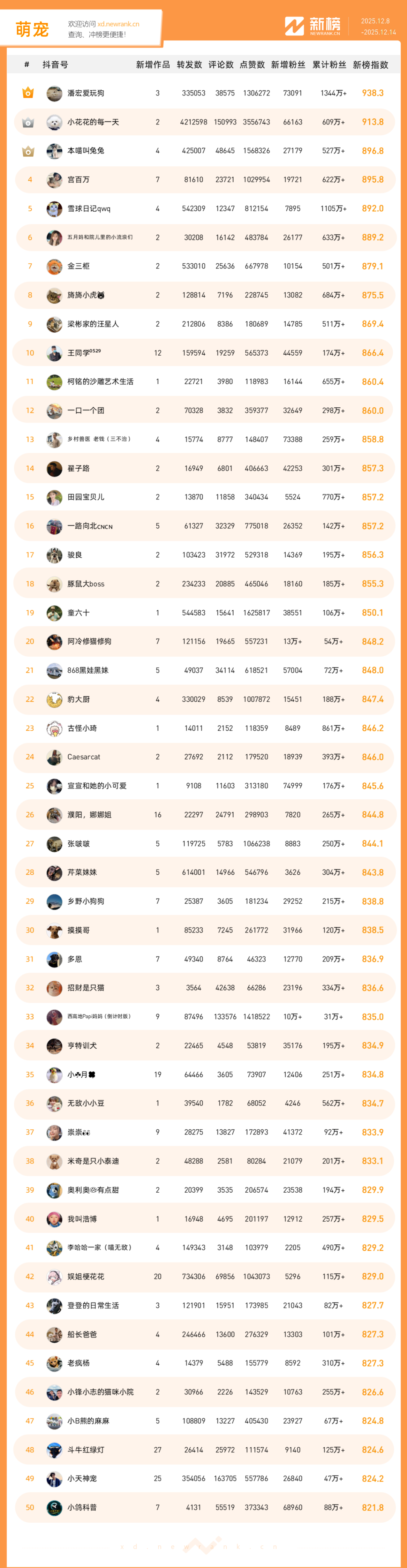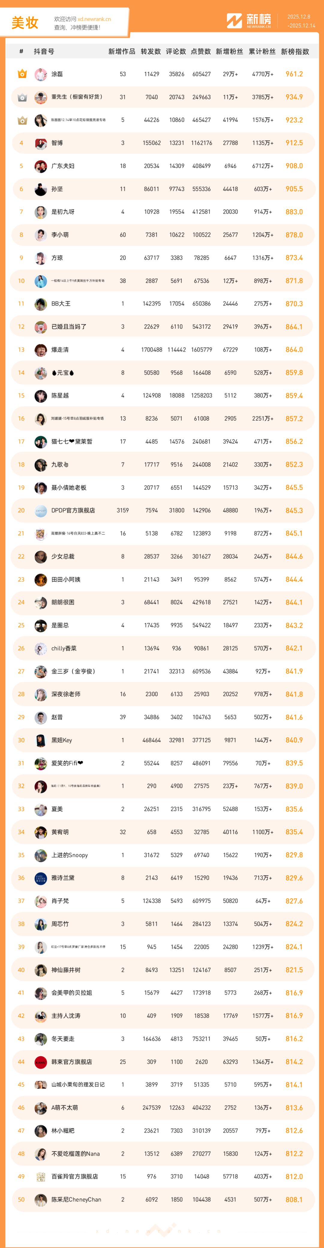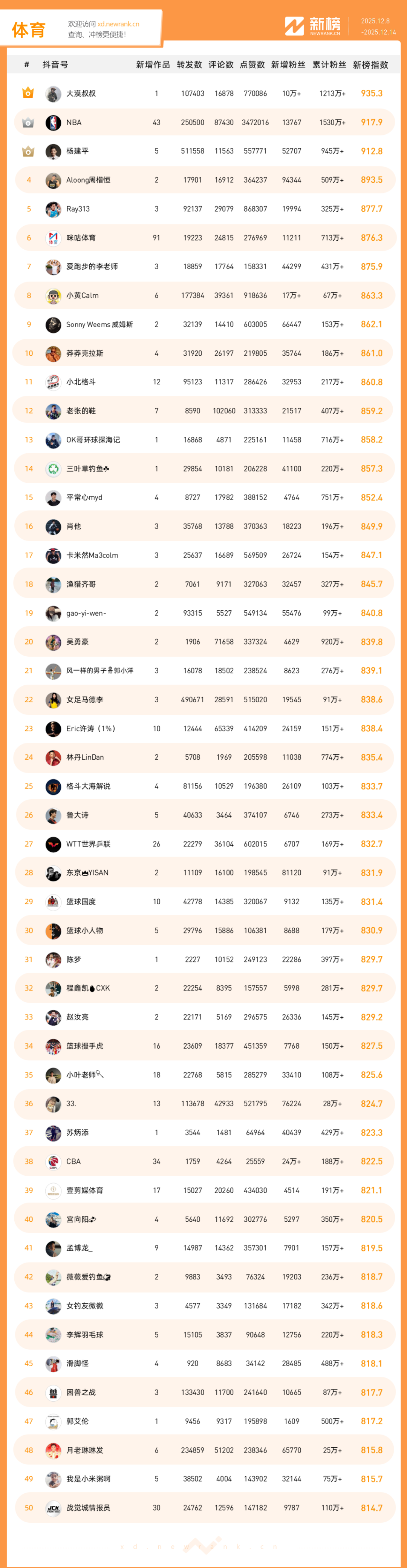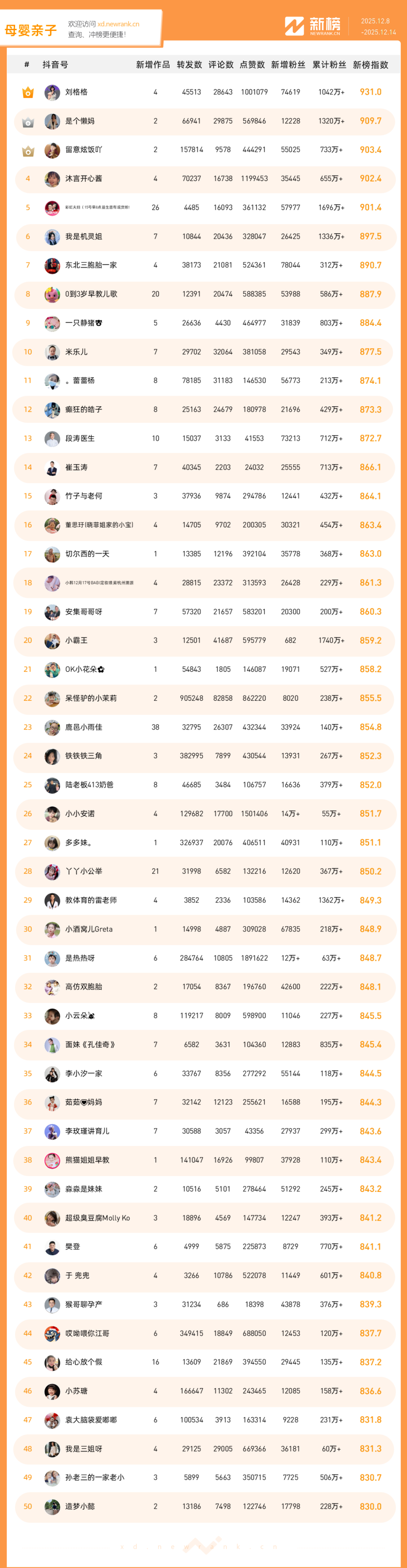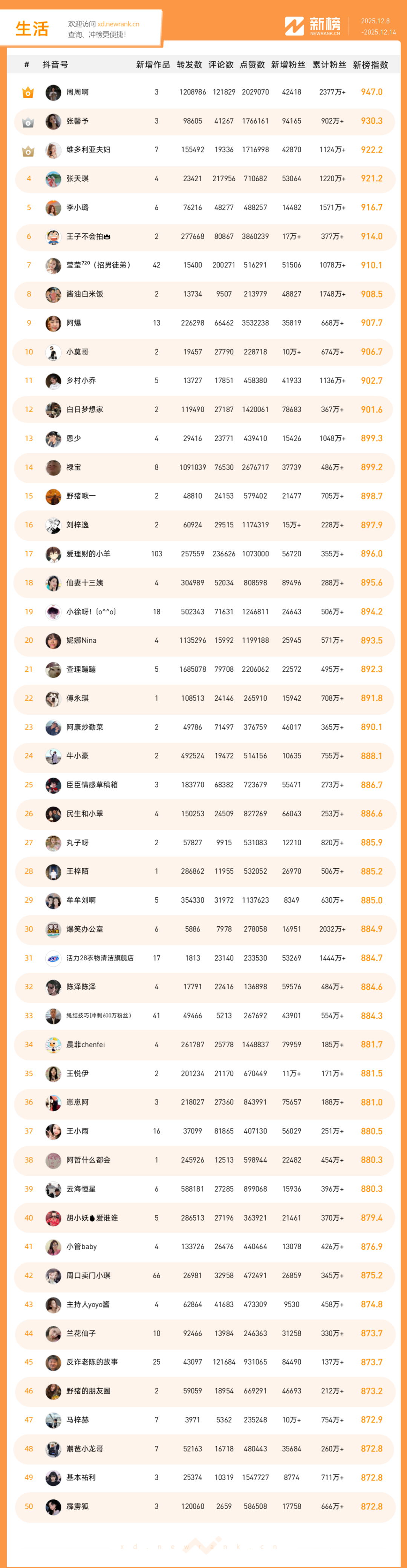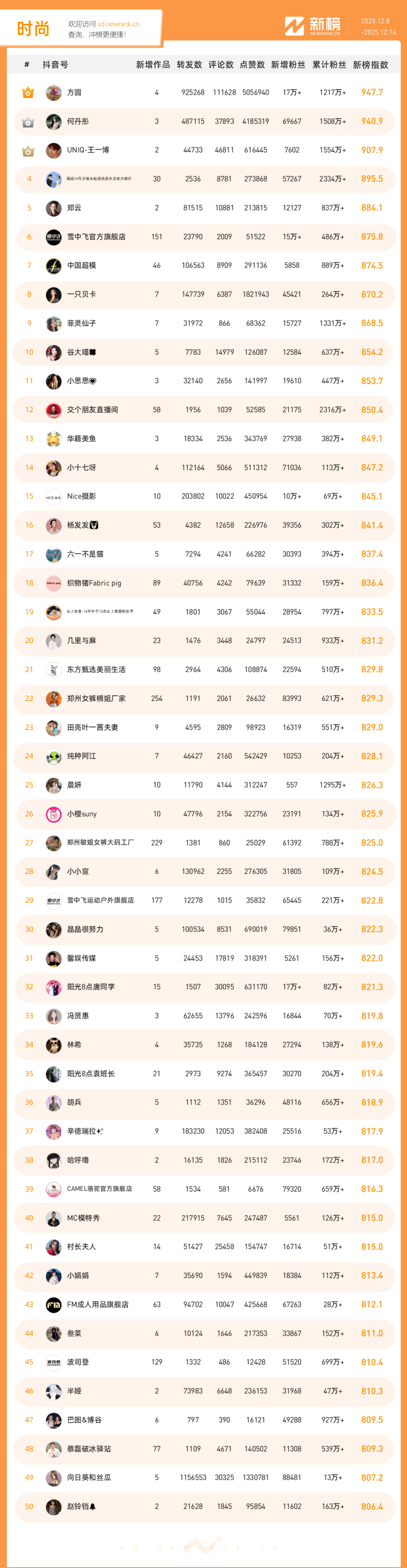 「抖音影响力排行榜」由新榜独家发布,每周一期,本期统计周期为2025年12月8日-2025年12月14日。想了解更多,请移步新抖——新榜全新推出的抖音全场景AI数据工具 xd.newrank.cn。提供实时热门素材、热门商品、带货力分析、抖音号搜索,抖音号排行榜等免费数据服务,后续增值服务持续开放。用以排名的“新榜指数”算法由新榜独立生成,抖音榜单的新榜指数共涉及粉丝数、粉丝增量、分享数、评论数以及点赞数等五项数据指标,其中粉丝数指标衡量人气表现,其余4项指标衡量作品表现。具体算法说明请参考“算法描述”。