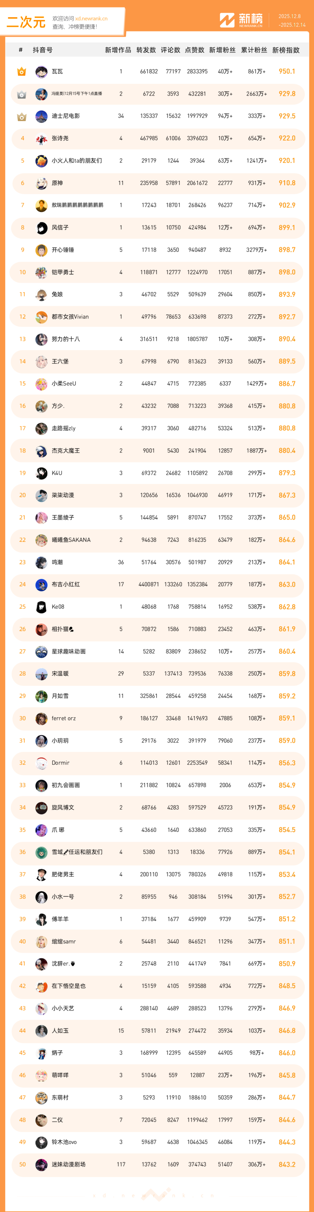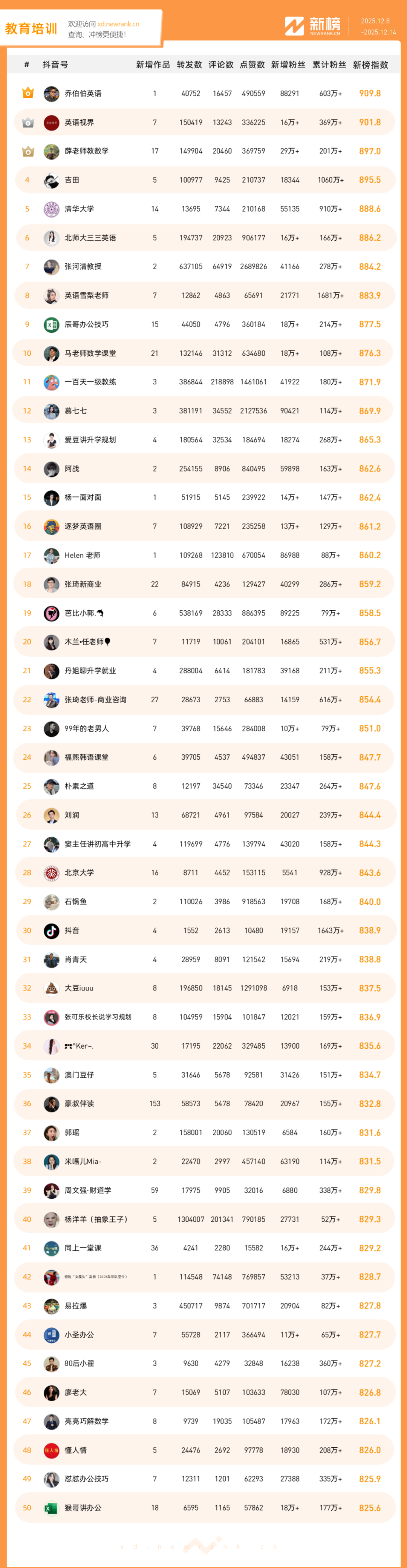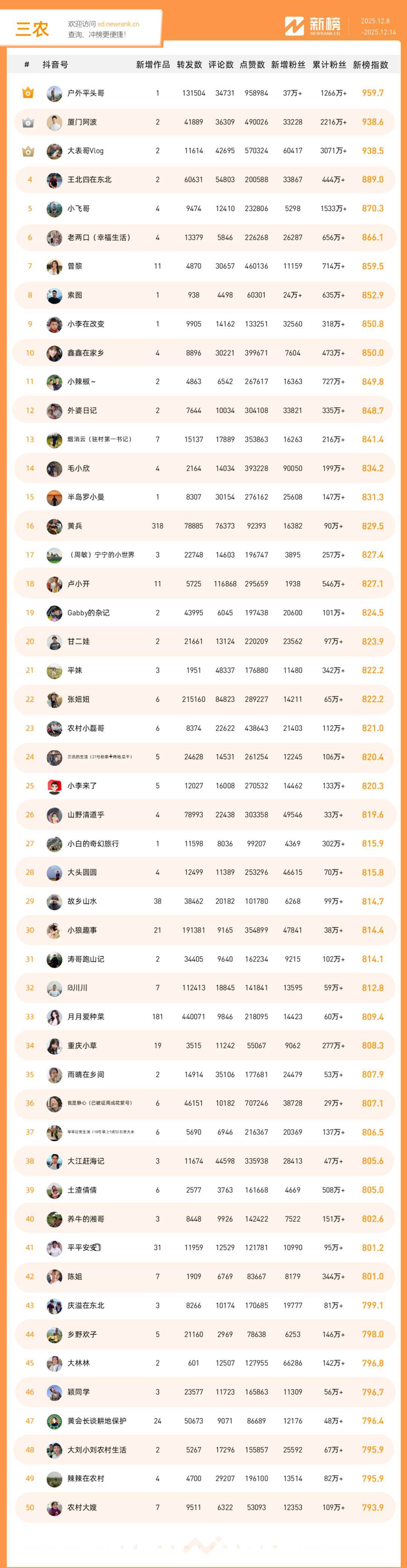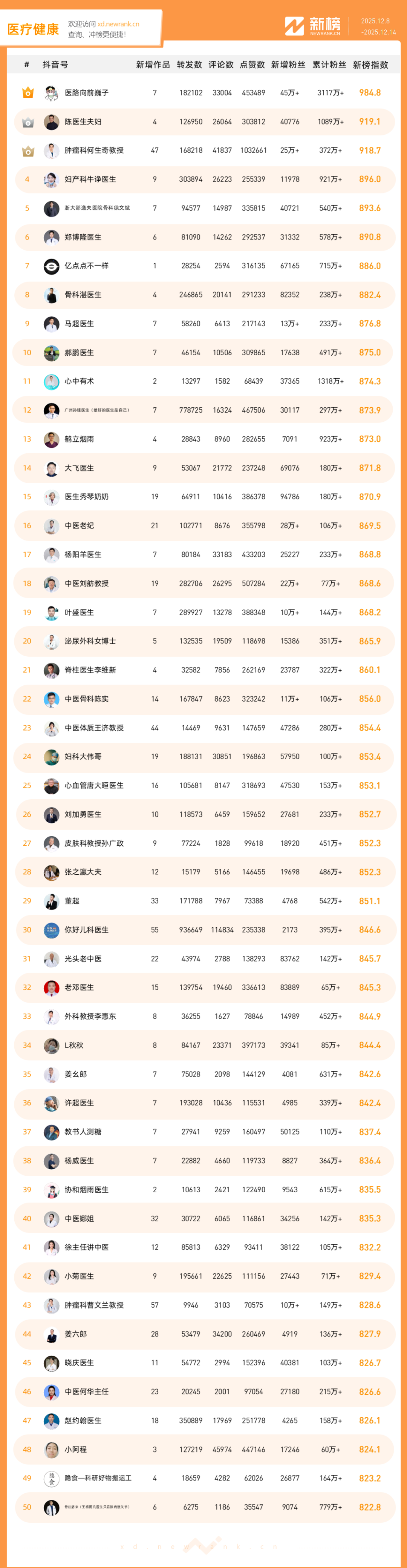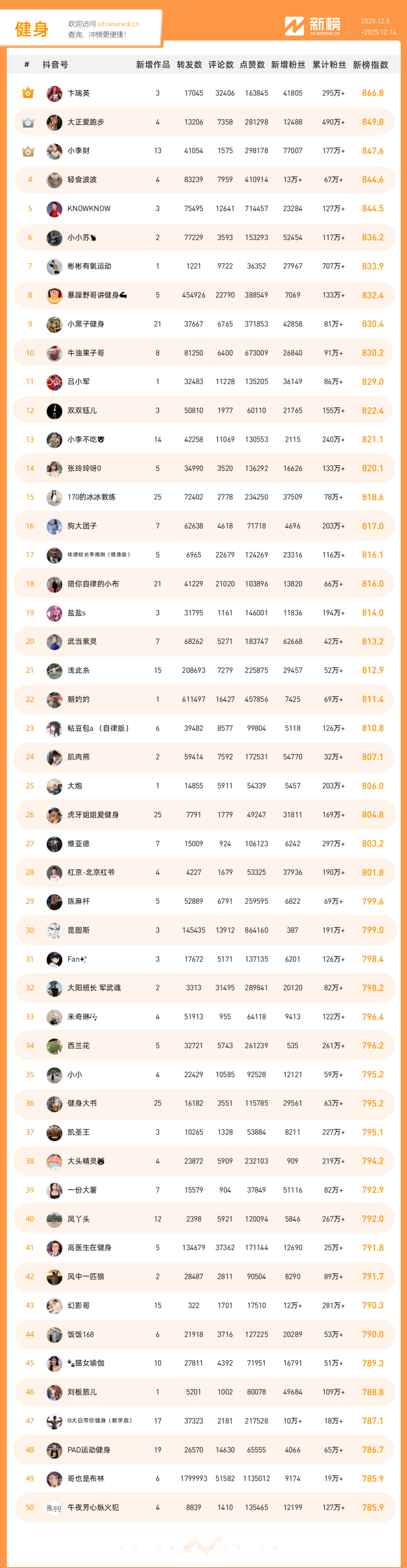 「抖音影响力排行榜」由新榜独家发布,每周一期,本期统计周期为2025年12月8日-2025年12月14日。想了解更多,请移步新抖——新榜全新推出的抖音全场景AI数据工具 xd.newrank.cn。提供实时热门素材、热门商品、带货力分析、抖音号搜索,抖音号排行榜等免费数据服务,后续增值服务持续开放。用以排名的“新榜指数”算法由新榜独立生成,抖音榜单的新榜指数共涉及粉丝数、粉丝增量、分享数、评论数以及点赞数等五项数据指标,其中粉丝数指标衡量人气表现,其余4项指标衡量作品表现。具体算法说明请参考“算法描述”。