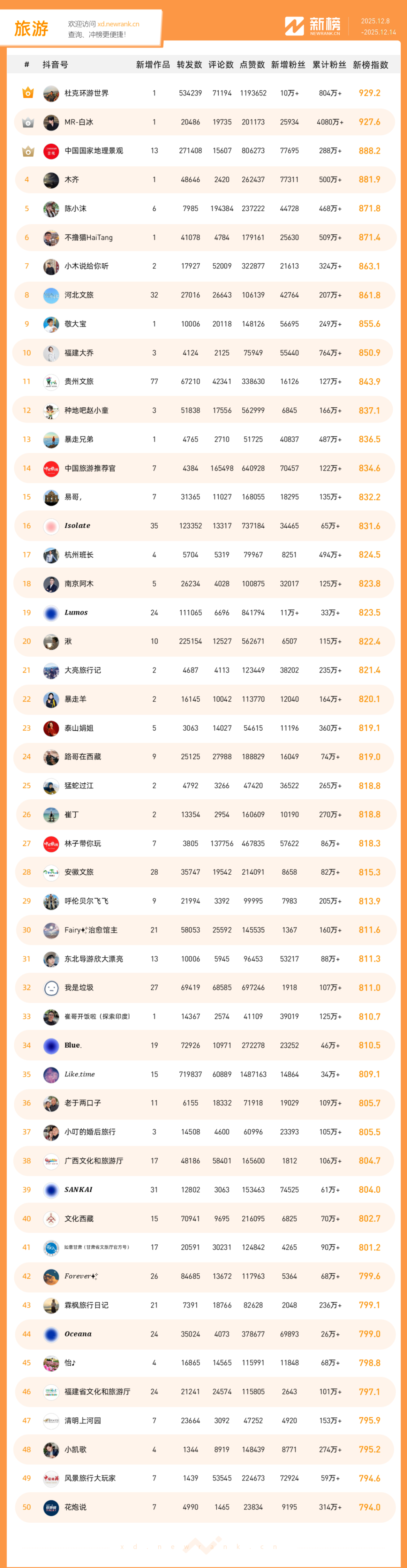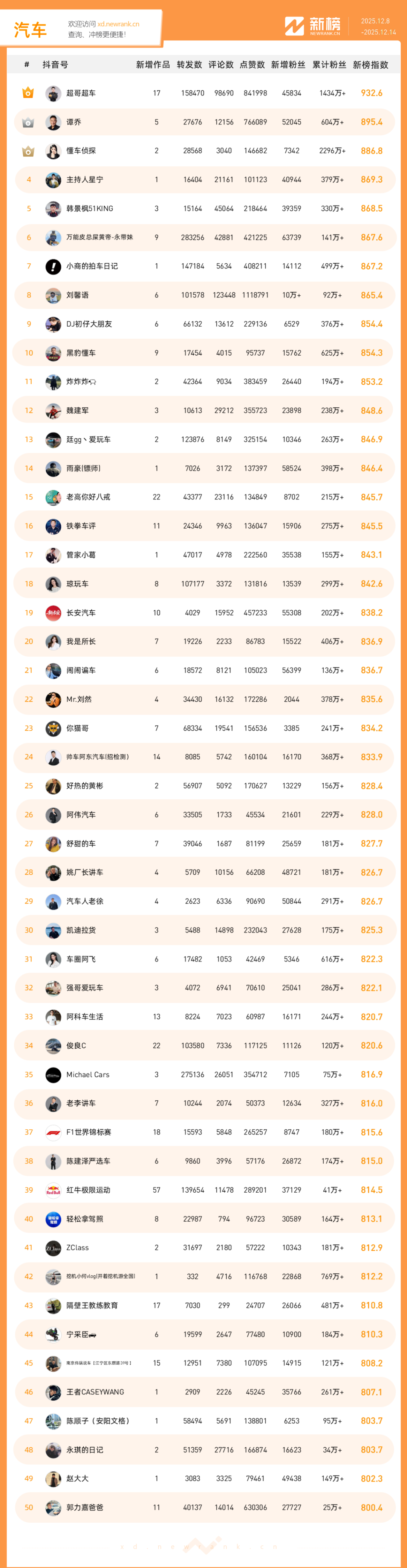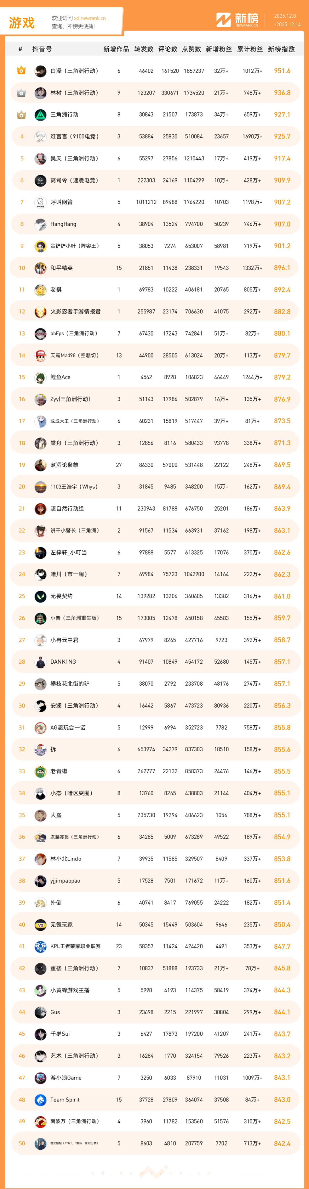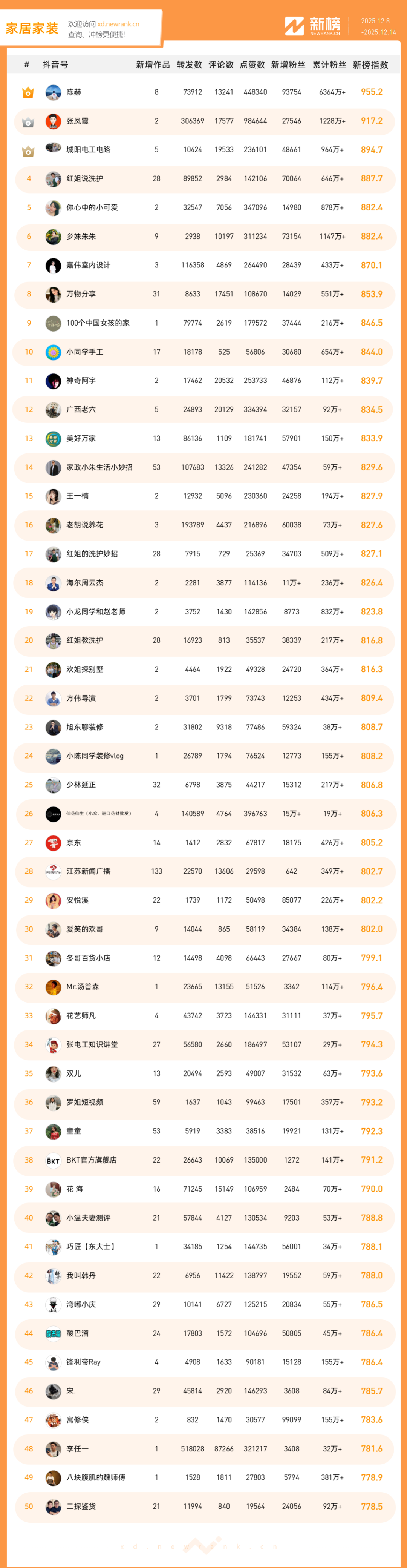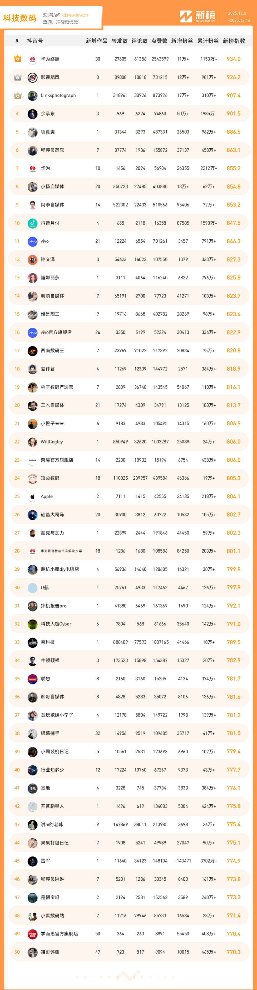 「抖音影响力排行榜」由新榜独家发布,每周一期,本期统计周期为2025年12月8日-2025年12月14日。想了解更多,请移步新抖——新榜全新推出的抖音全场景AI数据工具 xd.newrank.cn。提供实时热门素材、热门商品、带货力分析、抖音号搜索,抖音号排行榜等免费数据服务,后续增值服务持续开放。用以排名的“新榜指数”算法由新榜独立生成,抖音榜单的新榜指数共涉及粉丝数、粉丝增量、分享数、评论数以及点赞数等五项数据指标,其中粉丝数指标衡量人气表现,其余4项指标衡量作品表现。具体算法说明请参考“算法描述”。