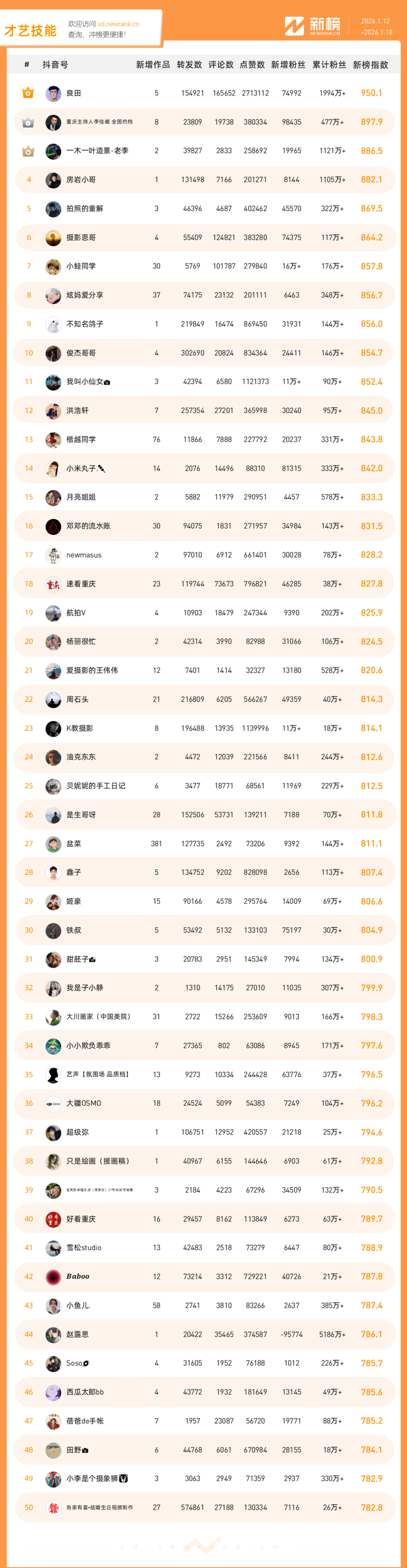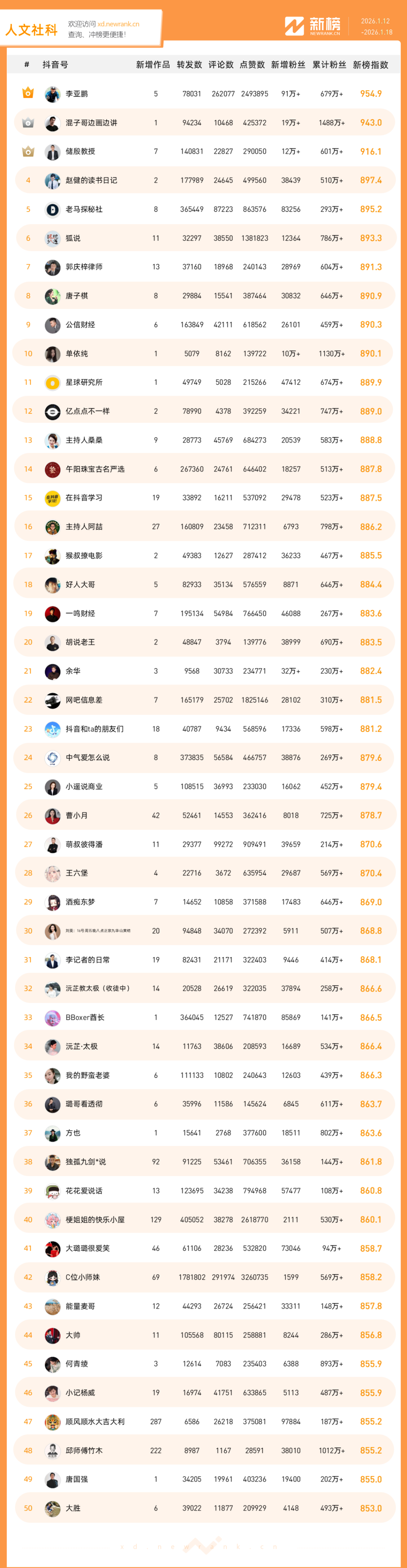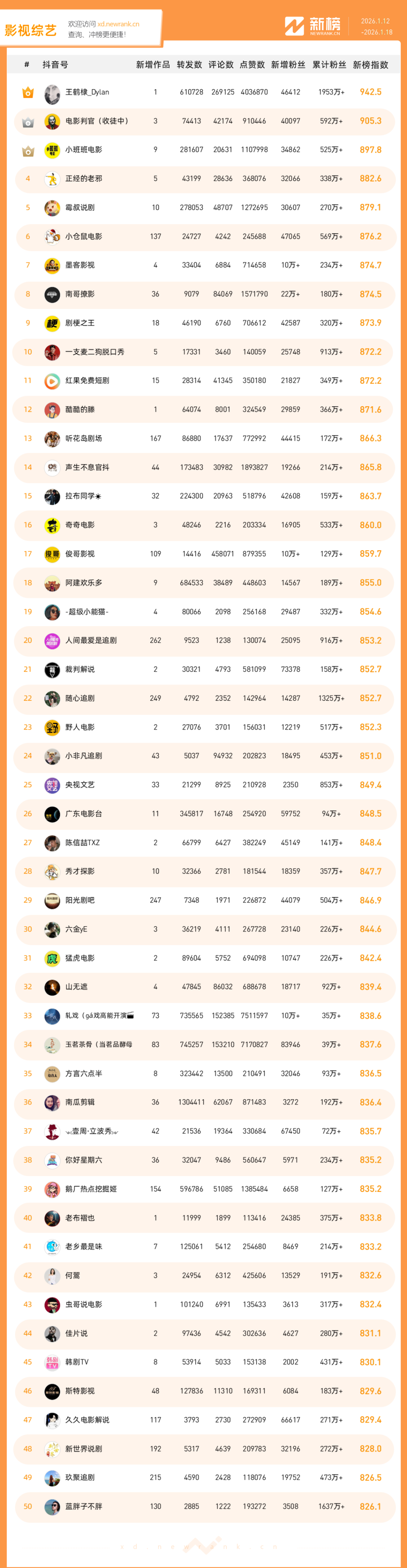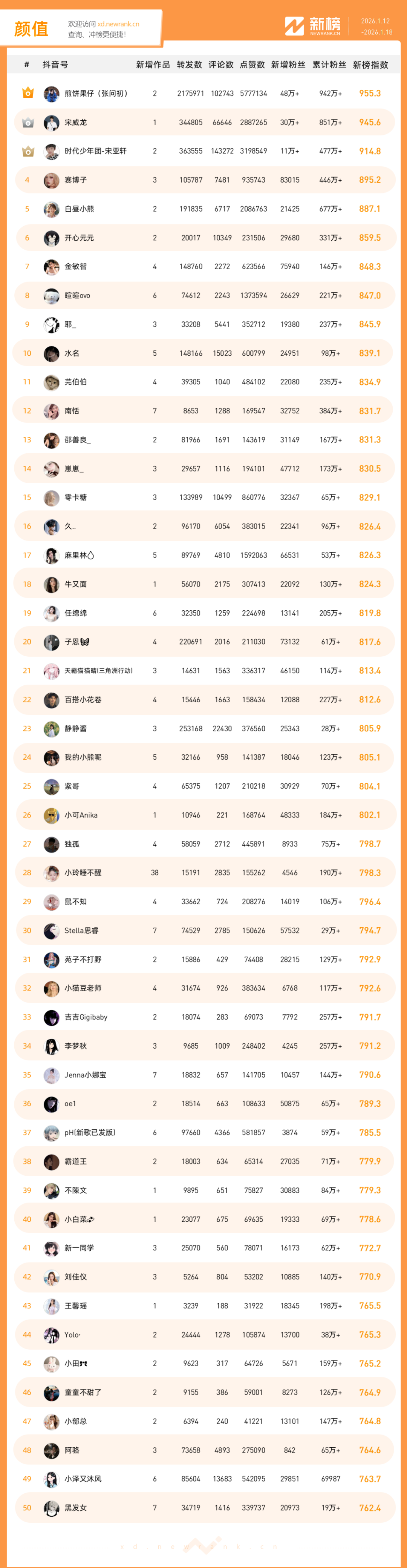 「抖音影响力排行榜」由新榜独家发布,每周一期,本期统计周期为2026年1月12日-2026年1月18日。想了解更多,请移步新抖——新榜全新推出的抖音全场景AI数据工具 xd.newrank.cn。提供实时热门素材、热门商品、带货力分析、抖音号搜索,抖音号排行榜等免费数据服务,后续增值服务持续开放。用以排名的“新榜指数”算法由新榜独立生成,抖音榜单的新榜指数共涉及粉丝数、粉丝增量、分享数、评论数以及点赞数等五项数据指标,其中粉丝数指标衡量人气表现,其余4项指标衡量作品表现。具体算法说明请参考“算法描述”。