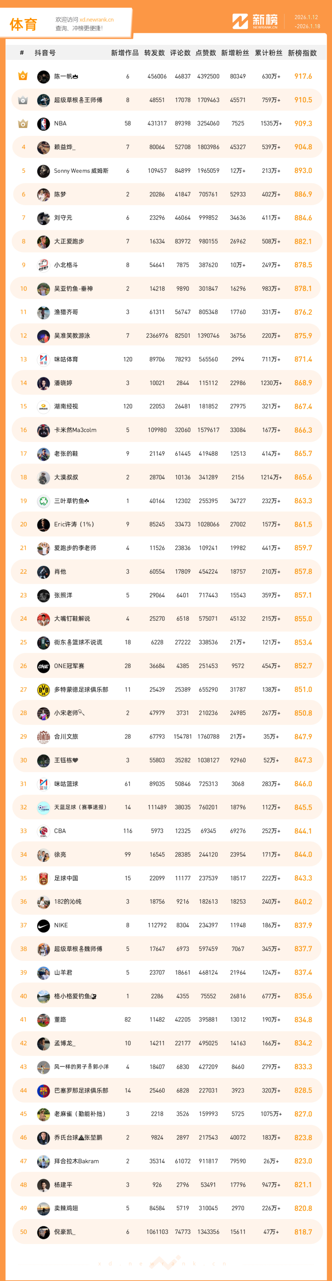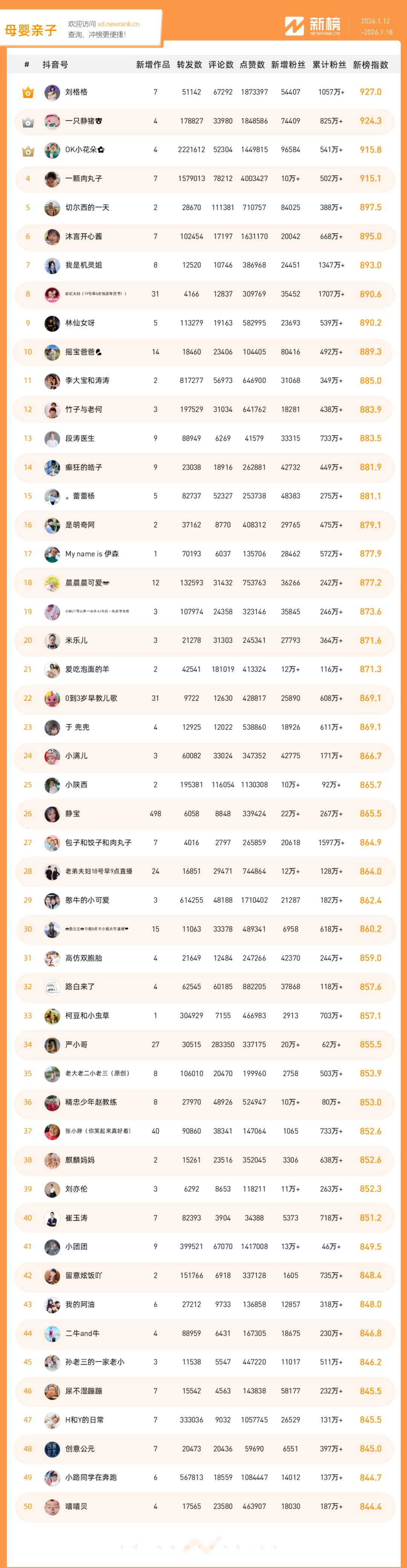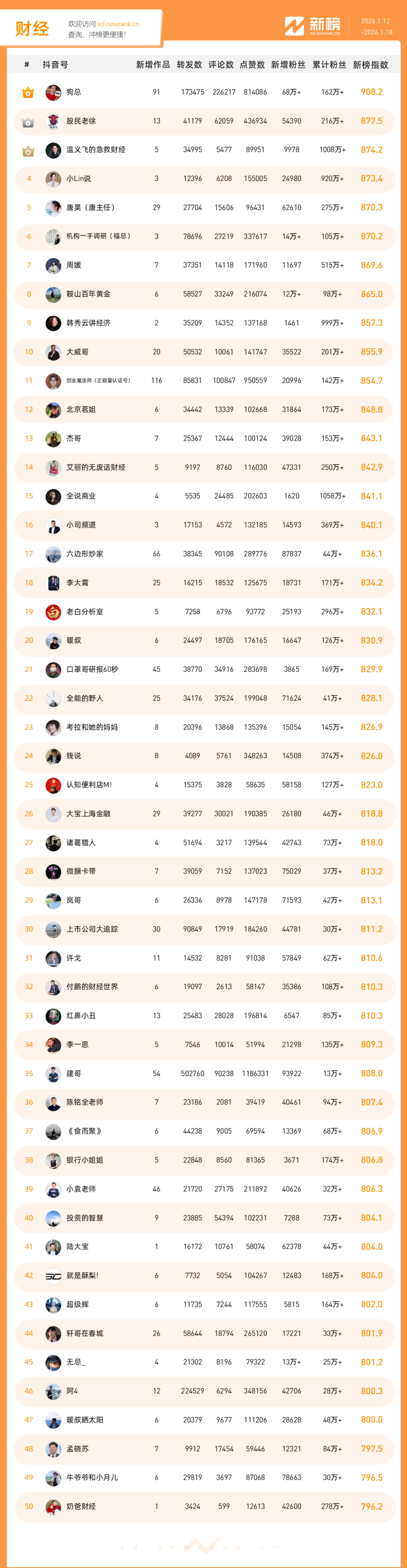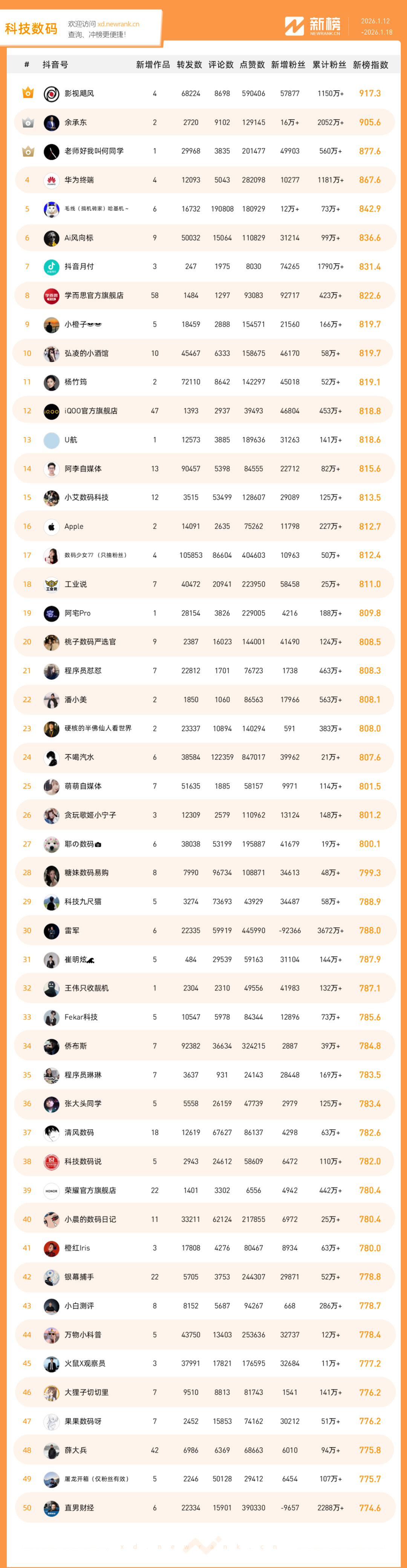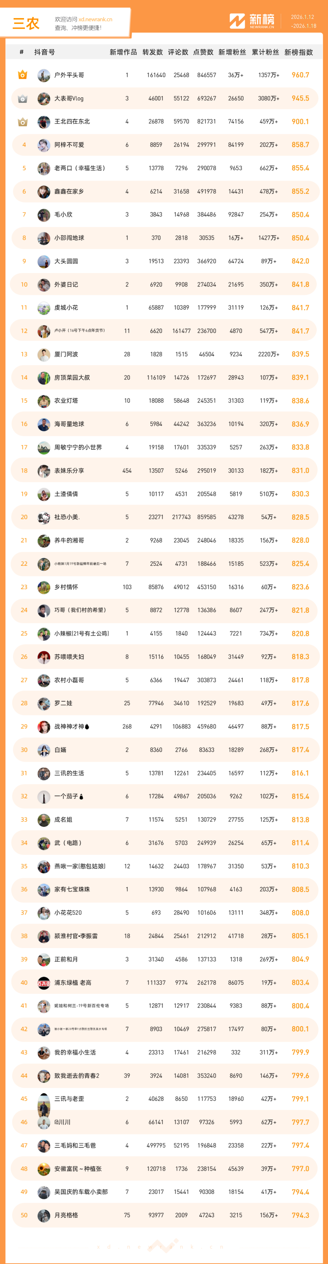 「抖音影响力排行榜」由新榜独家发布,每周一期,本期统计周期为2026年1月12日-2026年1月18日。想了解更多,请移步新抖——新榜全新推出的抖音全场景AI数据工具 xd.newrank.cn。提供实时热门素材、热门商品、带货力分析、抖音号搜索,抖音号排行榜等免费数据服务,后续增值服务持续开放。用以排名的“新榜指数”算法由新榜独立生成,抖音榜单的新榜指数共涉及粉丝数、粉丝增量、分享数、评论数以及点赞数等五项数据指标,其中粉丝数指标衡量人气表现,其余4项指标衡量作品表现。具体算法说明请参考“算法描述”。