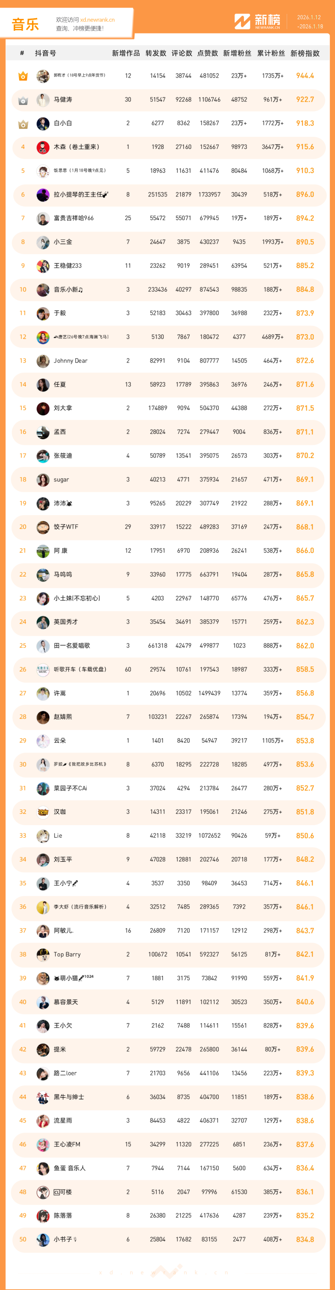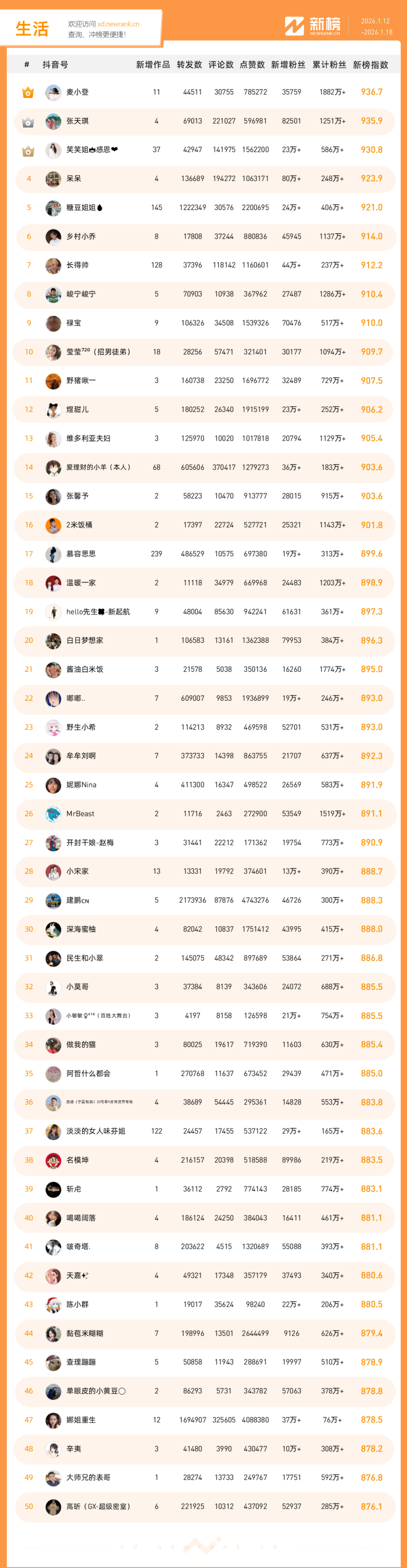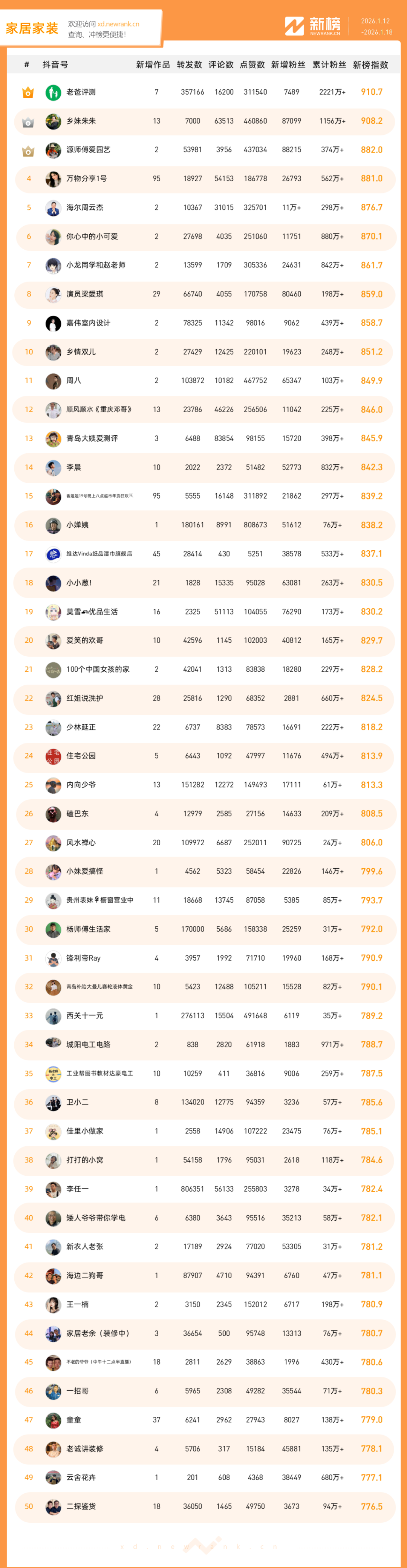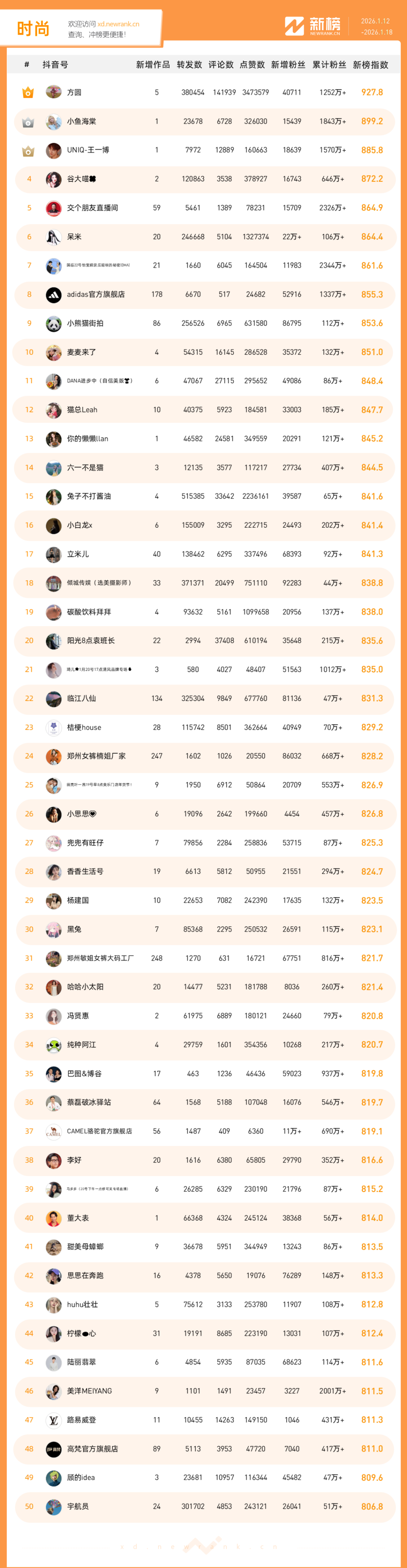 「抖音影响力排行榜」由新榜独家发布,每周一期,本期统计周期为2026年1月12日-2026年1月18日。想了解更多,请移步新抖——新榜全新推出的抖音全场景AI数据工具 xd.newrank.cn。提供实时热门素材、热门商品、带货力分析、抖音号搜索,抖音号排行榜等免费数据服务,后续增值服务持续开放。用以排名的“新榜指数”算法由新榜独立生成,抖音榜单的新榜指数共涉及粉丝数、粉丝增量、分享数、评论数以及点赞数等五项数据指标,其中粉丝数指标衡量人气表现,其余4项指标衡量作品表现。具体算法说明请参考“算法描述”。