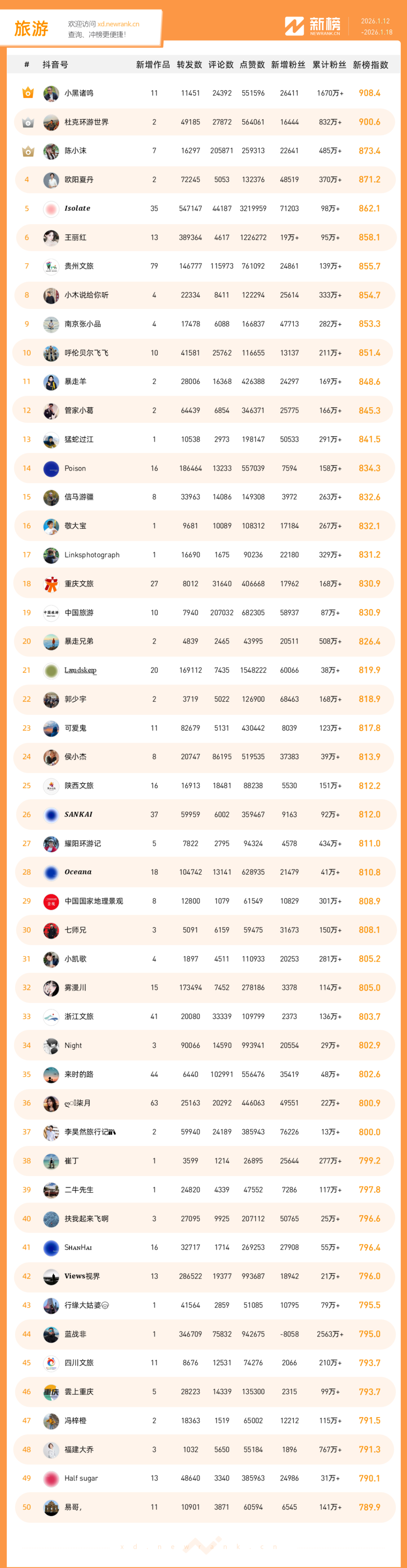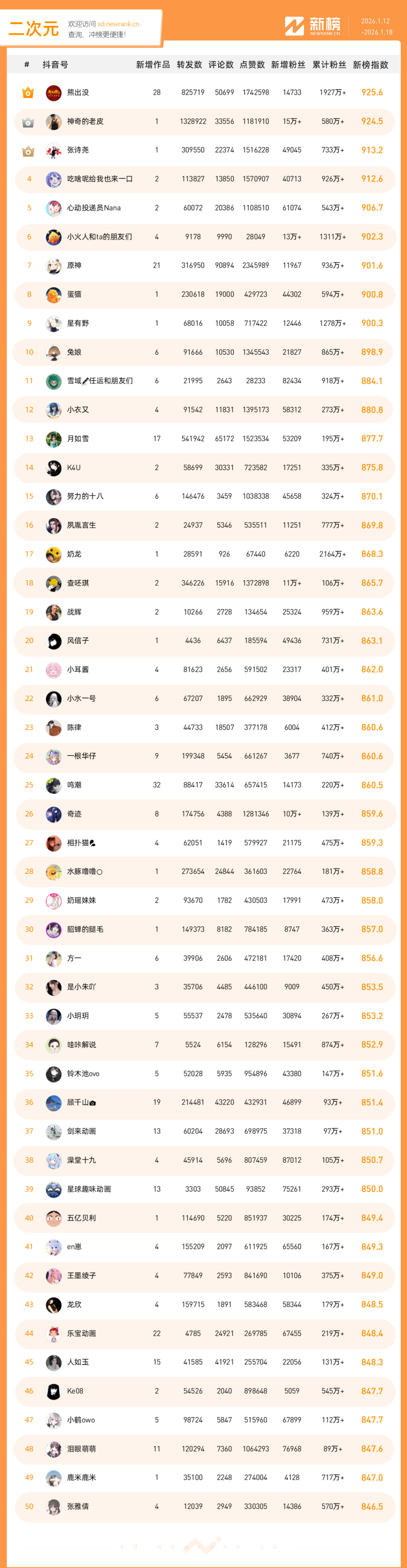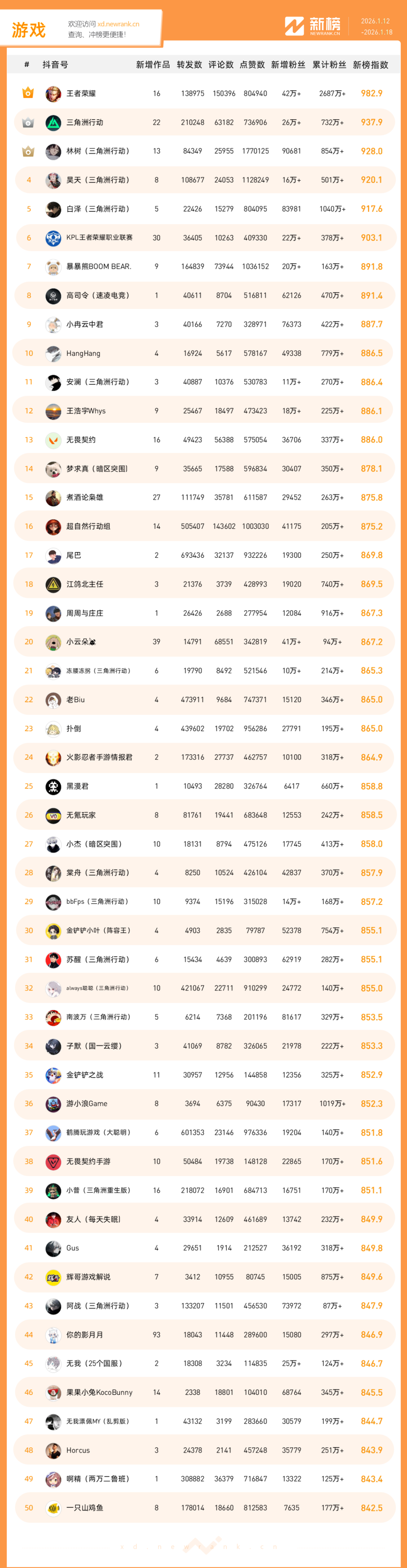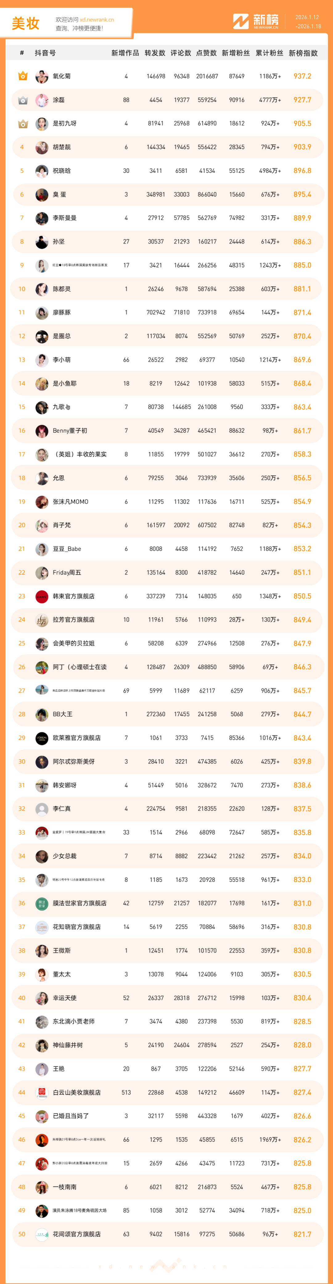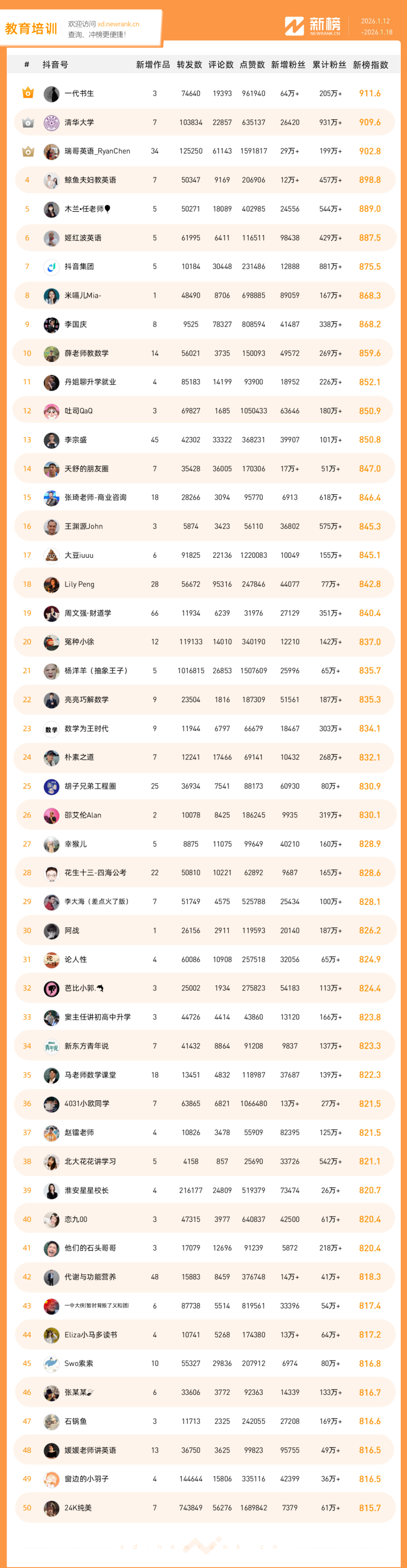 「抖音影响力排行榜」由新榜独家发布,每周一期,本期统计周期为2026年1月12日-2026年1月18日。想了解更多,请移步新抖——新榜全新推出的抖音全场景AI数据工具 xd.newrank.cn。提供实时热门素材、热门商品、带货力分析、抖音号搜索,抖音号排行榜等免费数据服务,后续增值服务持续开放。用以排名的“新榜指数”算法由新榜独立生成,抖音榜单的新榜指数共涉及粉丝数、粉丝增量、分享数、评论数以及点赞数等五项数据指标,其中粉丝数指标衡量人气表现,其余4项指标衡量作品表现。具体算法说明请参考“算法描述”。