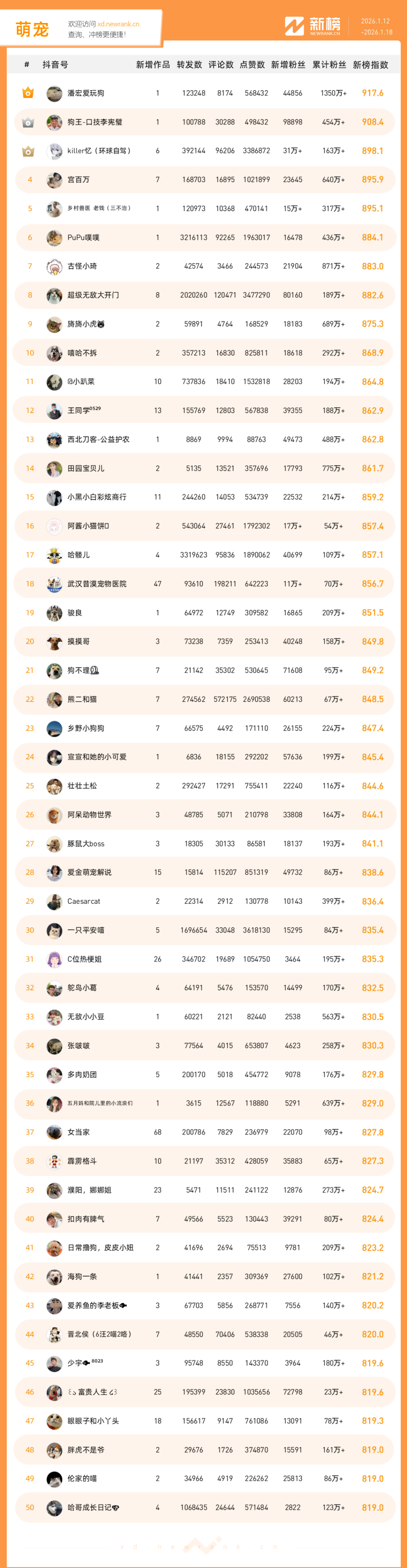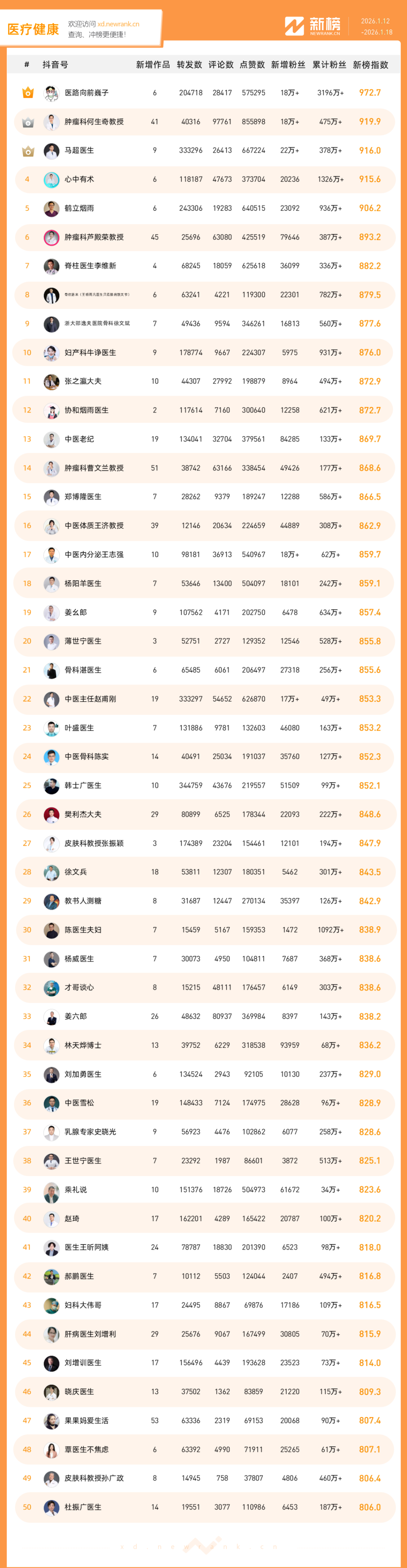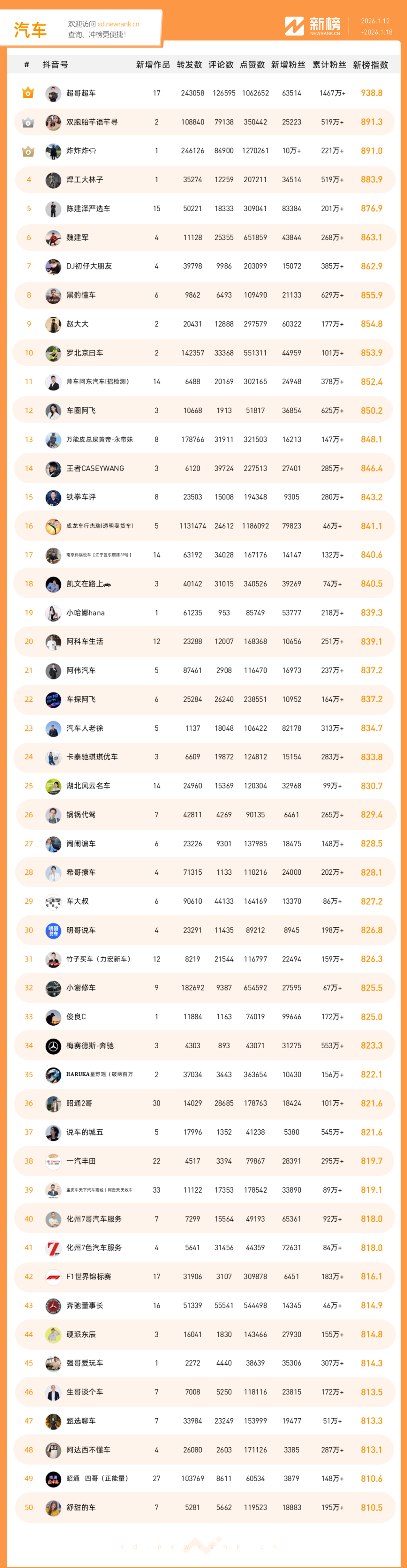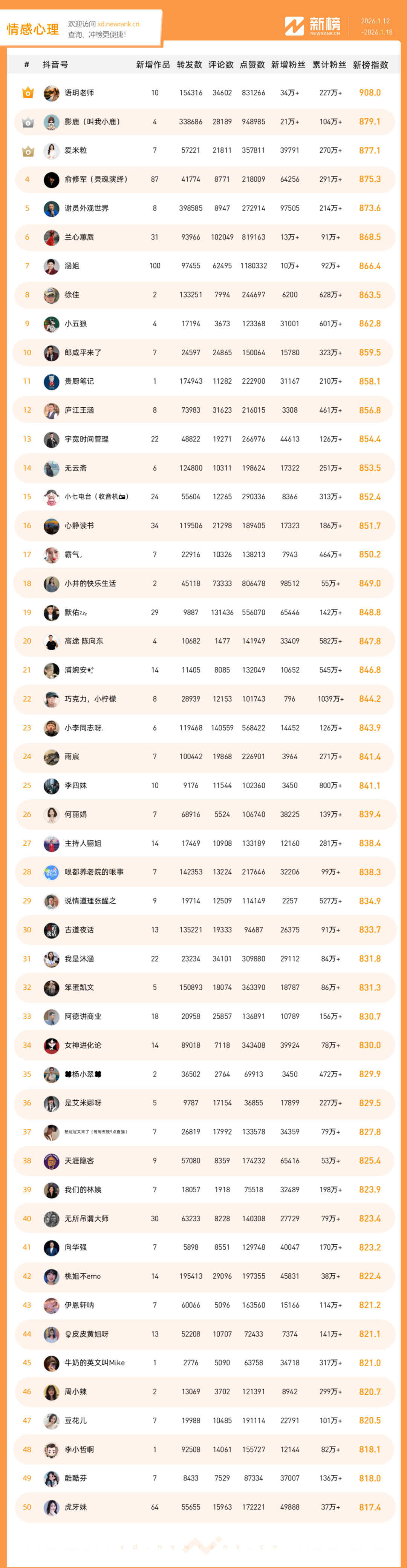 「抖音影响力排行榜」由新榜独家发布,每周一期,本期统计周期为2026年1月12日-2026年1月18日。想了解更多,请移步新抖——新榜全新推出的抖音全场景AI数据工具 xd.newrank.cn。提供实时热门素材、热门商品、带货力分析、抖音号搜索,抖音号排行榜等免费数据服务,后续增值服务持续开放。用以排名的“新榜指数”算法由新榜独立生成,抖音榜单的新榜指数共涉及粉丝数、粉丝增量、分享数、评论数以及点赞数等五项数据指标,其中粉丝数指标衡量人气表现,其余4项指标衡量作品表现。具体算法说明请参考“算法描述”。