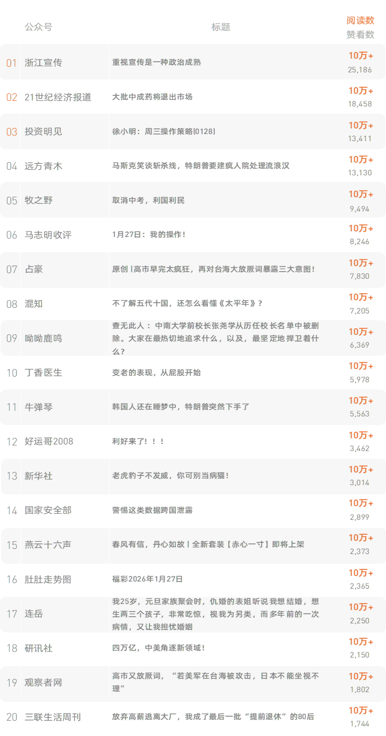 跳转原文请戳:《取消中考,利国利民》新榜榜单小程序版正式上线,榜单想看就看,更多热门内容也可登录新榜网站www.newrank.cn进行查询,点击「阅读原文」查看新榜指数算法说明。新榜排行榜newranklist
