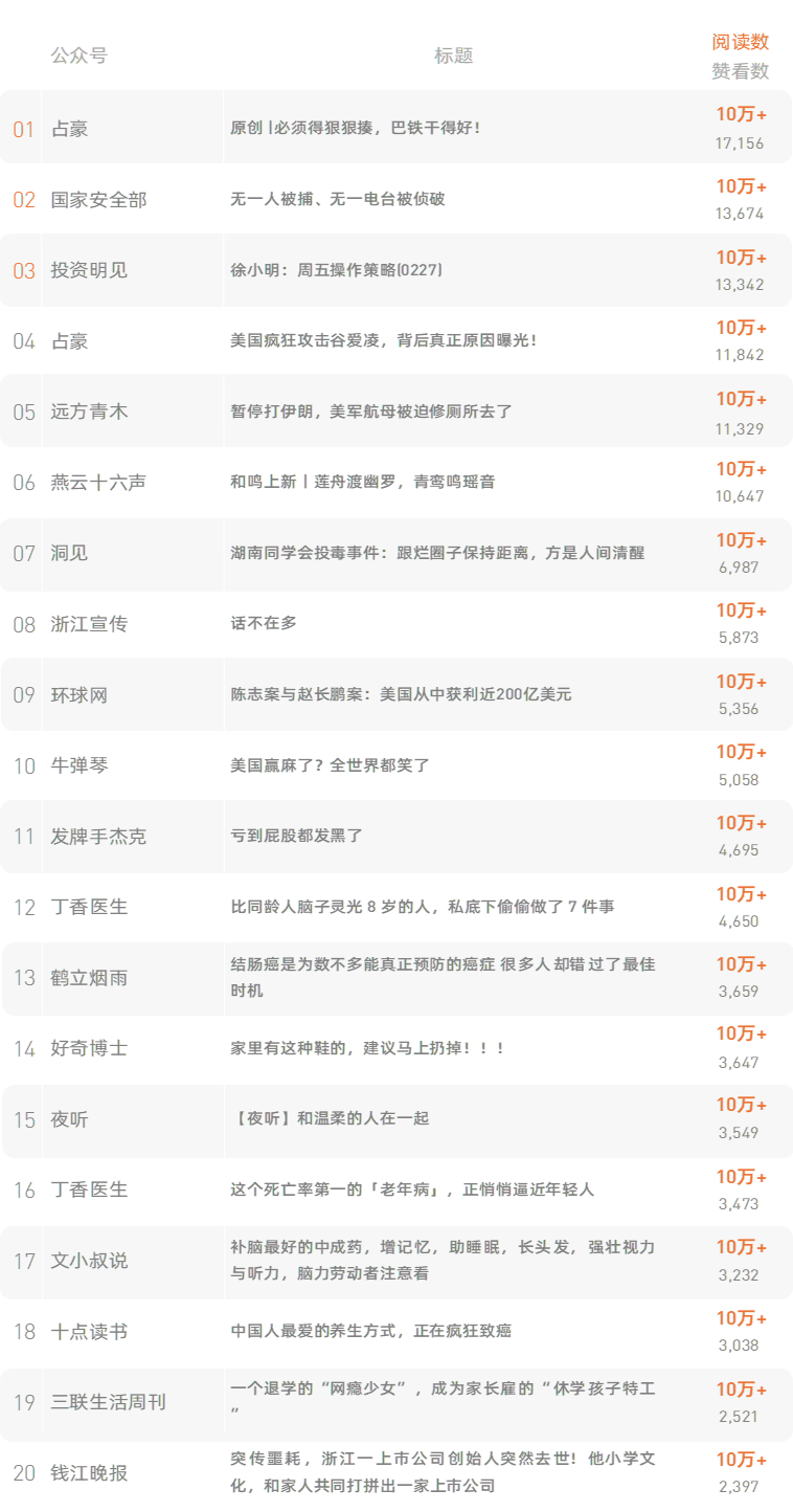 跳转原文请戳:《家里有这种鞋的,建议马上扔掉!!!》新榜榜单小程序版正式上线,榜单想看就看,更多热门内容也可登录新榜网站www.newrank.cn进行查询,点击「阅读原文」查看新榜指数算法说明。新榜排行榜newranklist