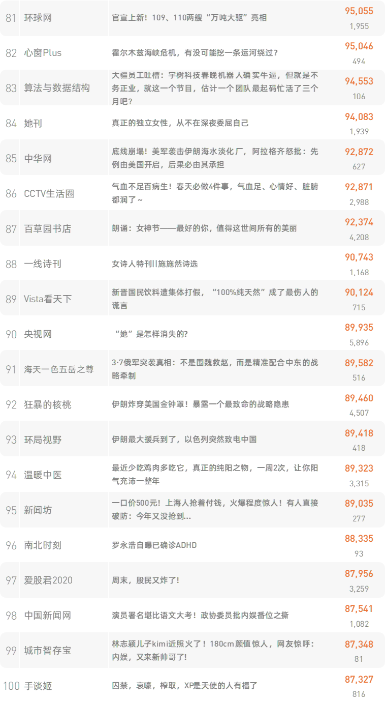 跳转原文请戳:《长期和打呼噜的人一起睡觉,对身体有什么影响?》新榜榜单小程序版正式上线,榜单想看就看,更多热门内容也可登录新榜网站www.newrank.cn进行查询,点击「阅读原文」查看新榜指数算法说明。新榜排行榜newranklist