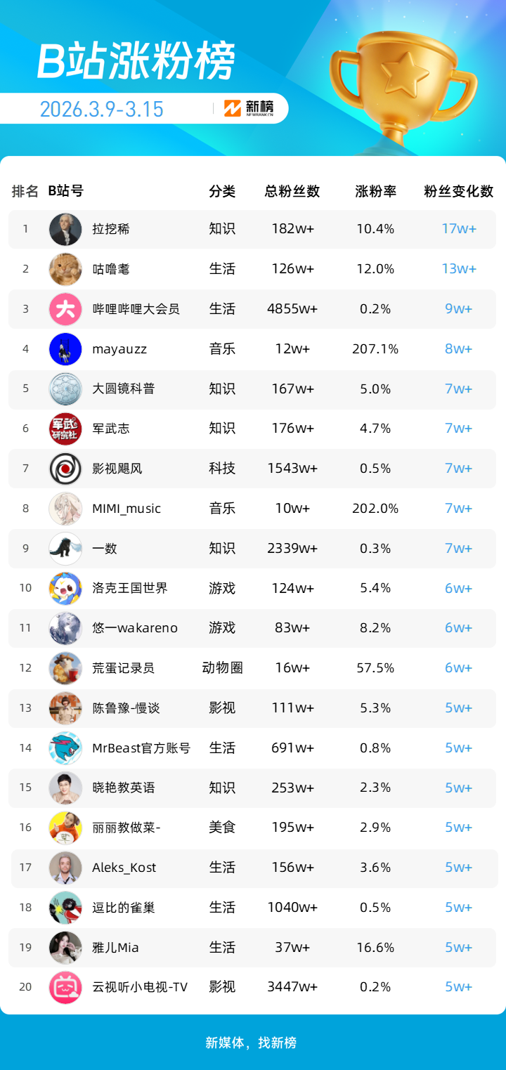 依托新榜数据,新榜推出「B站涨粉榜」,本次统计周期为2026年3月9日到2026年3月15日。