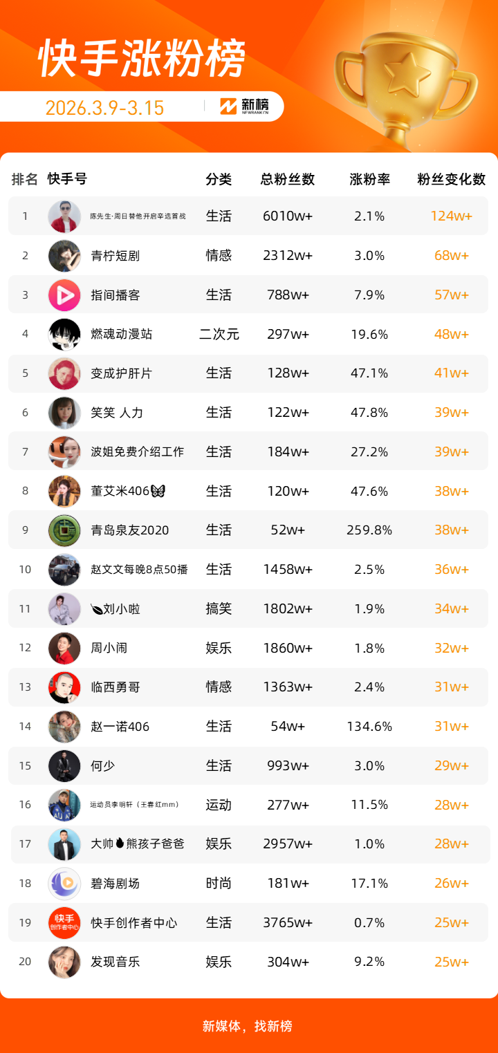 依托新榜数据工具,新榜推出「快手涨粉榜」,本次统计周期为2026年3月9日到2026年3月15日。