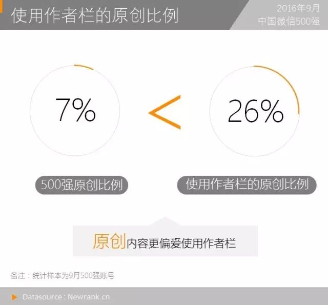 据统计,500强账号群体的原创比例约为7%,即100篇内容中有7篇为原创。而对使用作者栏的27991篇内容进行统计发现,其原创比例高达26%,即100篇内容中有26篇为原创,约为500强账号群体的4倍。这说明原创内容更偏爱使用作者栏。