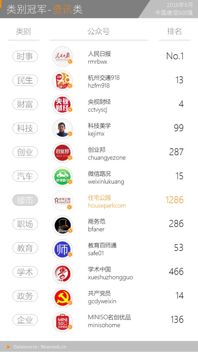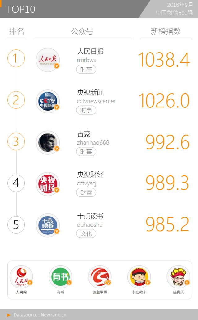 请移步"新榜排行榜"(xdnphb),查看2016年9月份中国微信500强详细榜单。