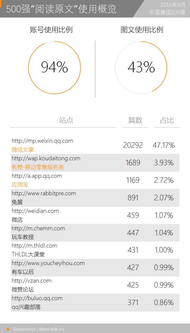 9月有468个账号在43020篇图文中添加阅读原文链接,其中近半数内容链接至微信图文。有赞商城和应用宝是阅读原文处最常添加的两类链接。
