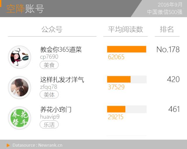 9月空降账号分别为美食类“教会你365道菜”,美体类“这样扎发才洋气”和乐活类“养花小窍门”。三名空降兵不约而同隶属于轻松类泛阅读账号。