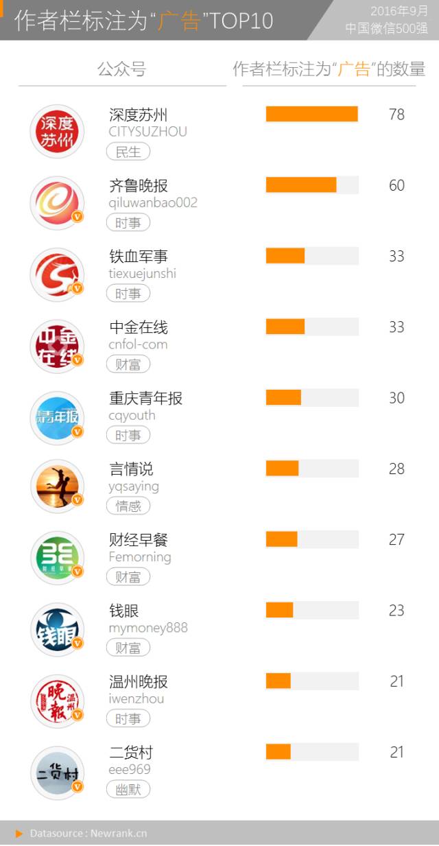 新榜试图找出哪些账号会利用作者栏标识正文内容为广告。统计发下,民生类“深度苏州”、时事类“齐鲁晚报”和“铁血军事”最常将作者栏用于内容提示。