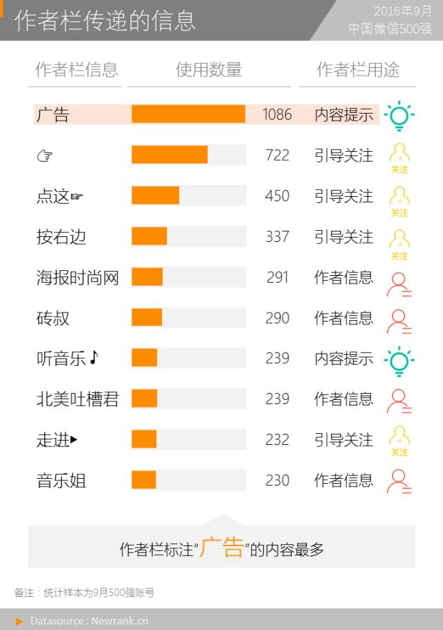 新榜发现,“广告”是出现在作者栏频率最高的词汇,作为标明正文内容为广告的提示。这或许也可以解读为《互联网广告管理暂行办法》中规定显著表明广告的对策之一。作者栏频率出现次数次多的为图标