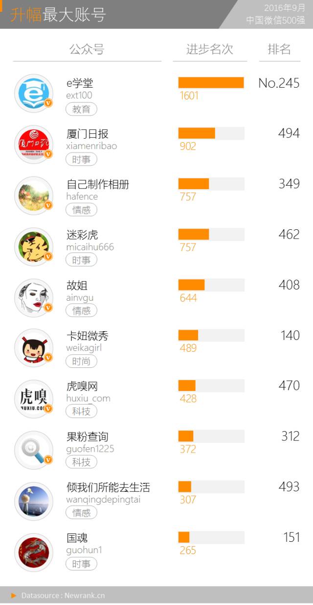 9月间,“人民日报”平均单篇阅读上升,成为全“100000+”新晋成员。“e学堂”深耕小学生教育问题,上升1601名。