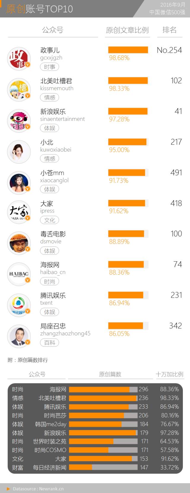 “政事儿”维持上月原创比例,以98.86%获得原创冠军。“北美吐槽君”和“新浪娱乐”分别以98.33%和97.28%居于次首位。原创十强中换员3席,“腾讯NBA”、“时尚芭莎”和“三联生活周刊”让位于电竞类账号“小苍mm”、影评类账号“毒舌电影”和军事解析类账号“局座召忠”。十强整体原创比例环比有所下降,十强门槛回落至86.1%。