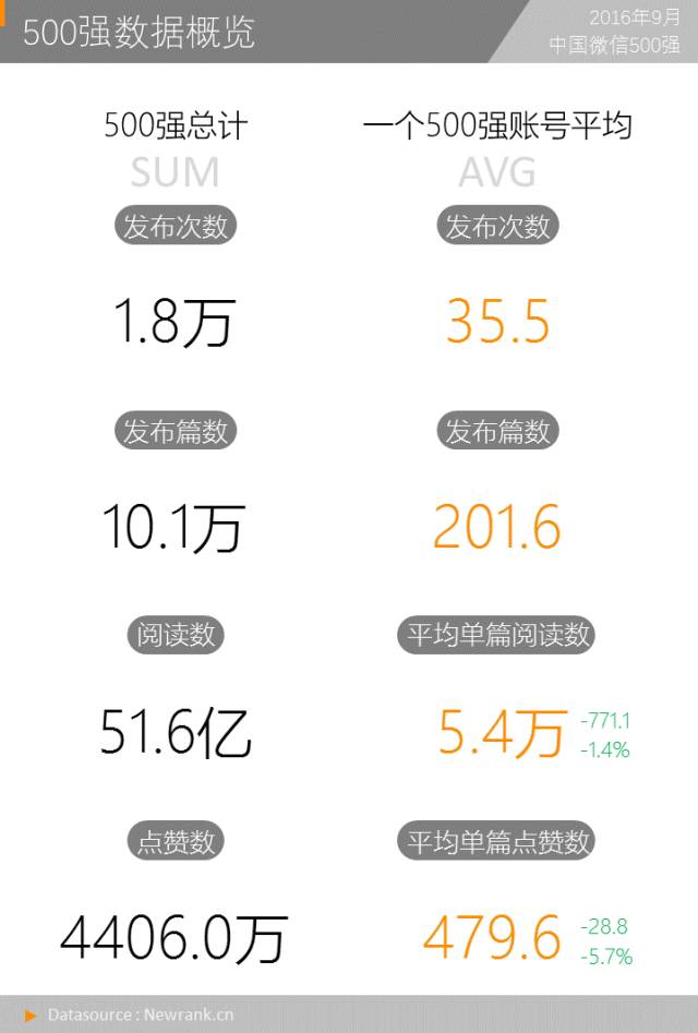 1. 作为中国移动互联网内容价值标准构筑者,新榜坚信,没有内容分类的排行榜是没有比照意义的,是缺乏对内容价值深入理解能力的表现。因此,在需要打破内容类别、实施跨界对比的月榜中,新榜特意引入类别权重(具体系数可在新榜网站newrank.cn上查询),尽可能呈现一个符合社会主流价值的中国微信500强生态面貌。