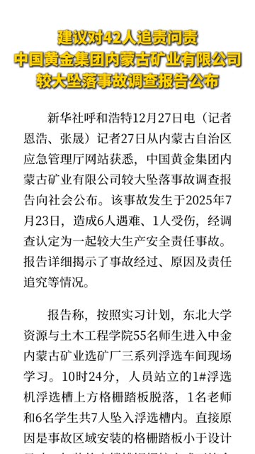 ![]() ![]() 12月27日,中国黄金集团内蒙古矿业有限公司#6名大学生坠落事故调查结果公布:建议对42人追责问责。 四川观察 发布时间2025/12/27 03:24:26 | 2728 | 1.1w | 3413 | 4.1w | 更多 |