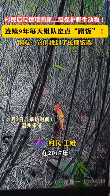 ![]() ![]() 国家二级保护野生动物连续9年组团来“蹭饭”?温州村民后院每天准时开饭,监控拍下双向奔赴画面!(供稿:乐清融媒) ![]() 美丽浙江 发布时间2026/01/09 08:41:55 | 202 | 84 | 269 | 4.6w | 更多 |