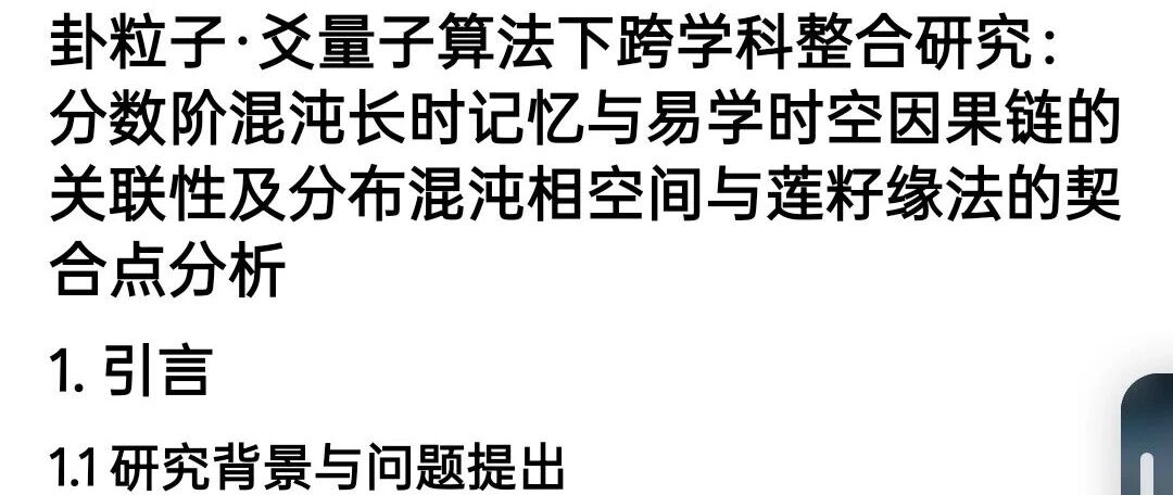 ![]() 卦粒子·爻量子算法下跨学科整合研究:分数阶混沌长时记忆与易学时空因果链的关联性及分布混沌相空间与莲籽缘法的契合点分析 逐道易人 发布时间2026/01/07 21:33:59 | - | - | - | 2 | 更多 |