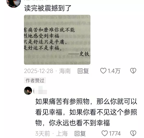 ![]() 苦难的作家创造文学 幸福的读者泪流满面. #书籍 #分享 #告别2025 #苘羽 ![]() 苘羽 发布时间2026/01/02 03:13:19 | 272 | 931 | 6588 | 2.6w | 更多 |