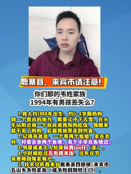 ![]() ![]() 寻柳州鹿寨或来宾韦姓亲人 鹿寨县四排镇、来宾市五山乡哪个村委在两个鱼塘边?#宝贝回家 #鹿寨 #来宾 #dou来寻人 #好事成真 @宝贝回家 @蓝月 @余晖 宝贝回家-余生 发布时间2026/01/12 22:26:00 | 1305 | 126 | 511 | 3397 | 更多 |