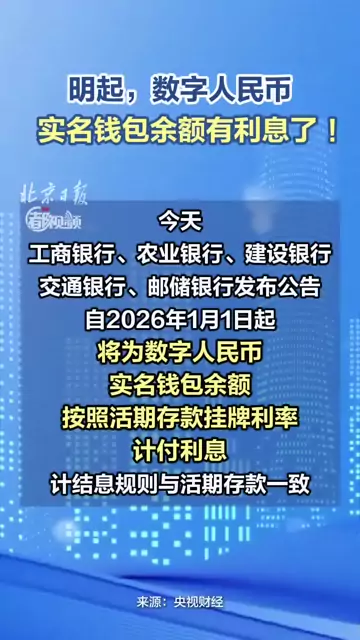 ![]() ![]() 【 #明起数字人民币实名钱包余额计息 】今天,工商银行、农业银行、建设银行、交通银行、邮储银行发布公告,自2026年1月1日起,将为数字人民币实名钱包余额按照活期存款挂牌利率计付利息,计结息规则与活期存款一致。此外,建设银行公告不含四类钱包;交通银行发布的公告称,如客户开立的数字人民币钱包为四类个人钱包,则钱包内的余额不计付利息。 #数字人民币实名钱包余额有利息了 #数字人民币 (来源:央视财经) ![]() 北京日报 发布时间2025/12/31 08:01:55 | 356 | 591 | 971 | 1w | 更多 |