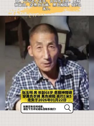![]() ![]() 请向湖北省荆门市京山市孙桥镇附近扩散,六旬老人走失,名叫张玉明,患精神障碍,穿黑色衣裤、黑色棉鞋,高约1米5。 此信息由抖音寻人之星志愿者洪成木提供 抖音寻人 发布时间2026/01/24 00:56:47 | 73 | 2 | 18 | 1580 | 更多 |