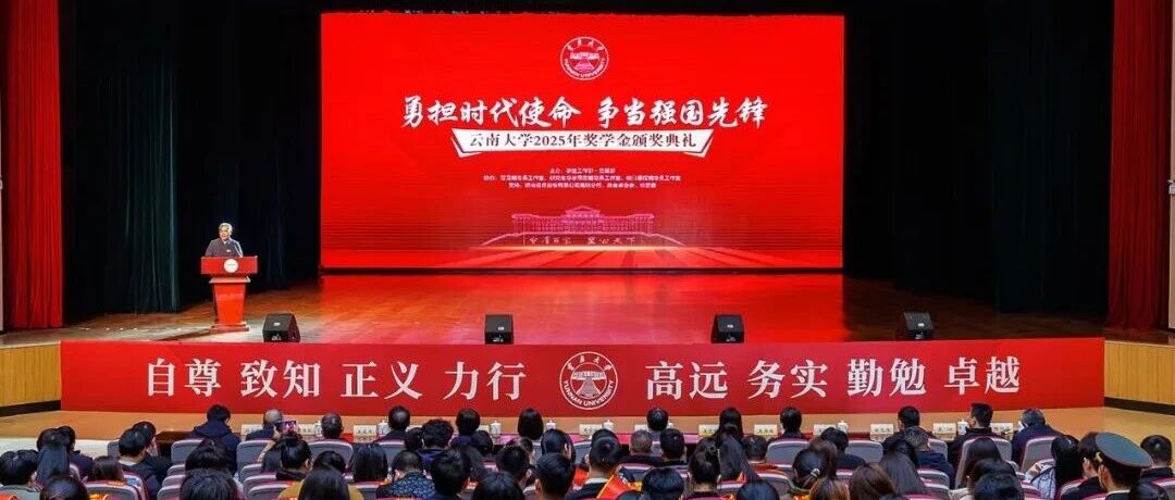 2025年12月29日,云南大学2025年奖学金颁奖典礼在呈贡校区举行。典礼以“勇担时代使命,争当强国先锋”为主题,集中表彰2025年度在学习科研、社会实践、志愿服务、创新创业等方面表现突出的先进集体和个人,激励全体云大学子恪守“会泽百家、至公天下”的办学精神,践行“自尊、致知、正义、力行”的校训,努力成长为担当民族复兴大任的时代新人。