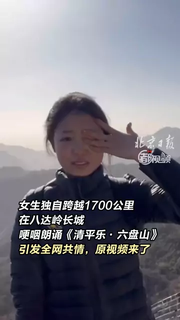 ![]() ![]() 【 #女生在八达岭长城哽咽诵诗引发全网共情 ,原视频来了】 “今日长缨在手,何时缚住苍龙?”2026年元旦前,网名为“羊驼同学(健身版)”的小姑娘独自从湖南来到北京,登上八达岭长城,热泪盈眶地朗诵《清平乐·六盘山》,其间多次哽咽。她将朗诵视频发到网上,截至1月2日12时,视频获赞超过385万。少年意气,叩问山河,众多网友跟评,纷纷为小姑娘点赞。