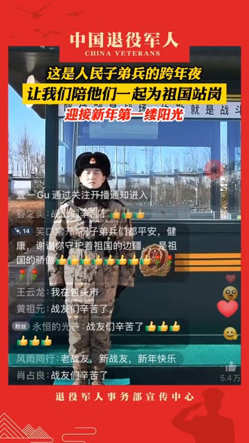 ![]() ![]() 又是一年跨年夜,让我们一起走进直播间,陪伴人民子弟兵一起,为祖国站岗!#跨过2025 #你好2026 #2026军营跨年夜 ![]() 中国退役军人 发布时间2025/12/31 13:19:02 | 995 | 438 | 1220 | 23w | 更多 |