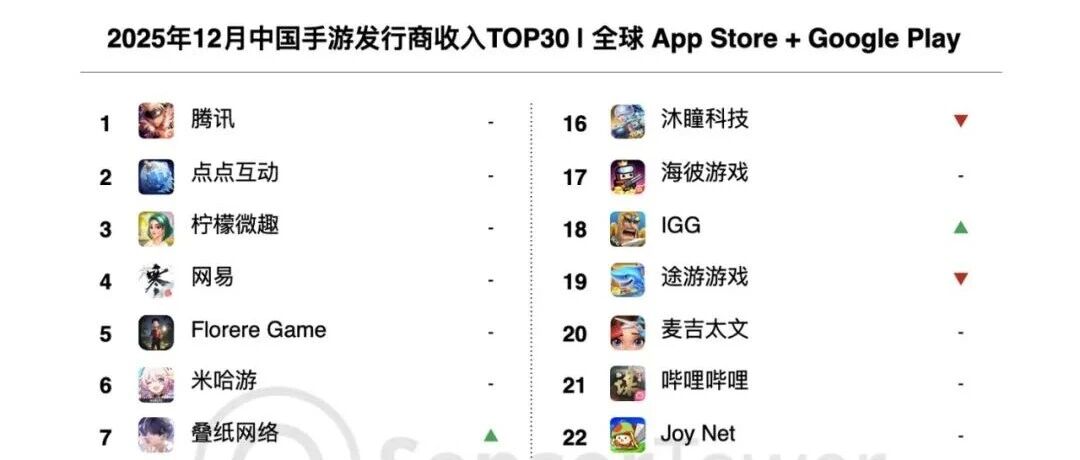 ![]() 2025年12月中国手游发行商全球收入排行榜 SensorTower 发布时间2026/01/06 04:02:16 | - | - | - | 86 | 更多 |