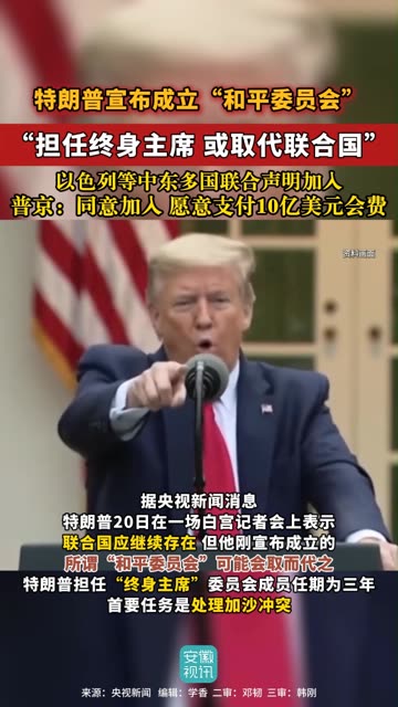 ![]() ![]() 特朗普宣布成立“和平委员会”“担任终身主席 或取代联合国” #特朗普最新动态 #普京最新动态 #联合国 (编辑:学香)据央视新闻消息,特朗普20日在一场白宫记者会上表示,联合国应继续存在,但他刚宣布成立的所谓“和平委员会”可能会取而代之。特朗普担任“终身主席”,委员会成员任期为三年,首要任务是处理加沙冲突。到目前为止特朗普向大约60个国家和国际组织发送了入会邀请函,法国 德国 意大利 匈牙利 澳大利亚 加拿大 欧盟委员会以及中东主要大国的领导人均在受邀之列。普京确认已收到特朗普关于加入所谓“和平委员会”的邀请,并称俄罗斯愿意从在美国被冻结的资产中支付加入“和平委员会”所需的10亿美元。 ![]() 安徽视讯 发布时间2026/01/22 02:52:02 | 1.7w | 3380 | 2.2w | 8.3w | 更多 |
