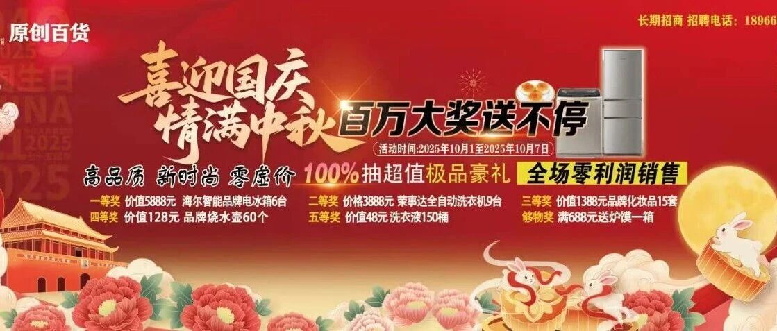 ![]() 国庆中秋双节狂欢!原创百货百万礼品大抽奖,家电豪礼等你拿! 定边原创 发布时间2025/09/27 00:22:29 | - | - | - | 85 |